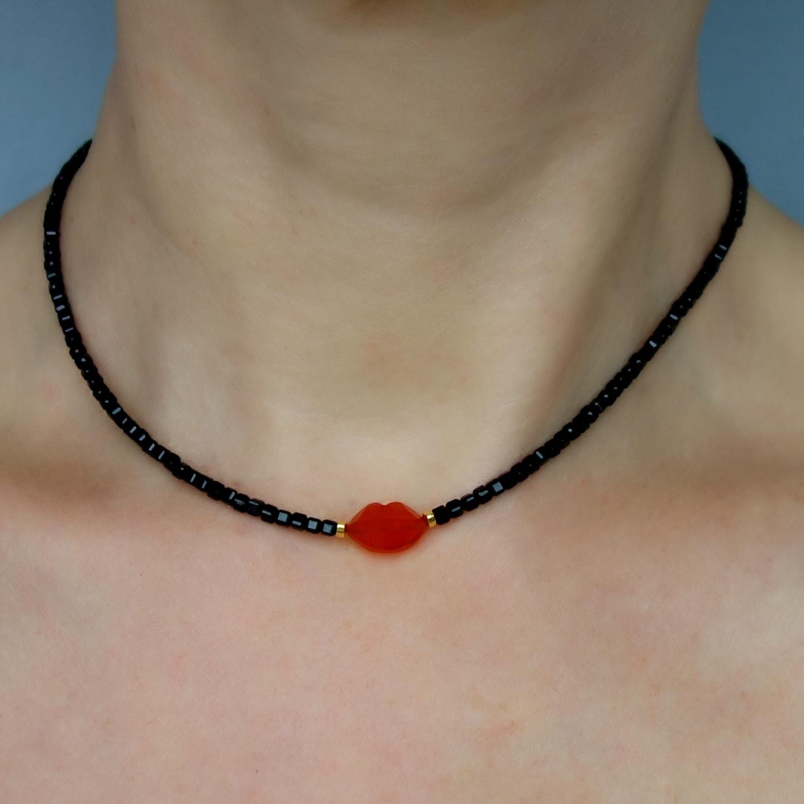 Tiny Black Spinel necklace with carnelian lips. This is an extremely delicate and dainty necklace.