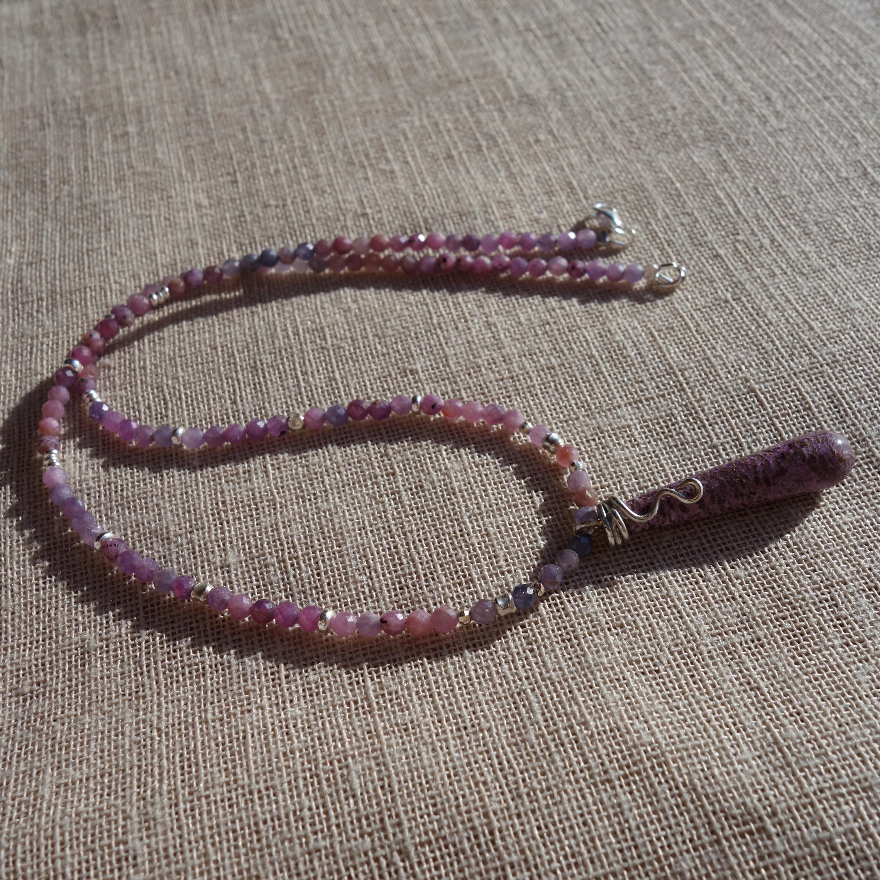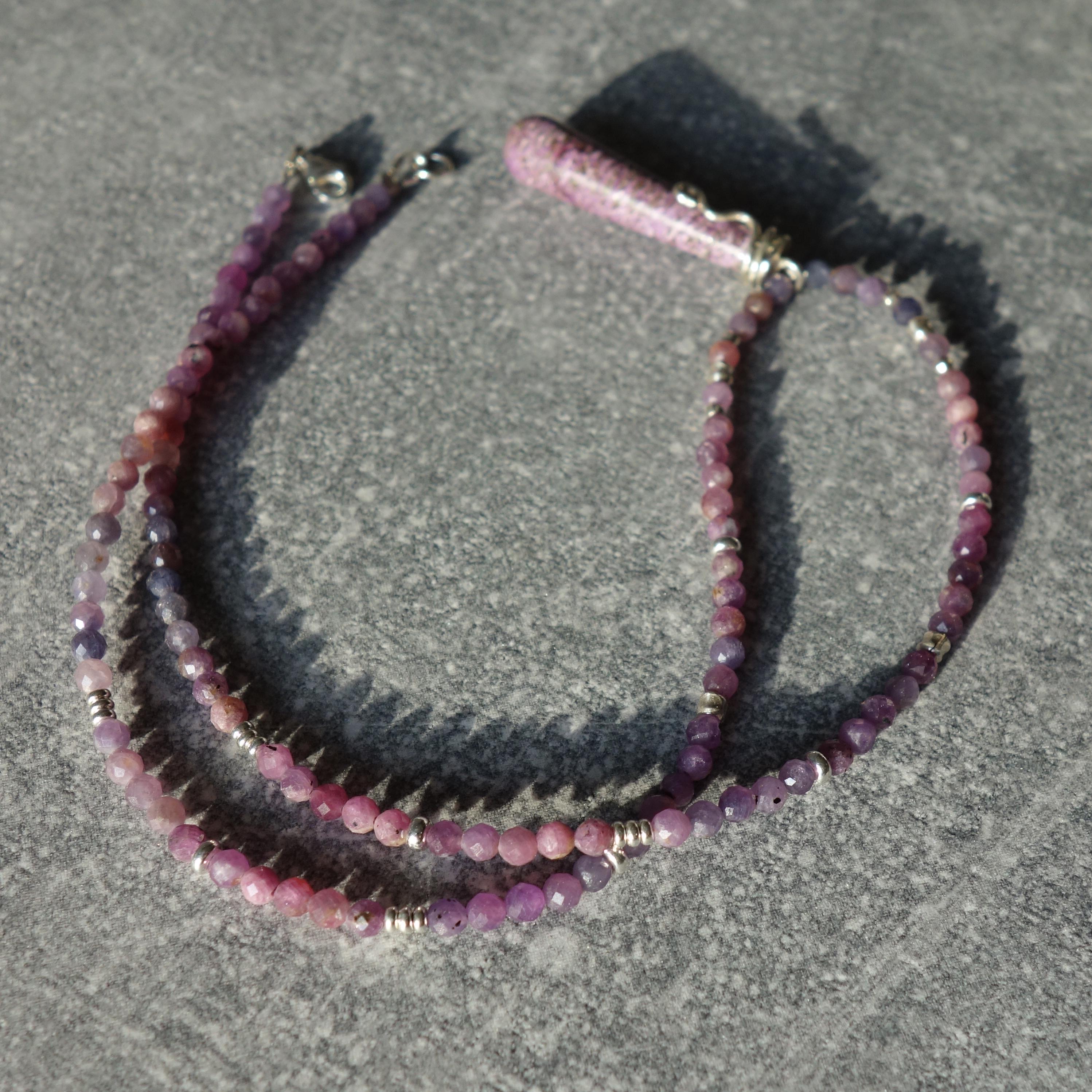Pink sapphire necklace with purple pendant and sterling silver accents.
