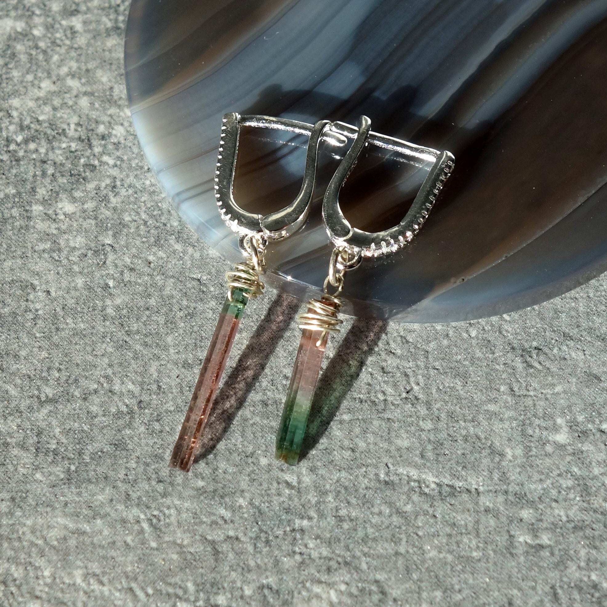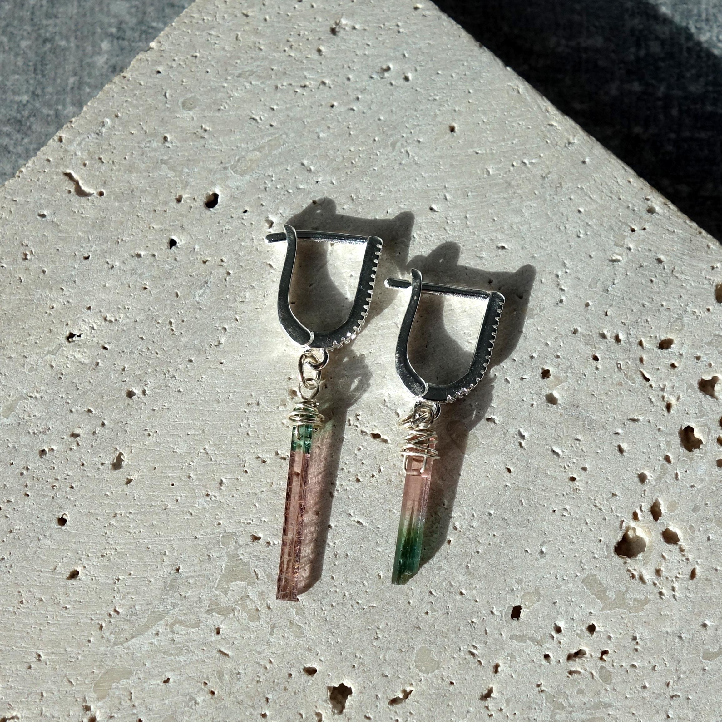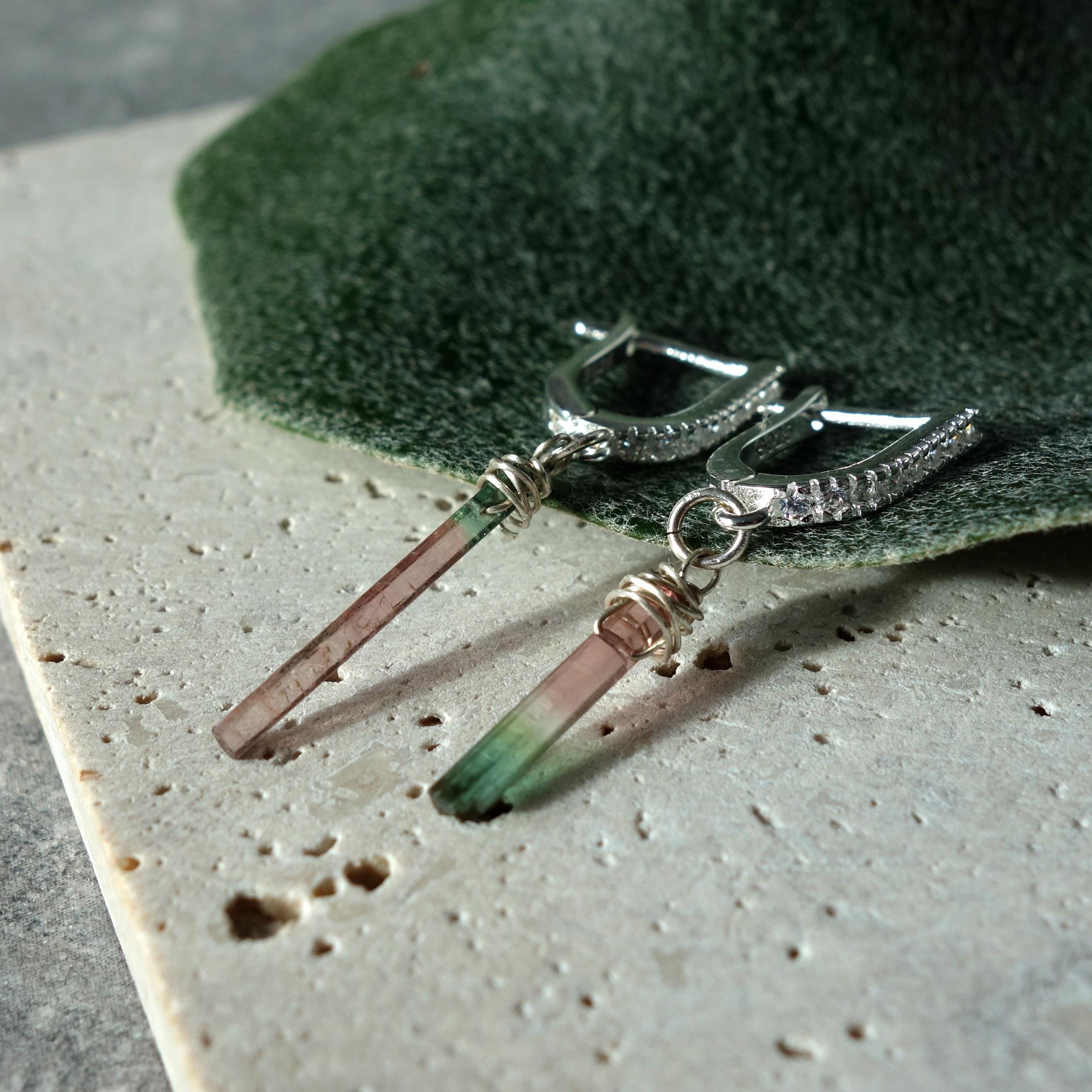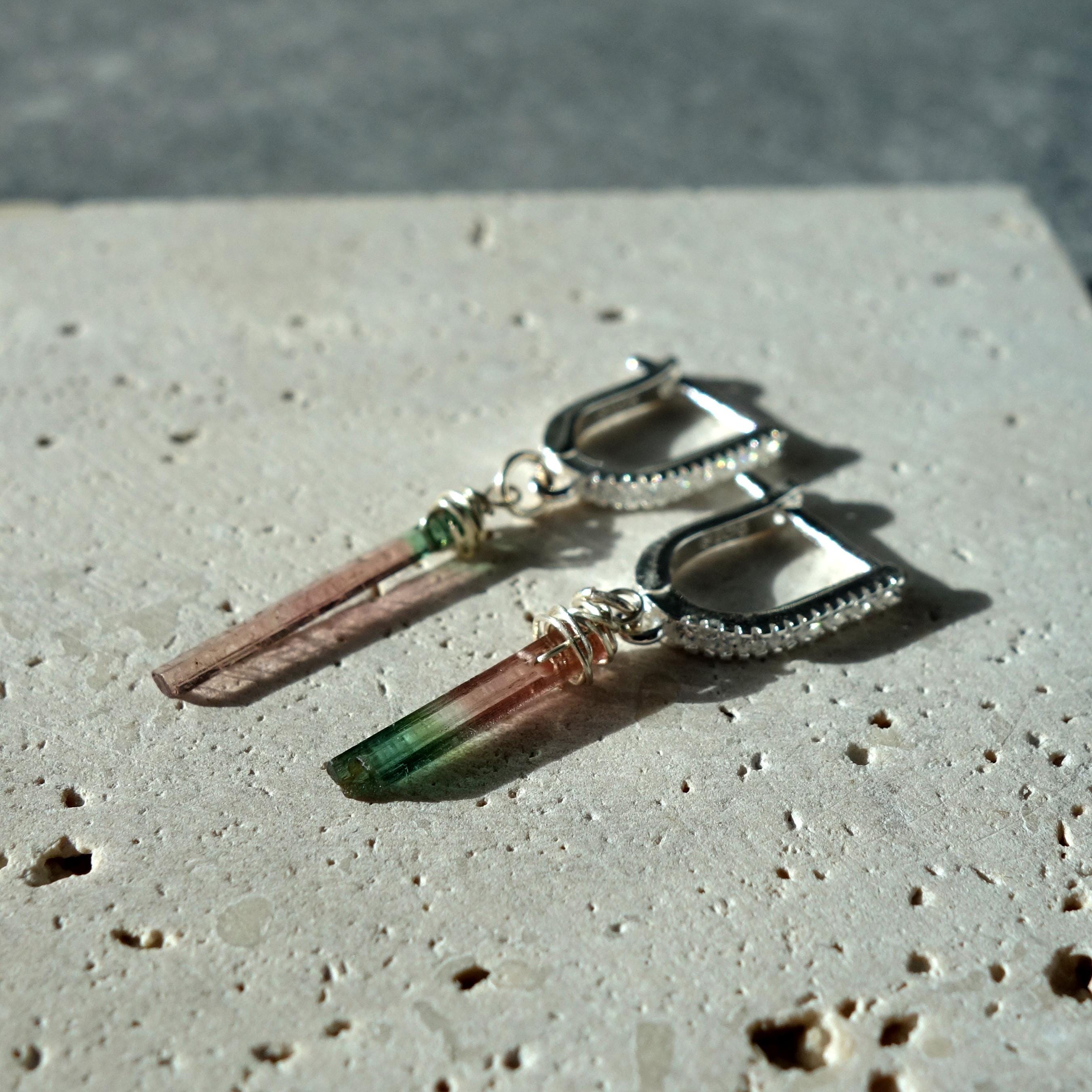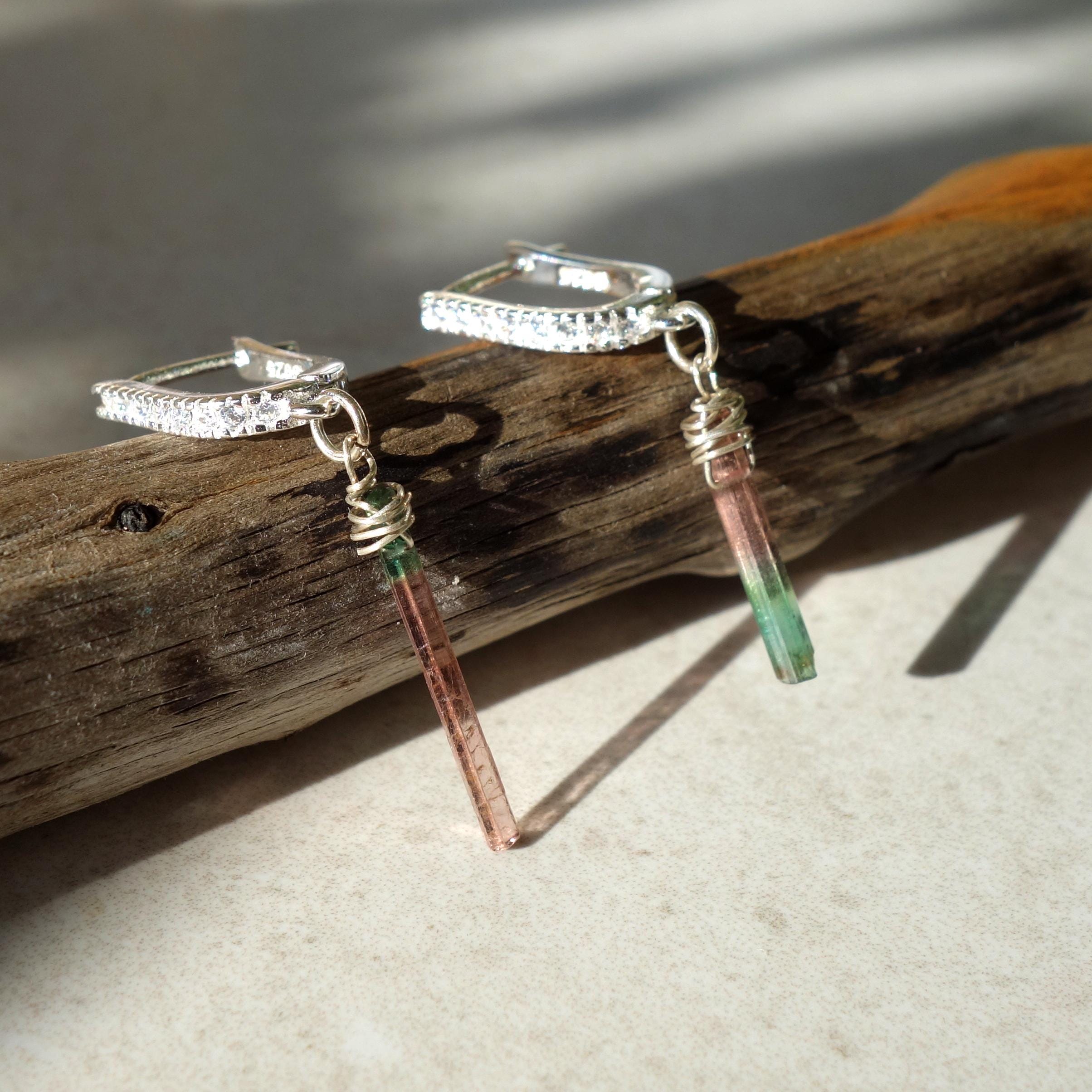These delicate earrings feature raw watermelon tourmaline crystals — each with its own gradient of pink and green, untouched and alive.