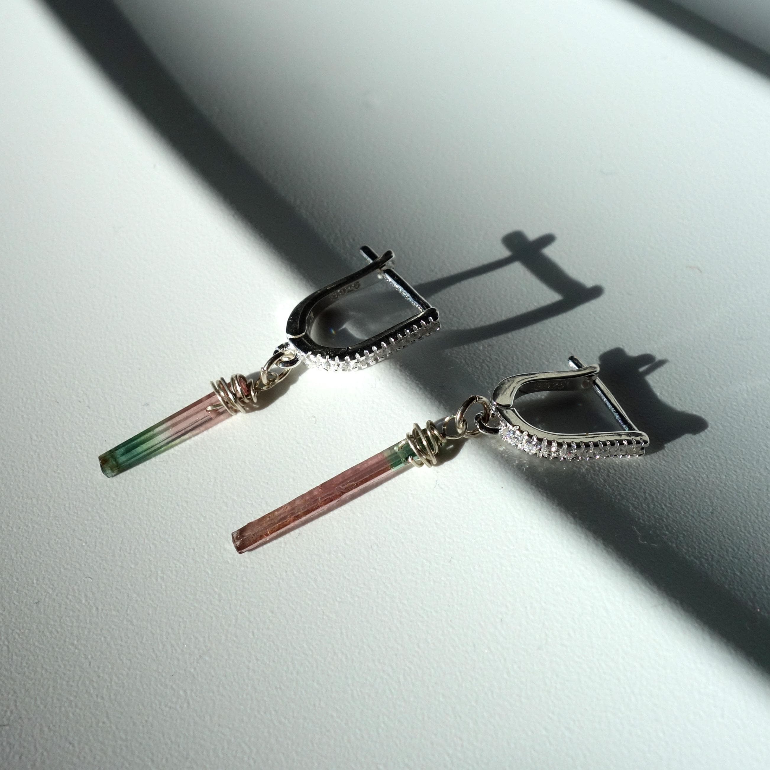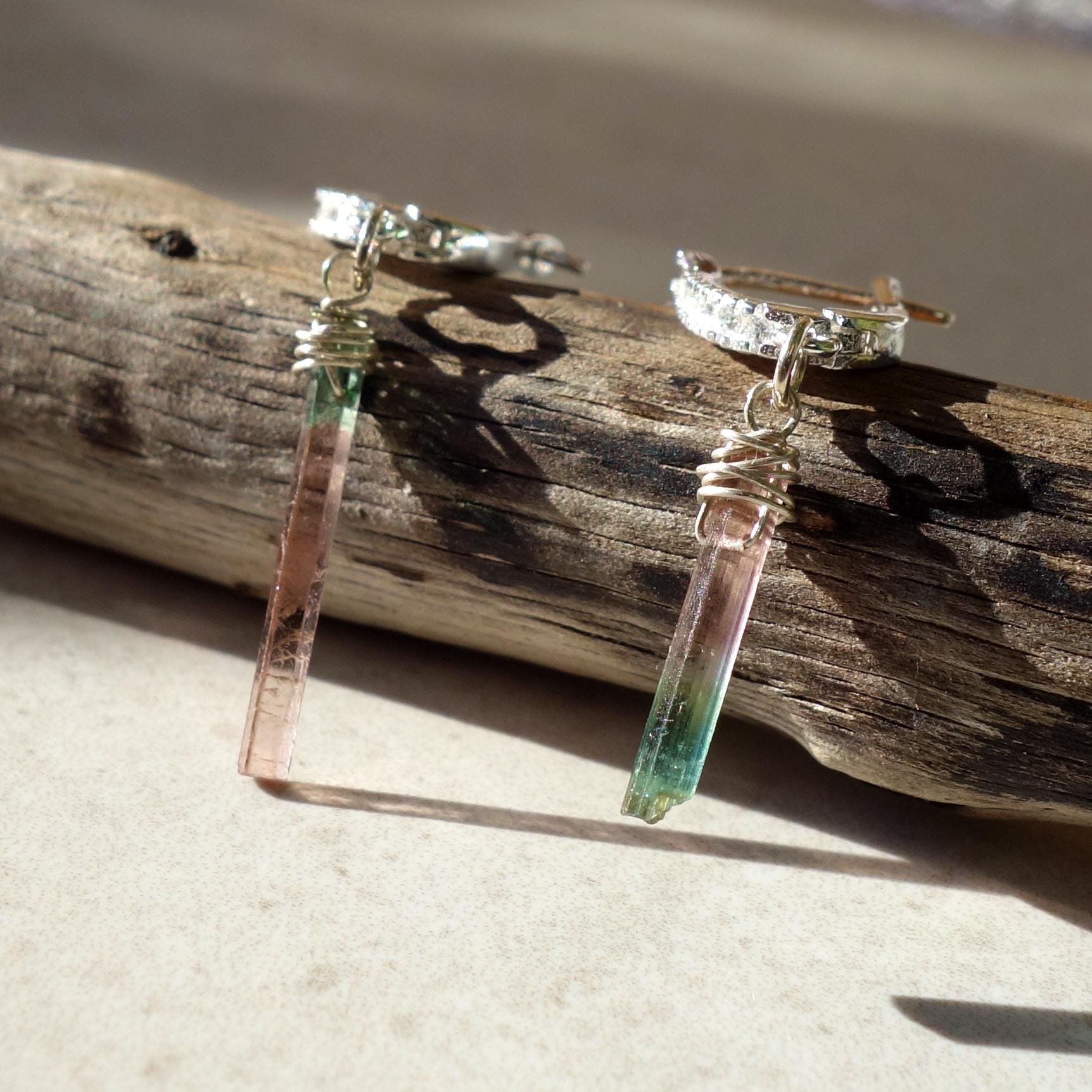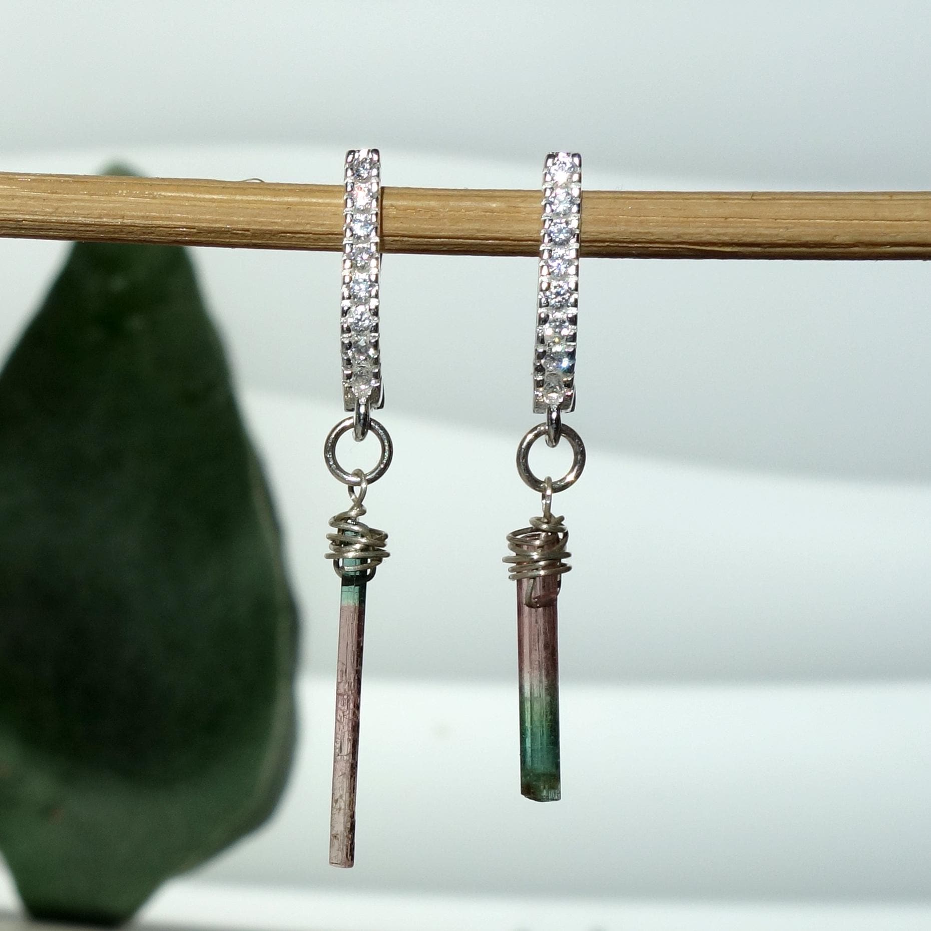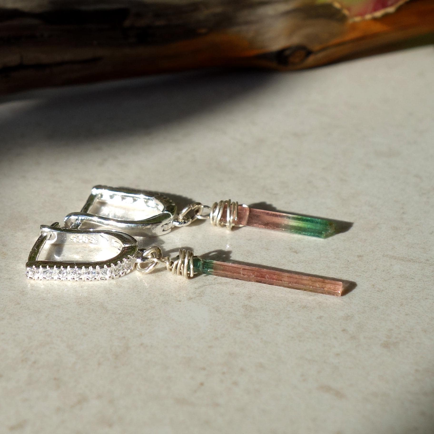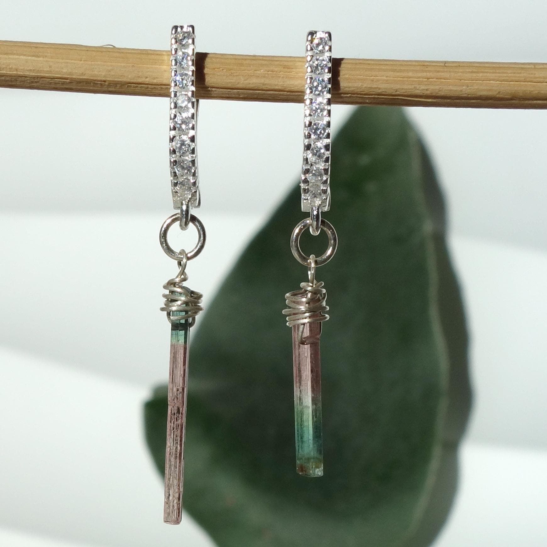 These delicate earrings feature raw watermelon tourmaline crystals — each with its own gradient of pink and green, untouched and alive.