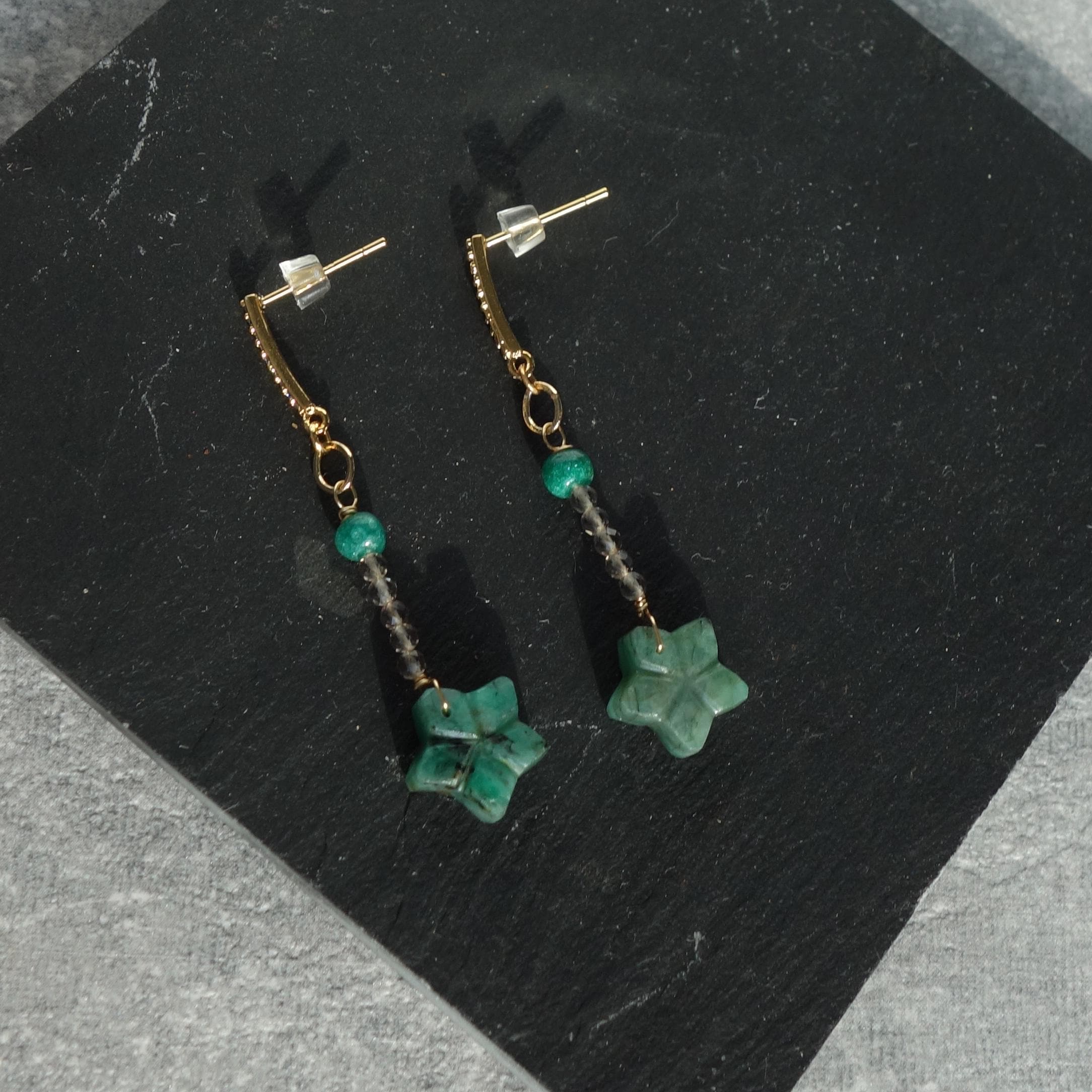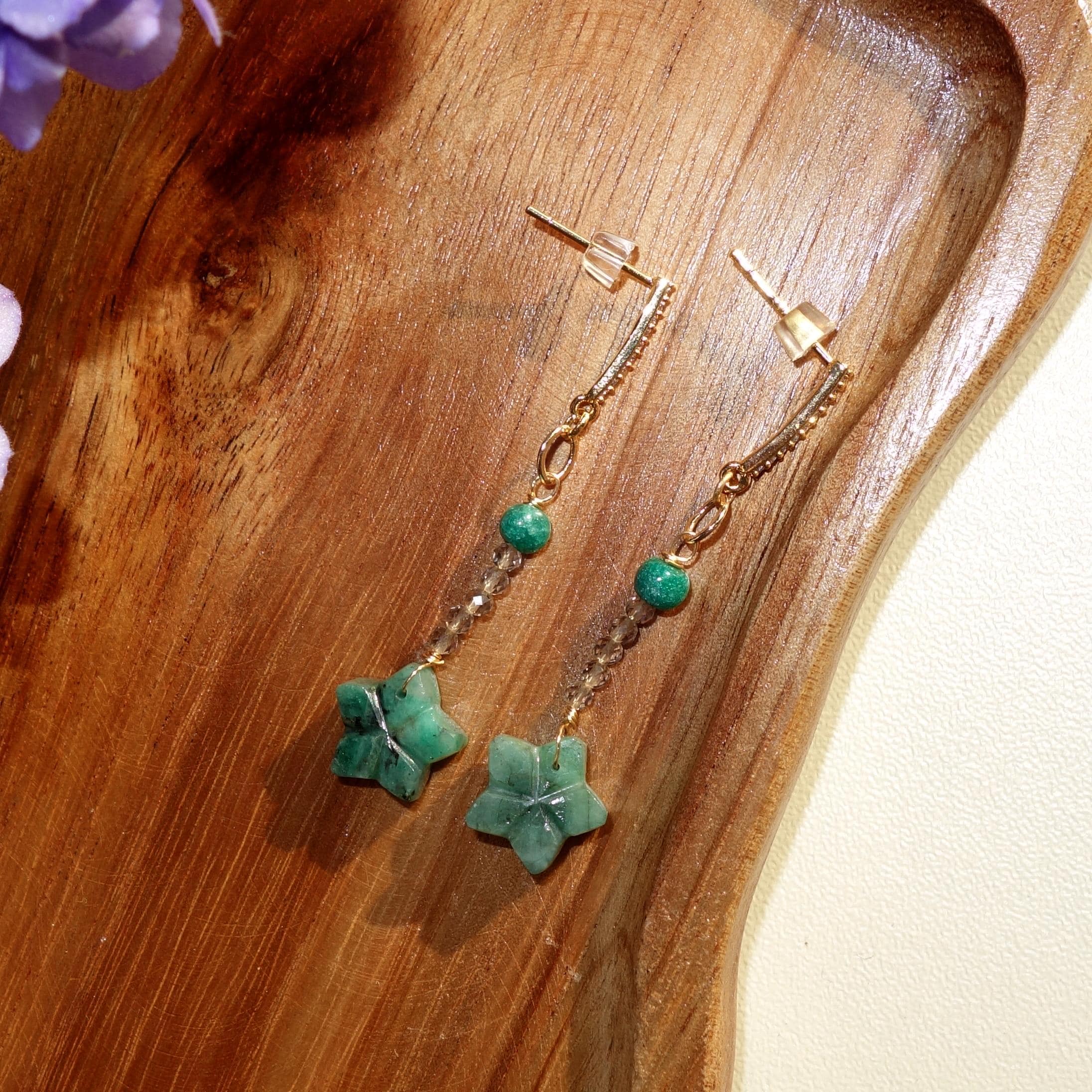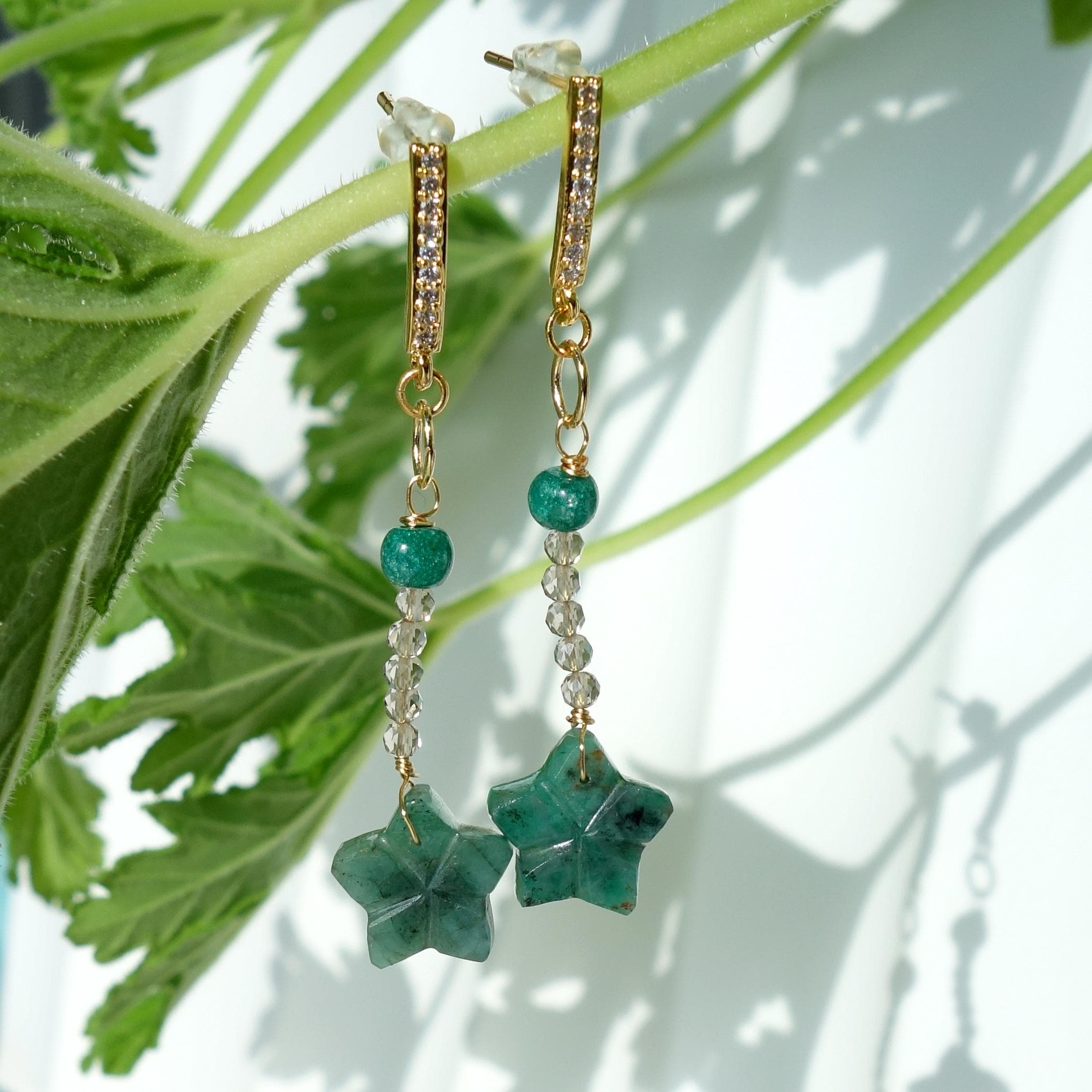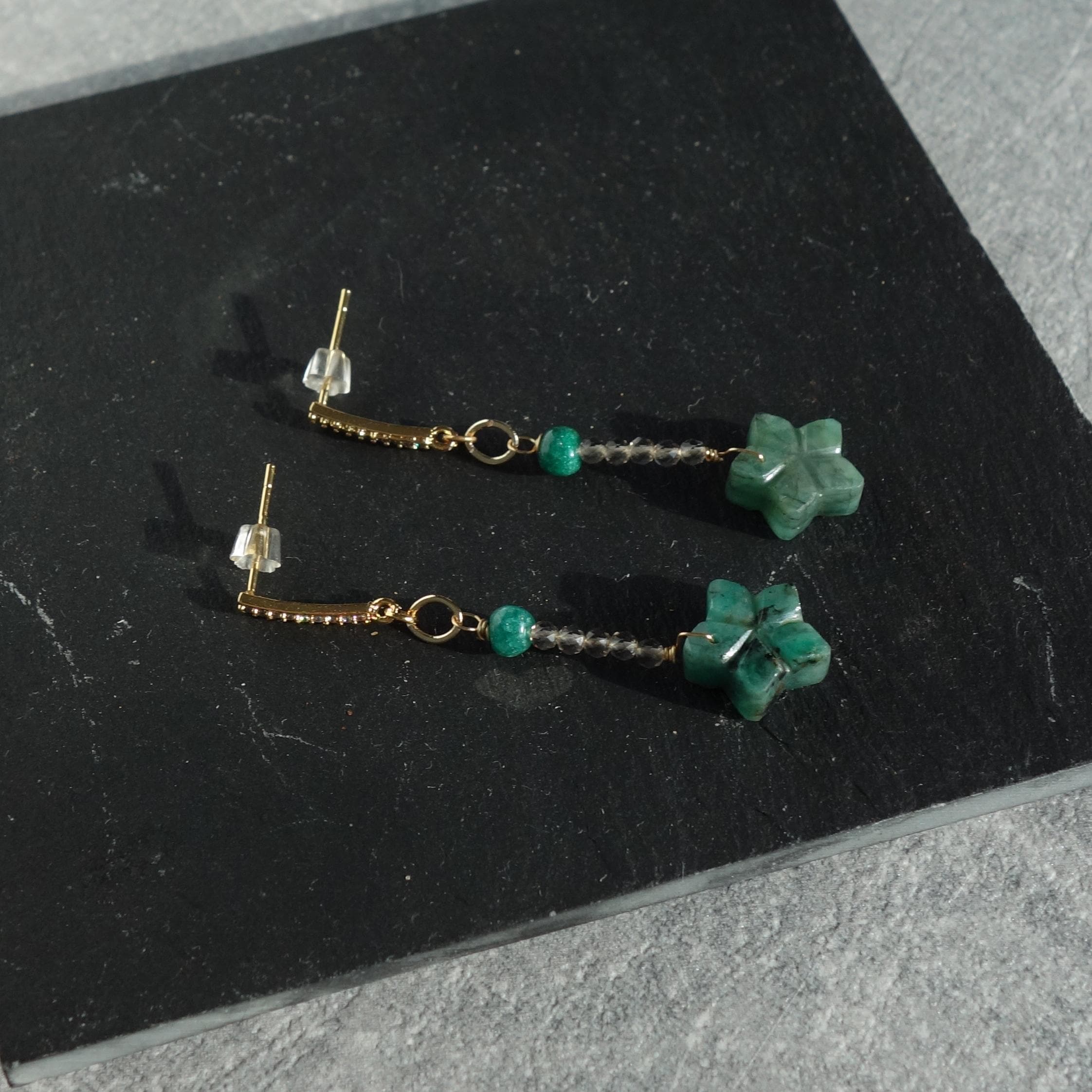 Delicate and radiant, these earrings feature natural emeralds and obsidians, set on gold-plated stainless steel. The emerald stars catch the light beautifully, bringing a touch of natural magic to any look.