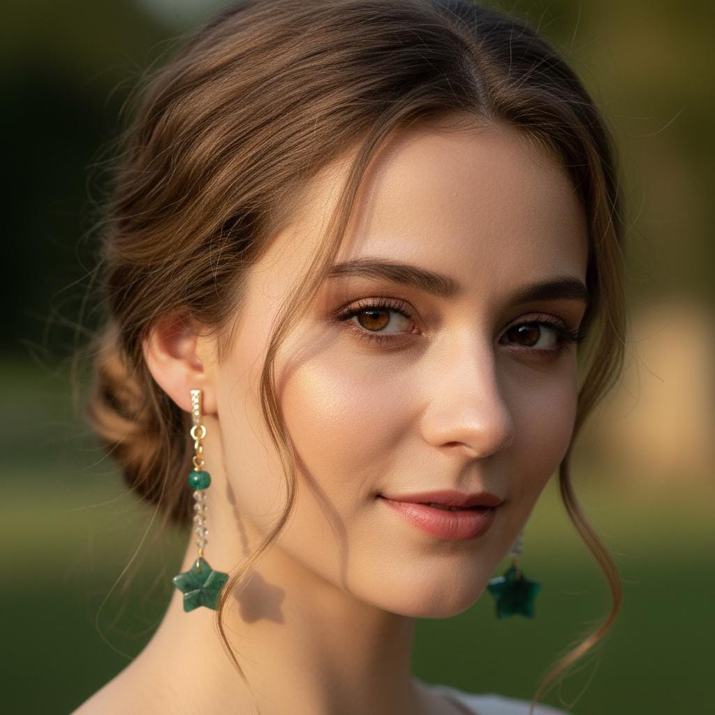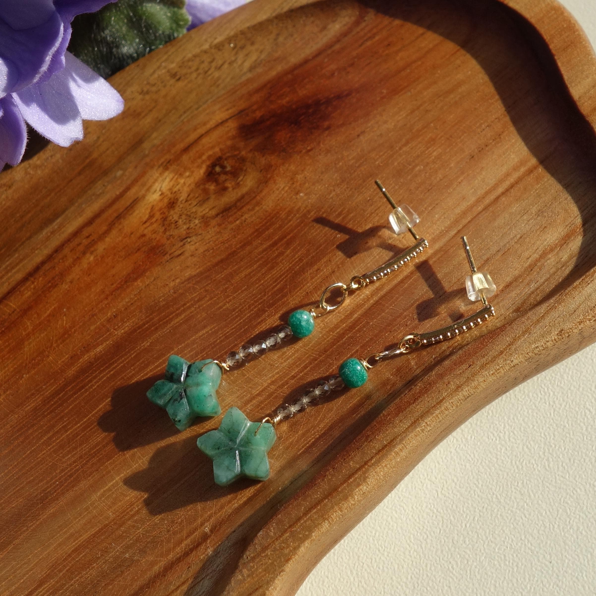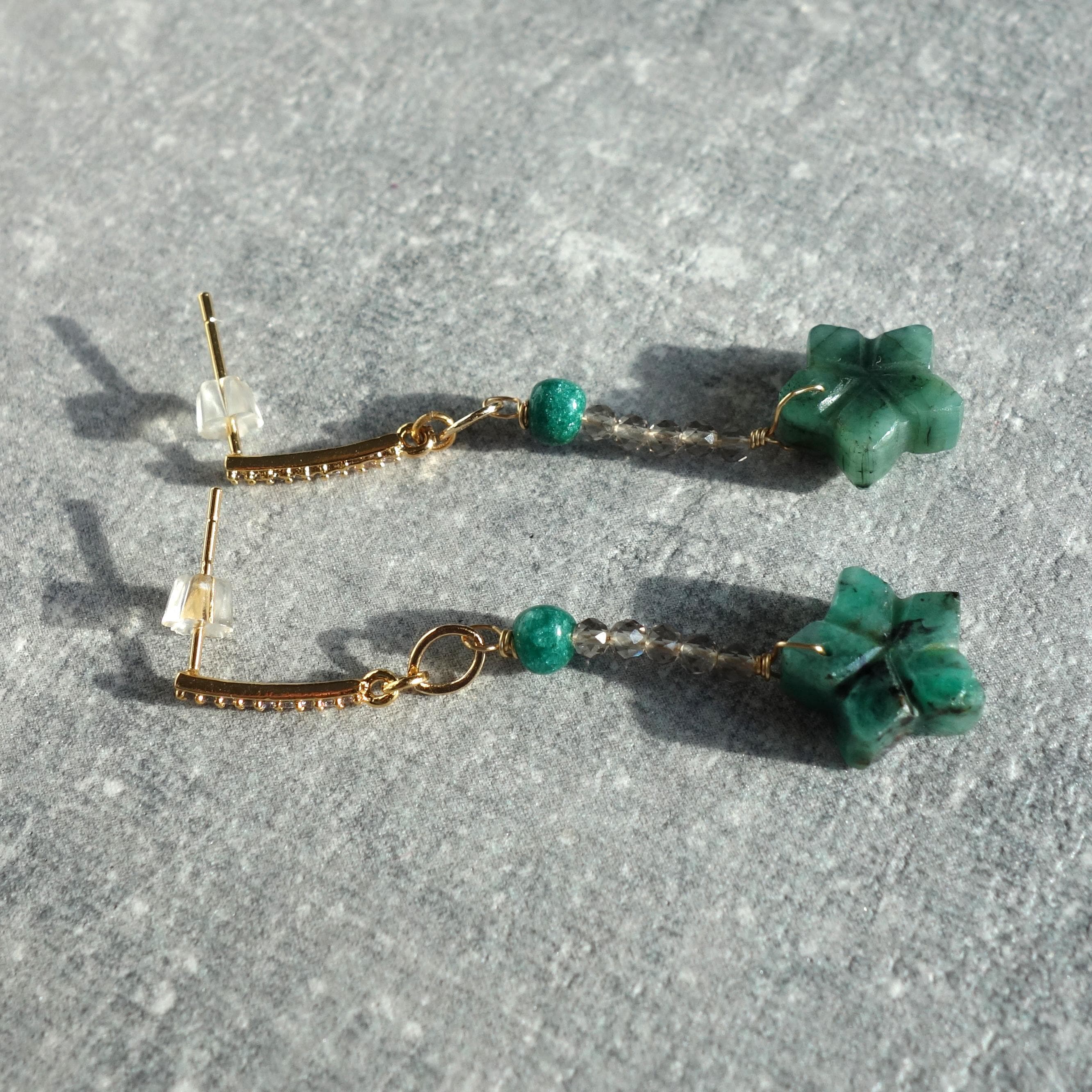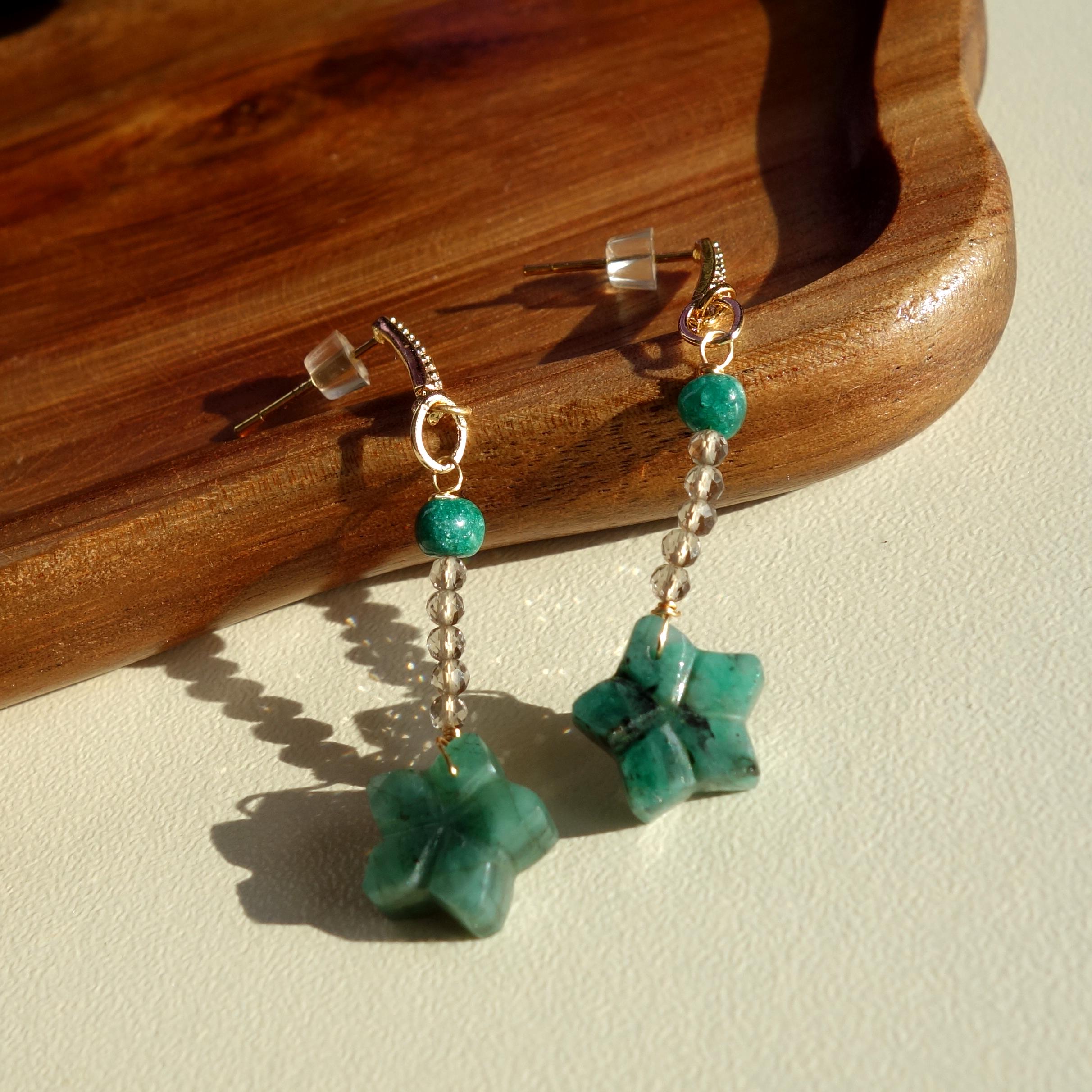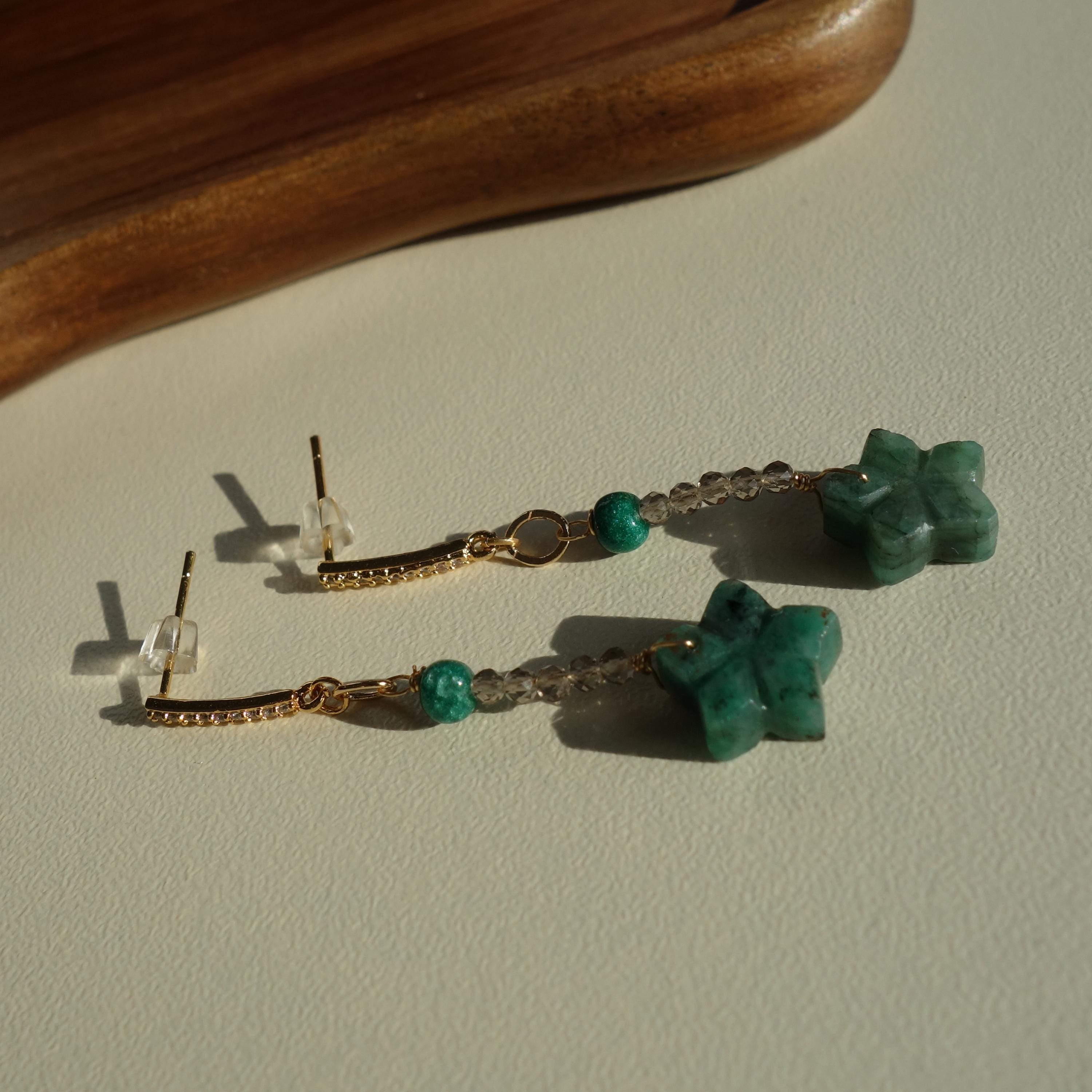 Delicate and radiant, these earrings feature natural emeralds and obsidians, set on gold-plated stainless steel. The emerald stars catch the light beautifully, bringing a touch of natural magic to any look.