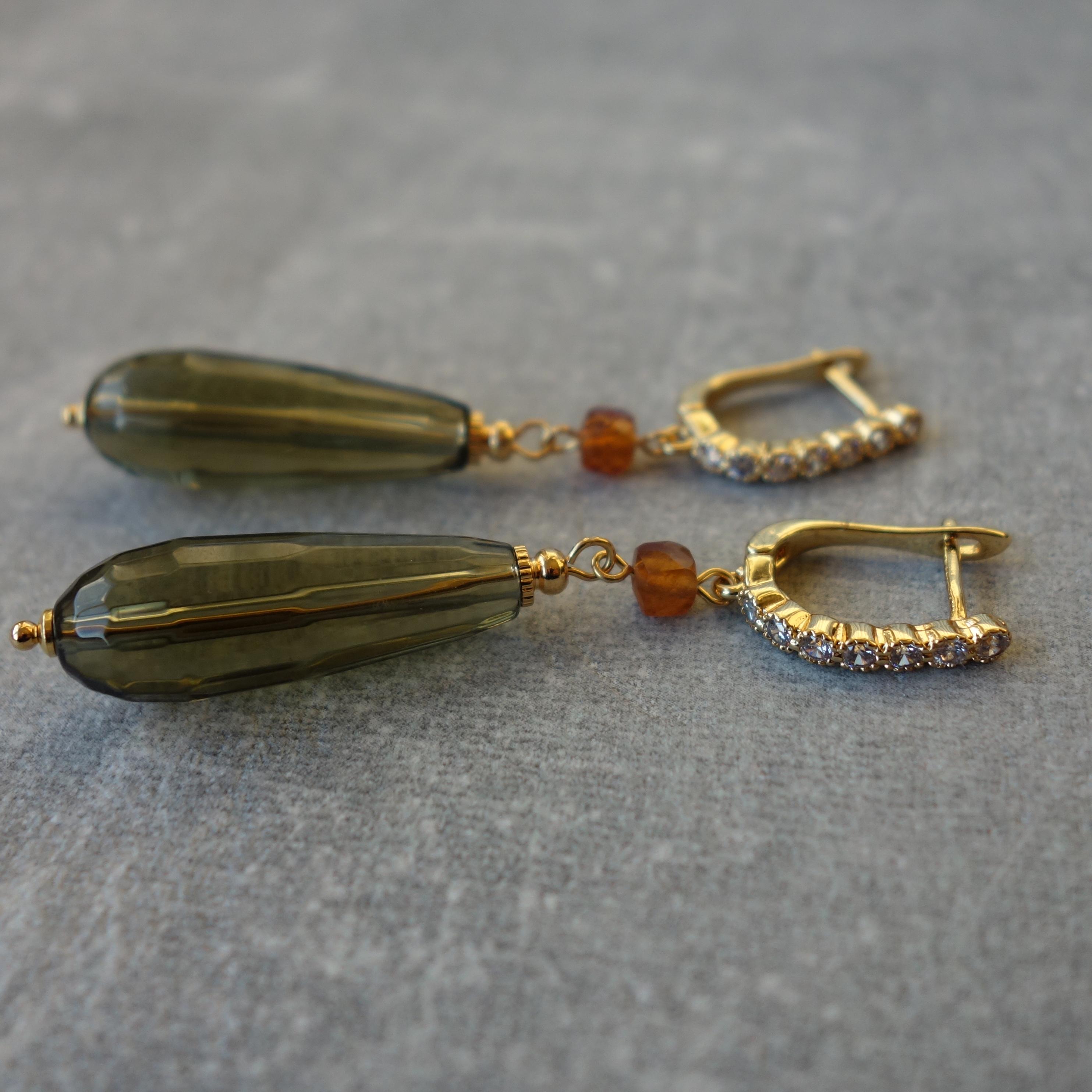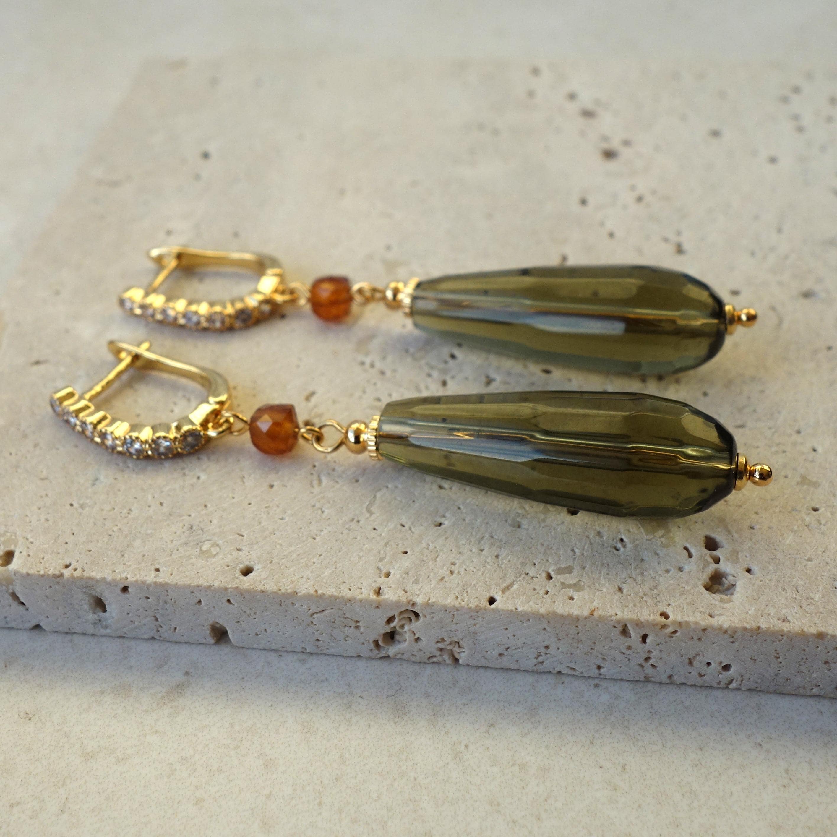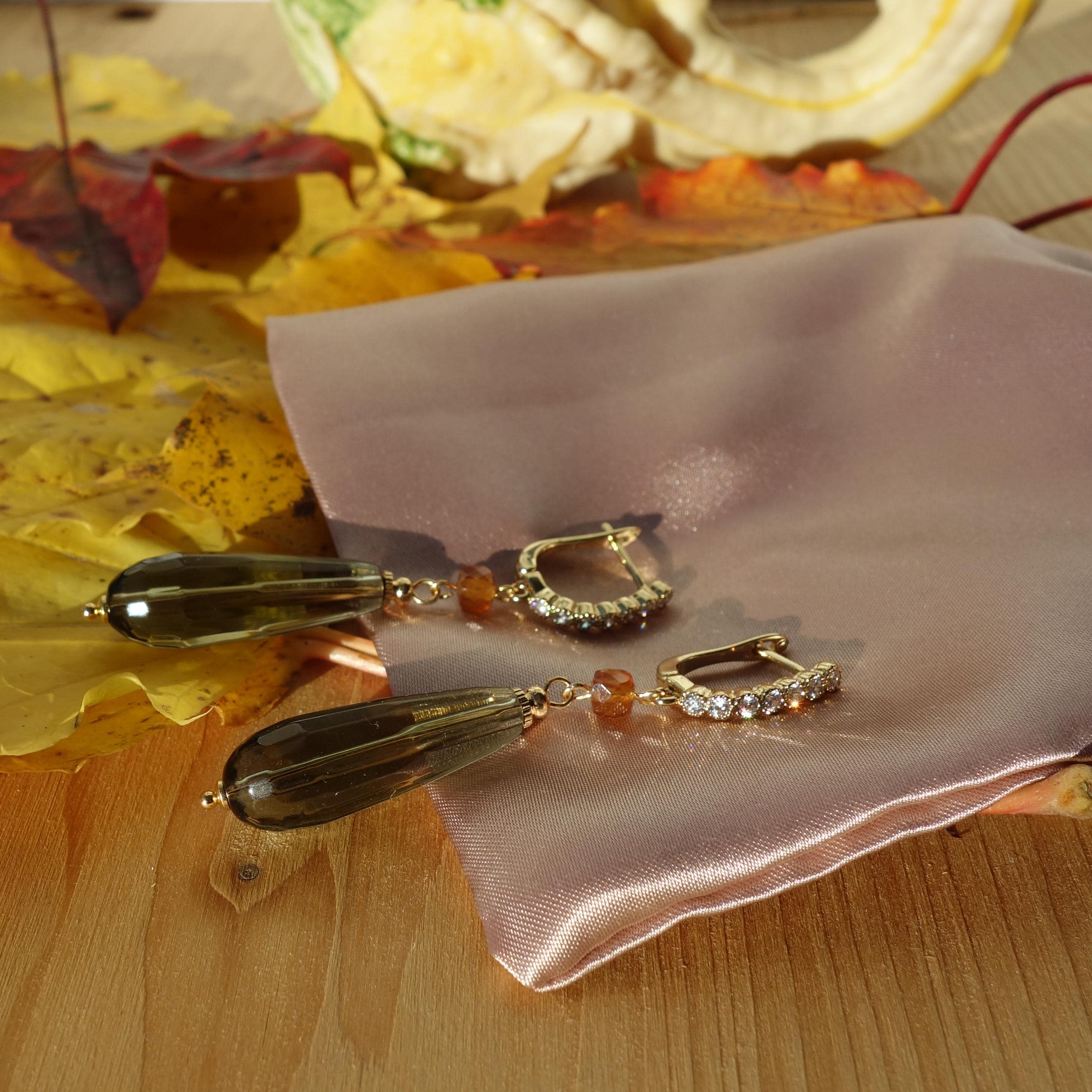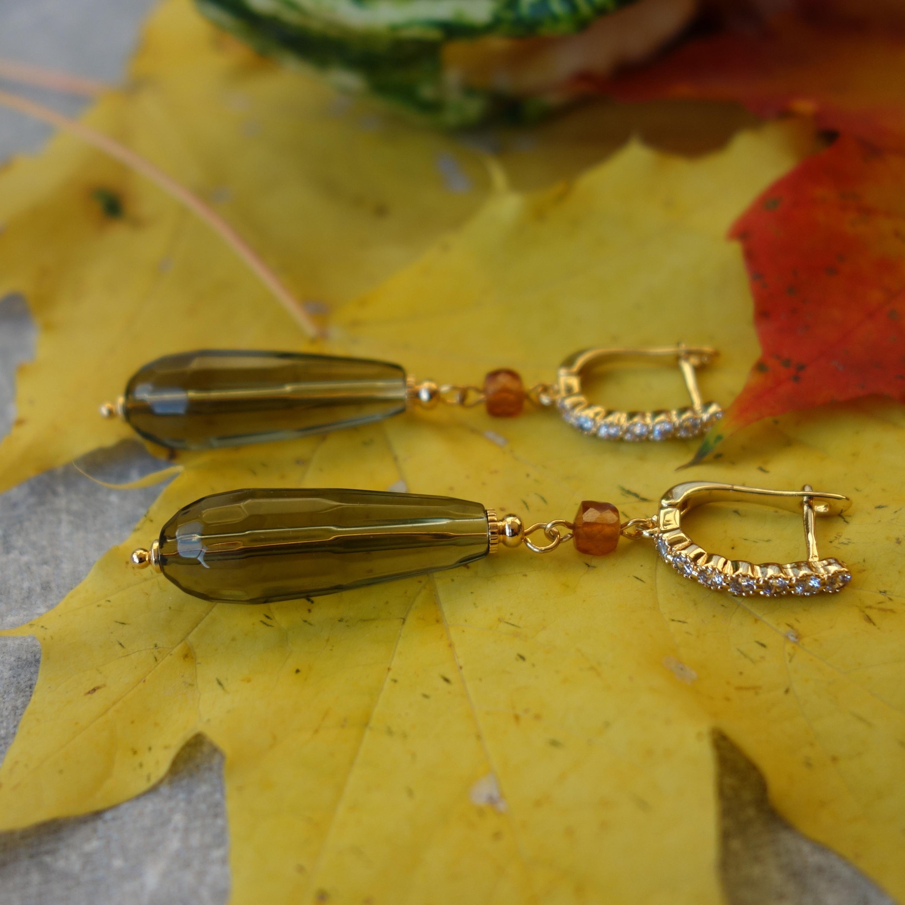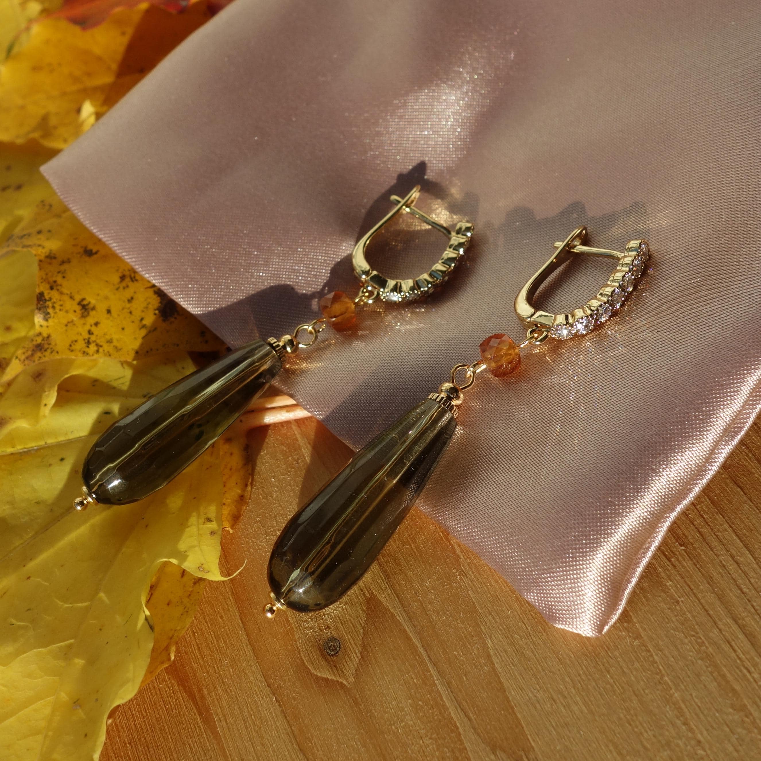 Add a touch of sophistication and warmth to your style with these elegant drop earrings, featuring natural faceted smoky quartz and rare orange spessartine garnet (Mandarin garnet). The rich earthy hues of smoky quartz beautifully complement the fiery brilliance of spessartine, creating a unique and eye-catching design.