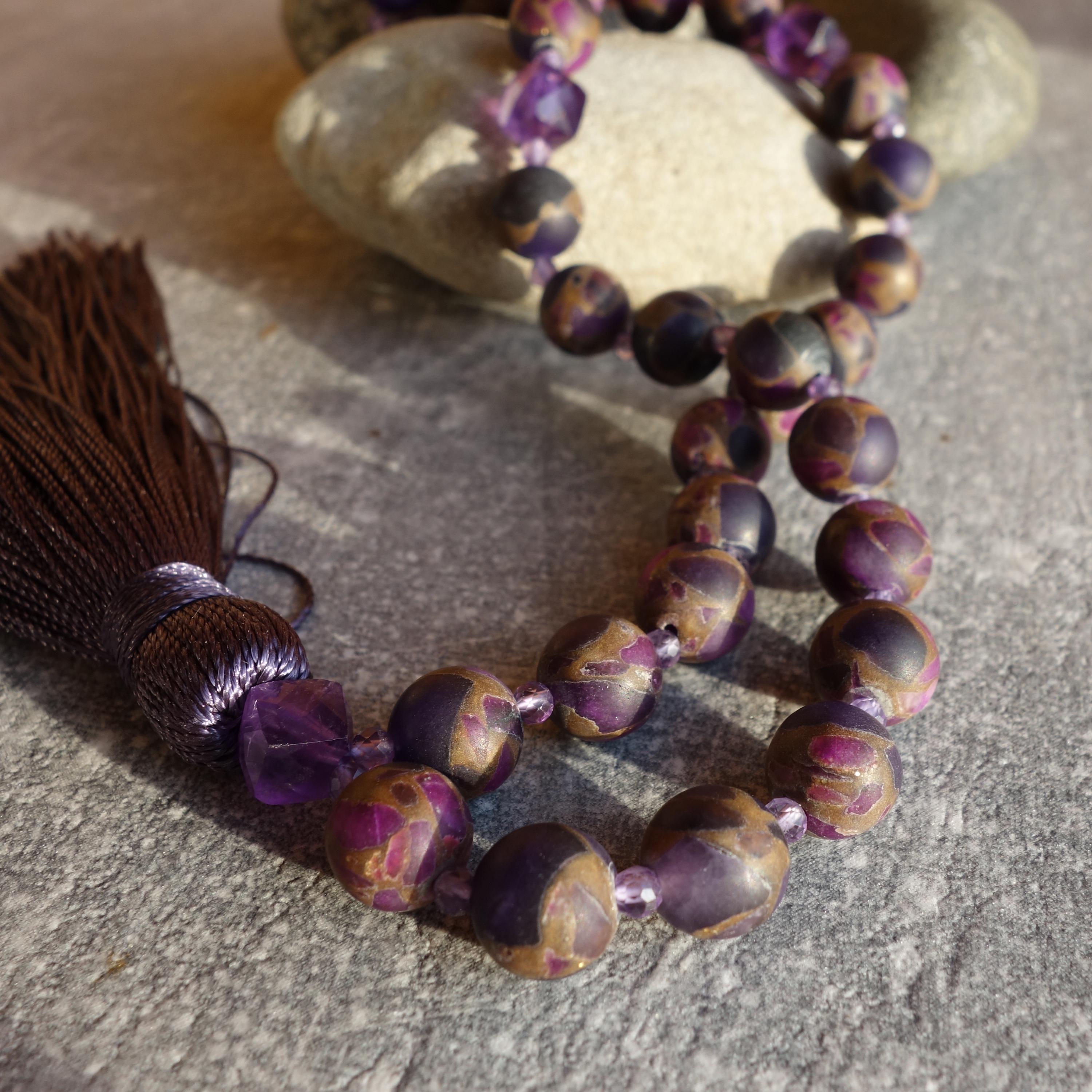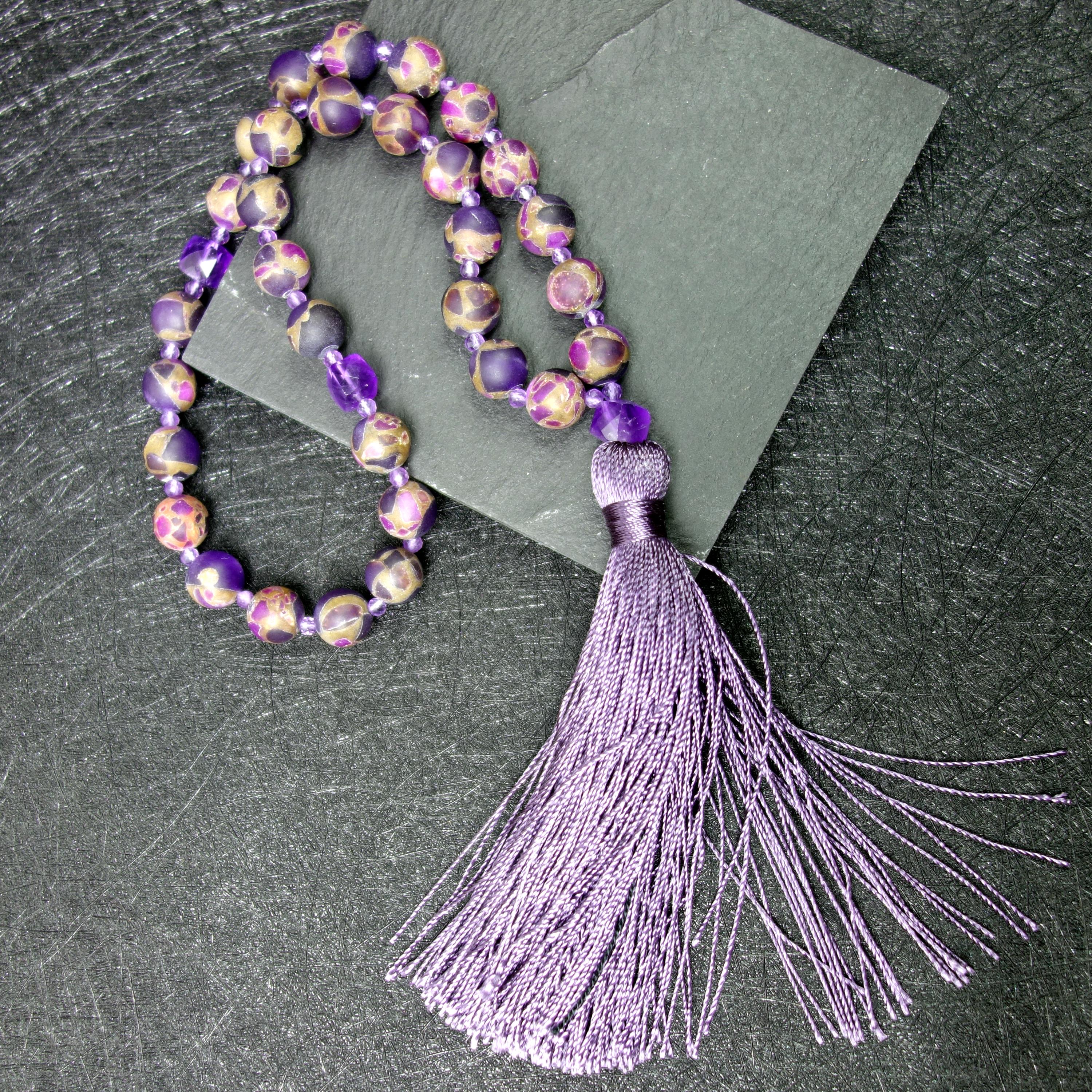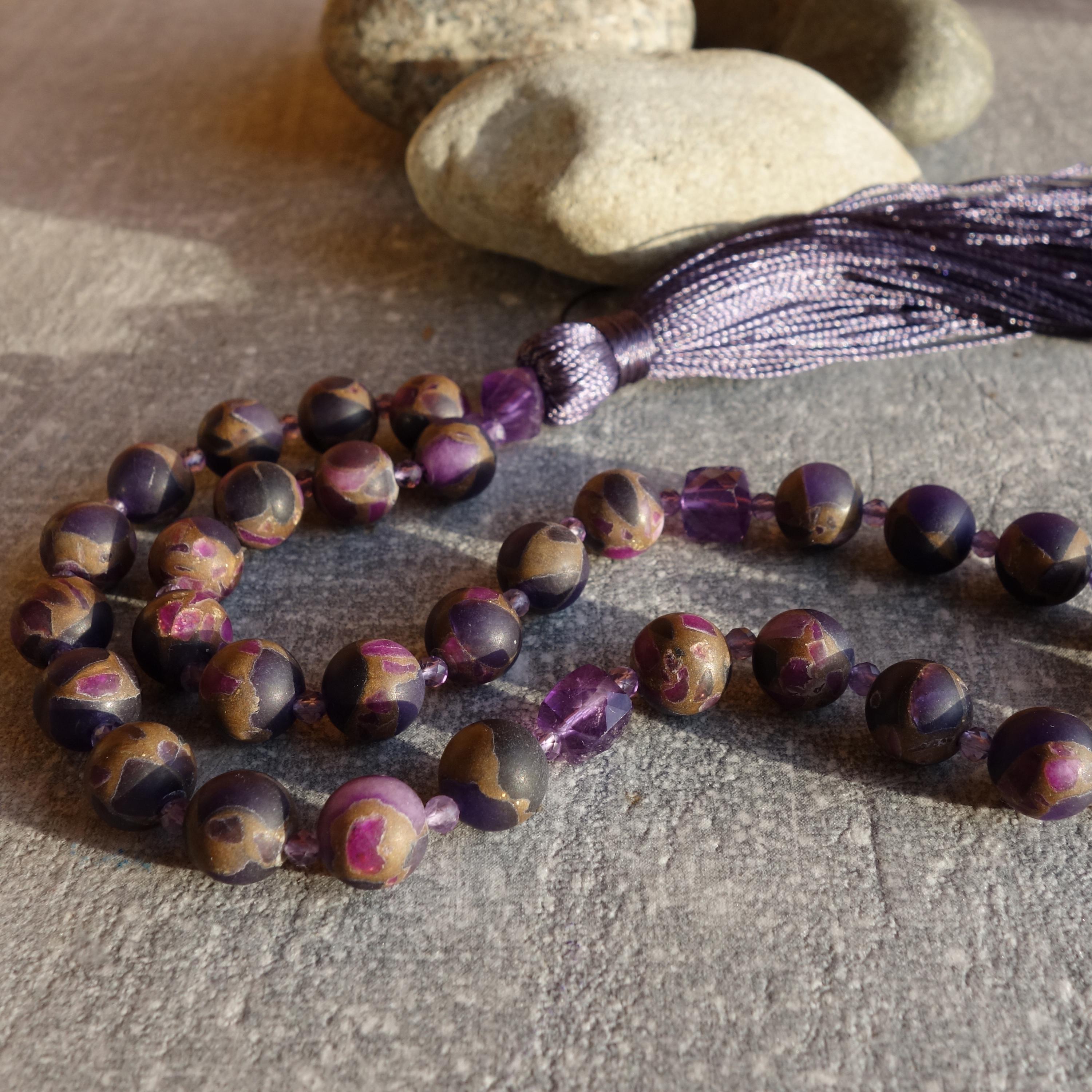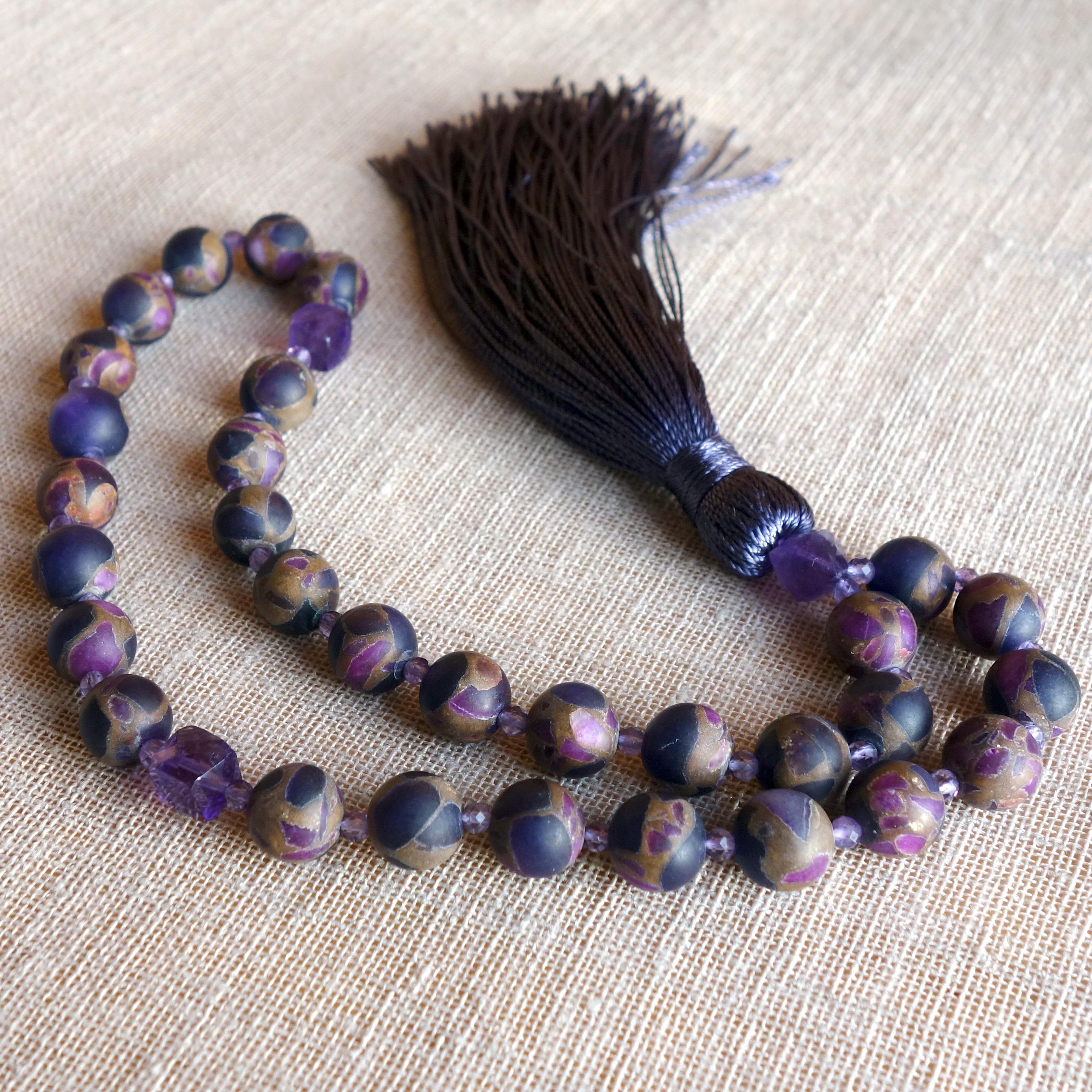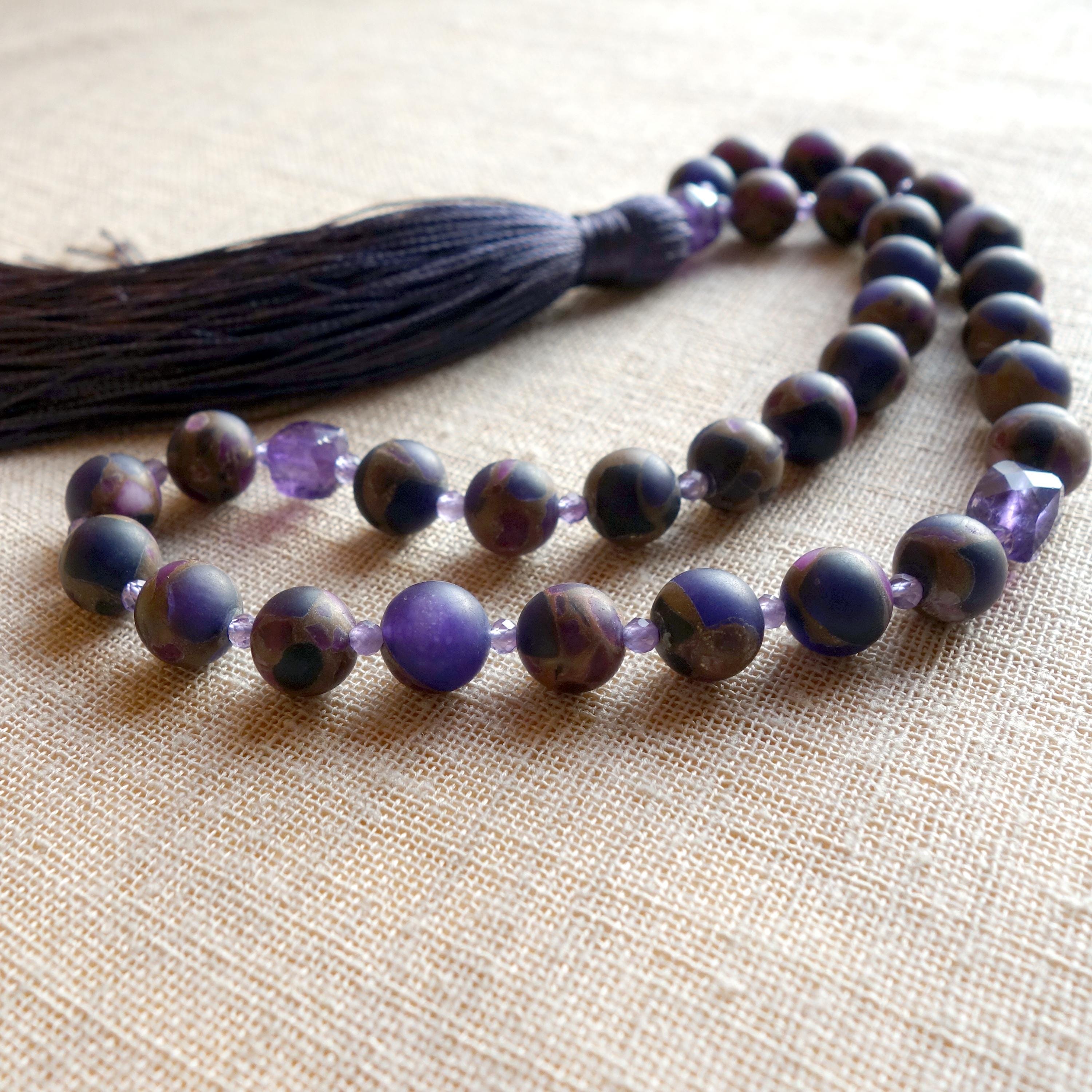 Handcrafted mala necklace featuring 30 dyed Dzi agate beads (10 mm) in rich purple hues, accented with natural amethyst beads (3 x 7.5 mm) and small faceted amethyst spacers (3.5 mm). Finished with a silky purple tassel for an elegant look. Perfect for meditation, mindfulness, prayer, yoga, or as a unique statement accessory.