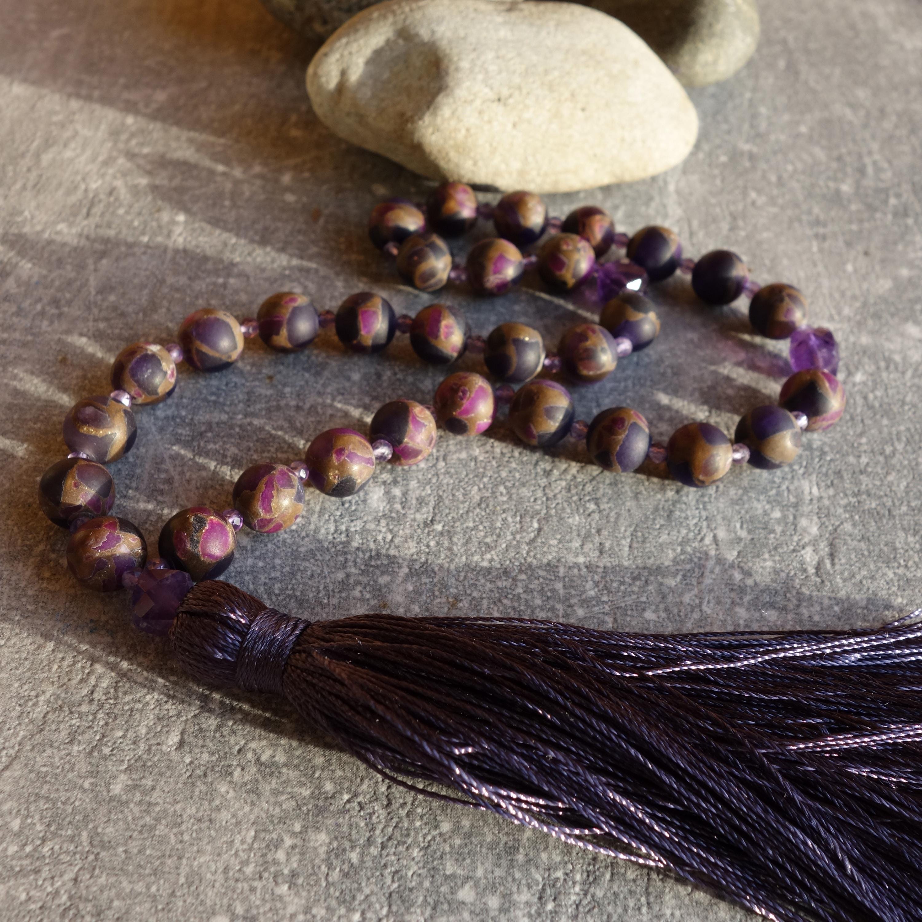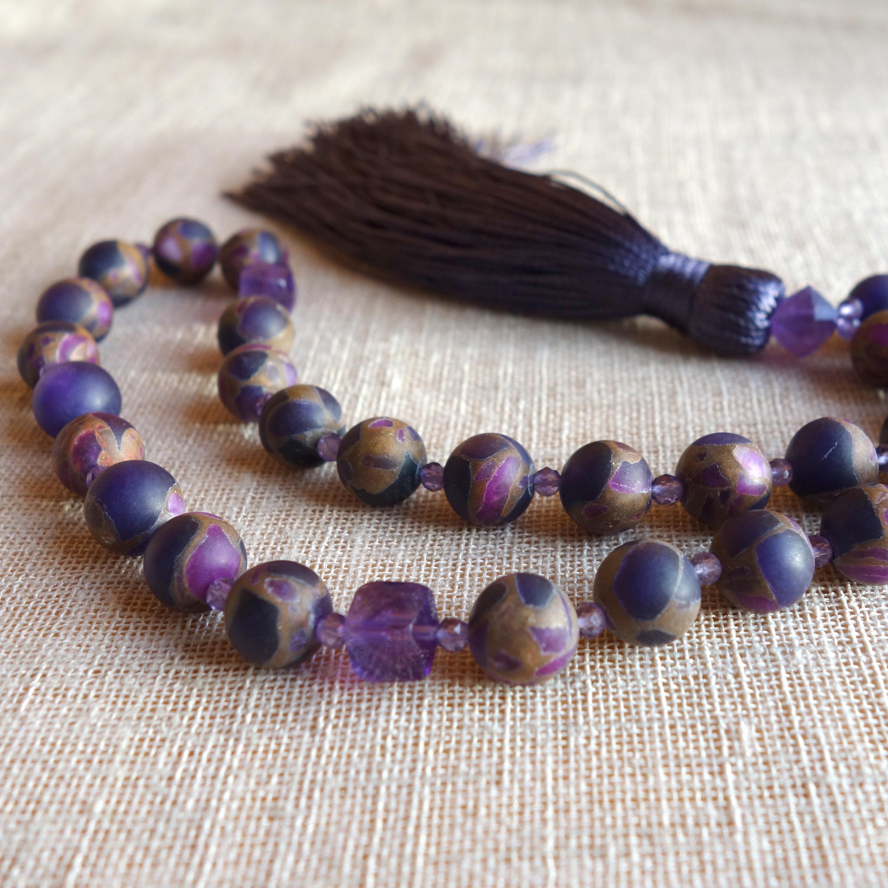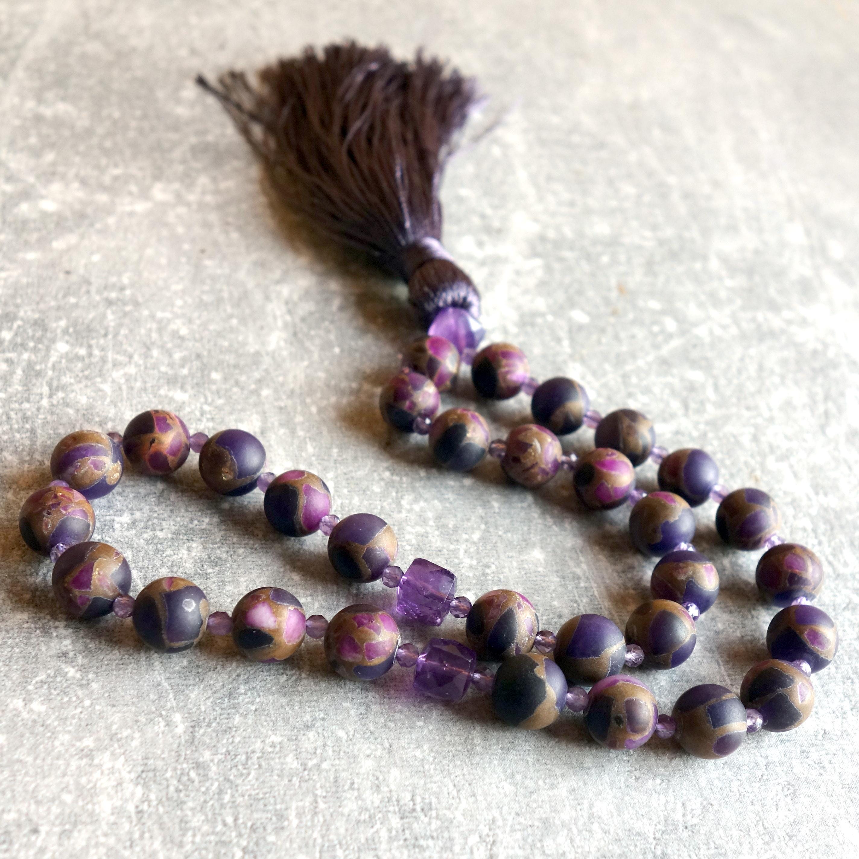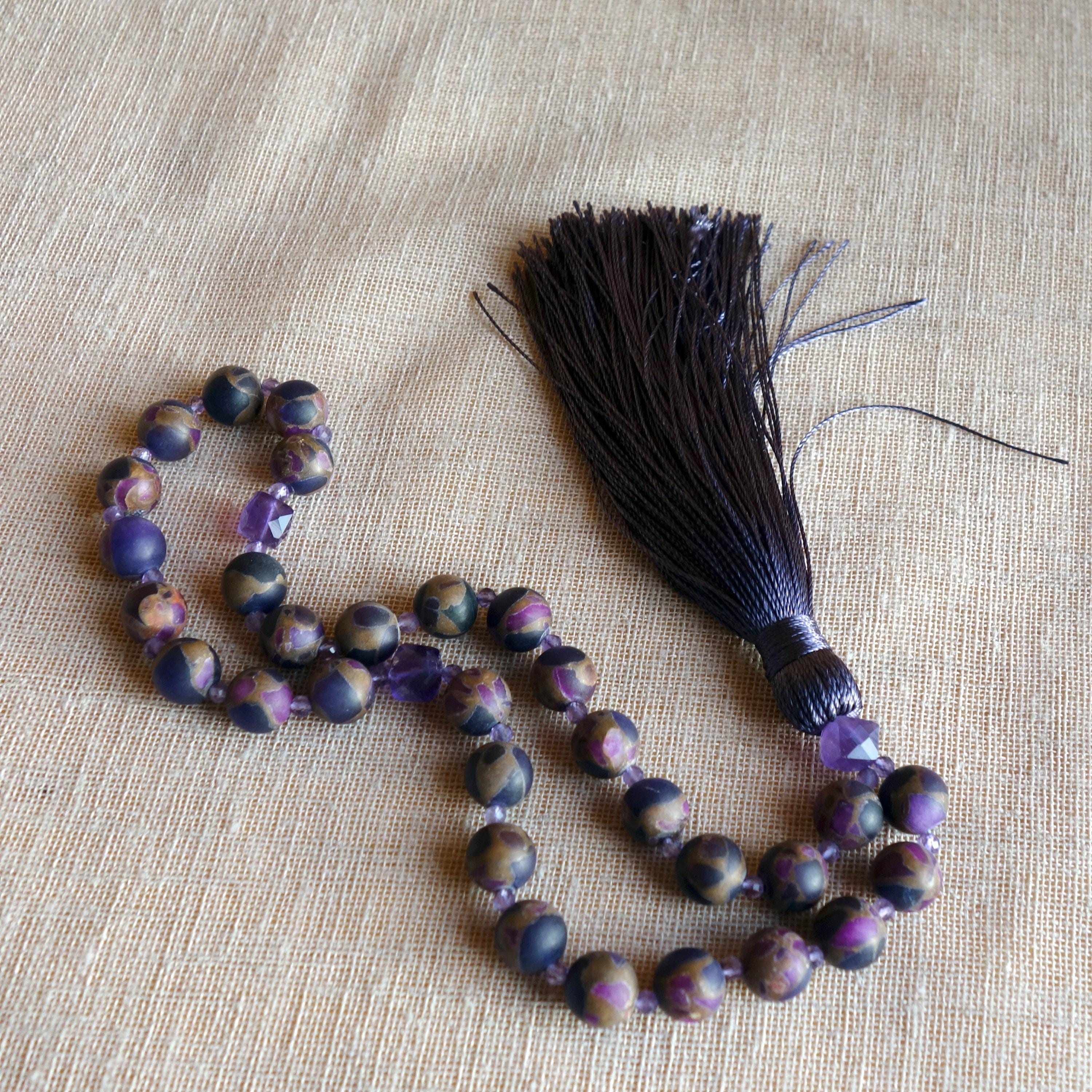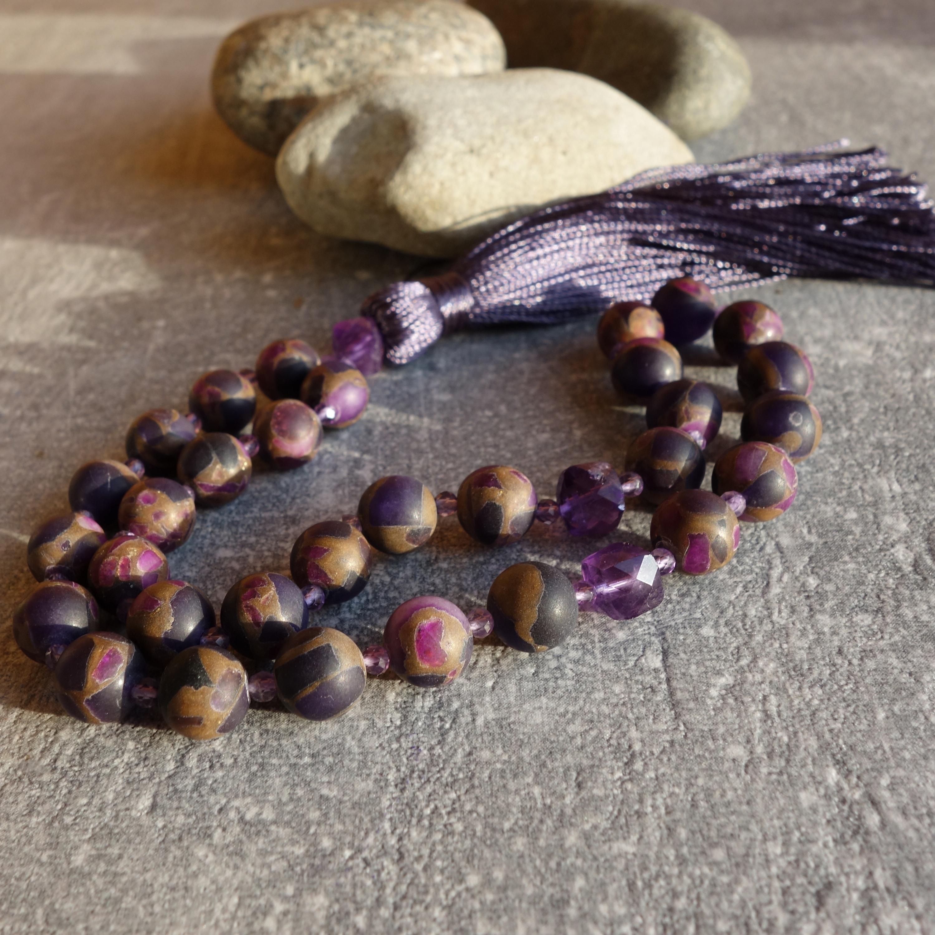 Handcrafted mala necklace featuring 30 dyed Dzi agate beads (10 mm) in rich purple hues, accented with natural amethyst beads (3 x 7.5 mm) and small faceted amethyst spacers (3.5 mm). Finished with a silky purple tassel for an elegant look. Perfect for meditation, mindfulness, prayer, yoga, or as a unique statement accessory.