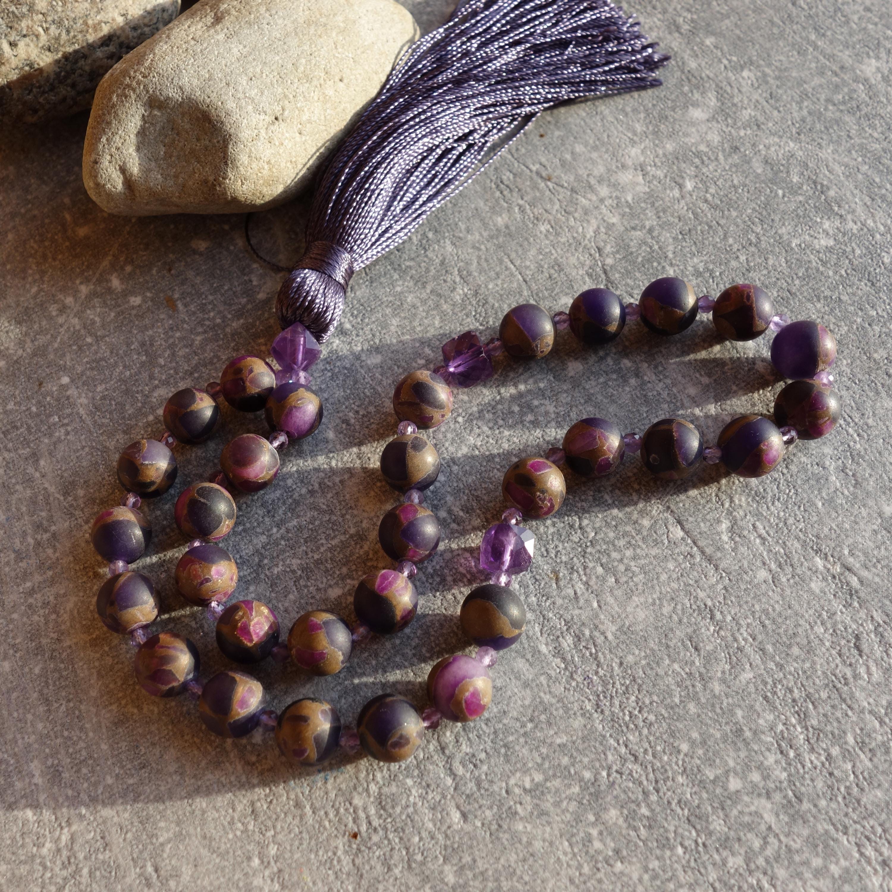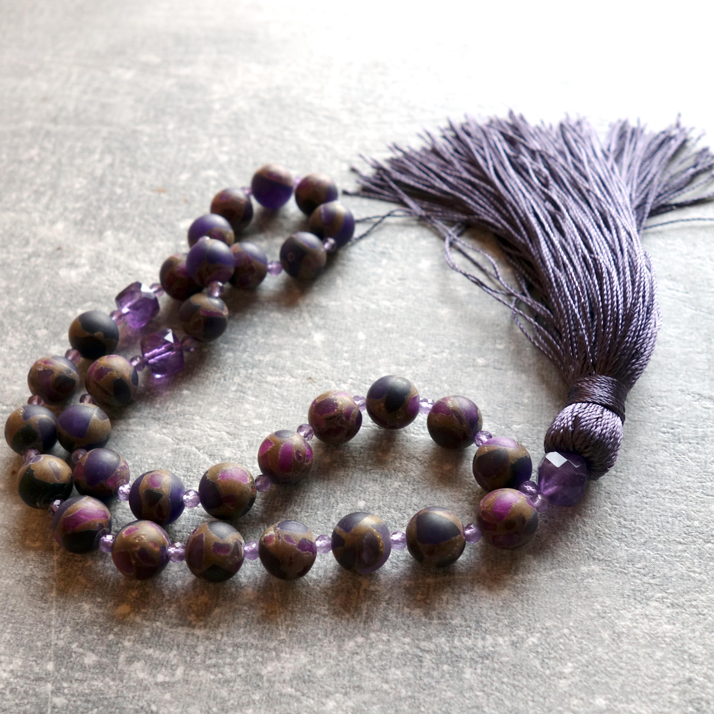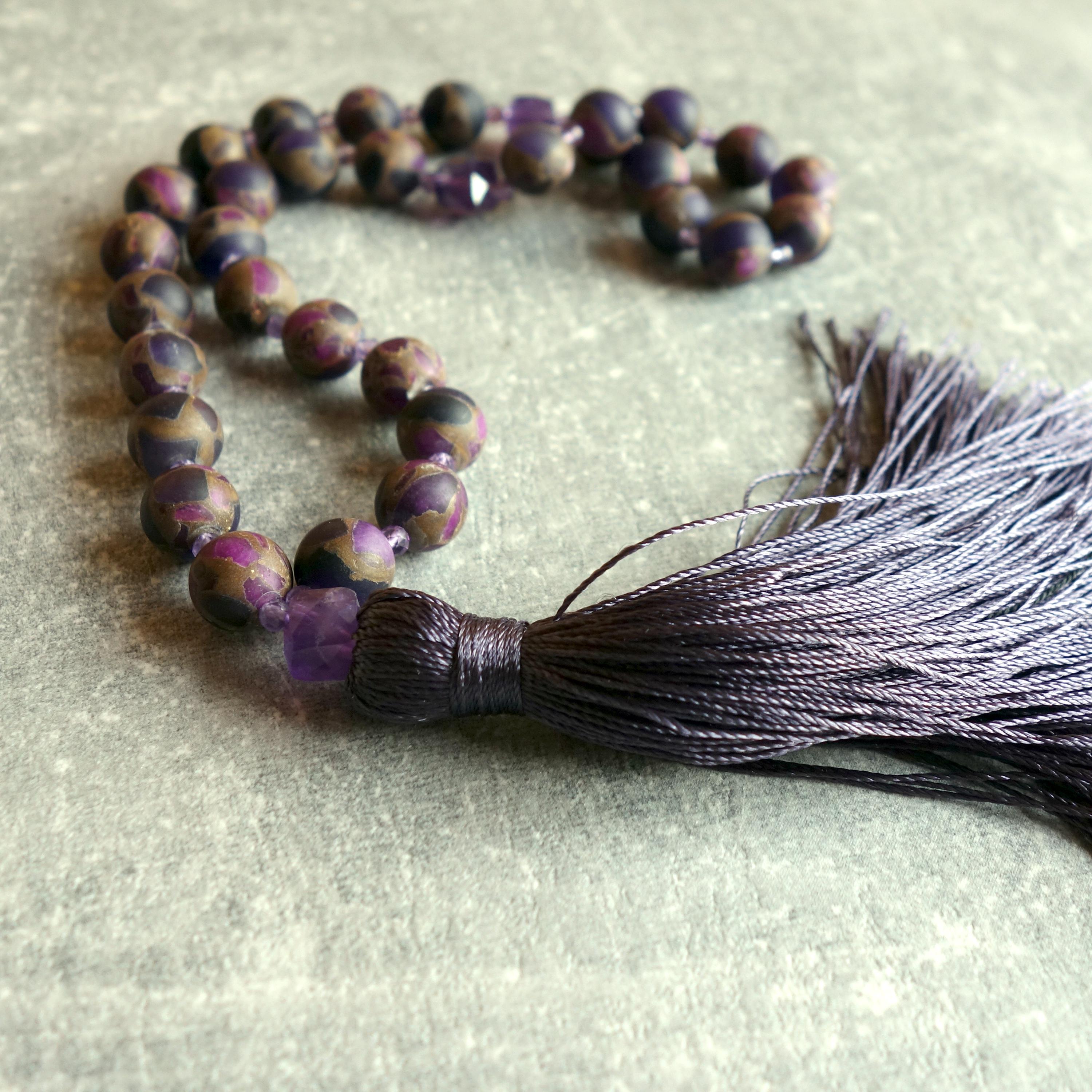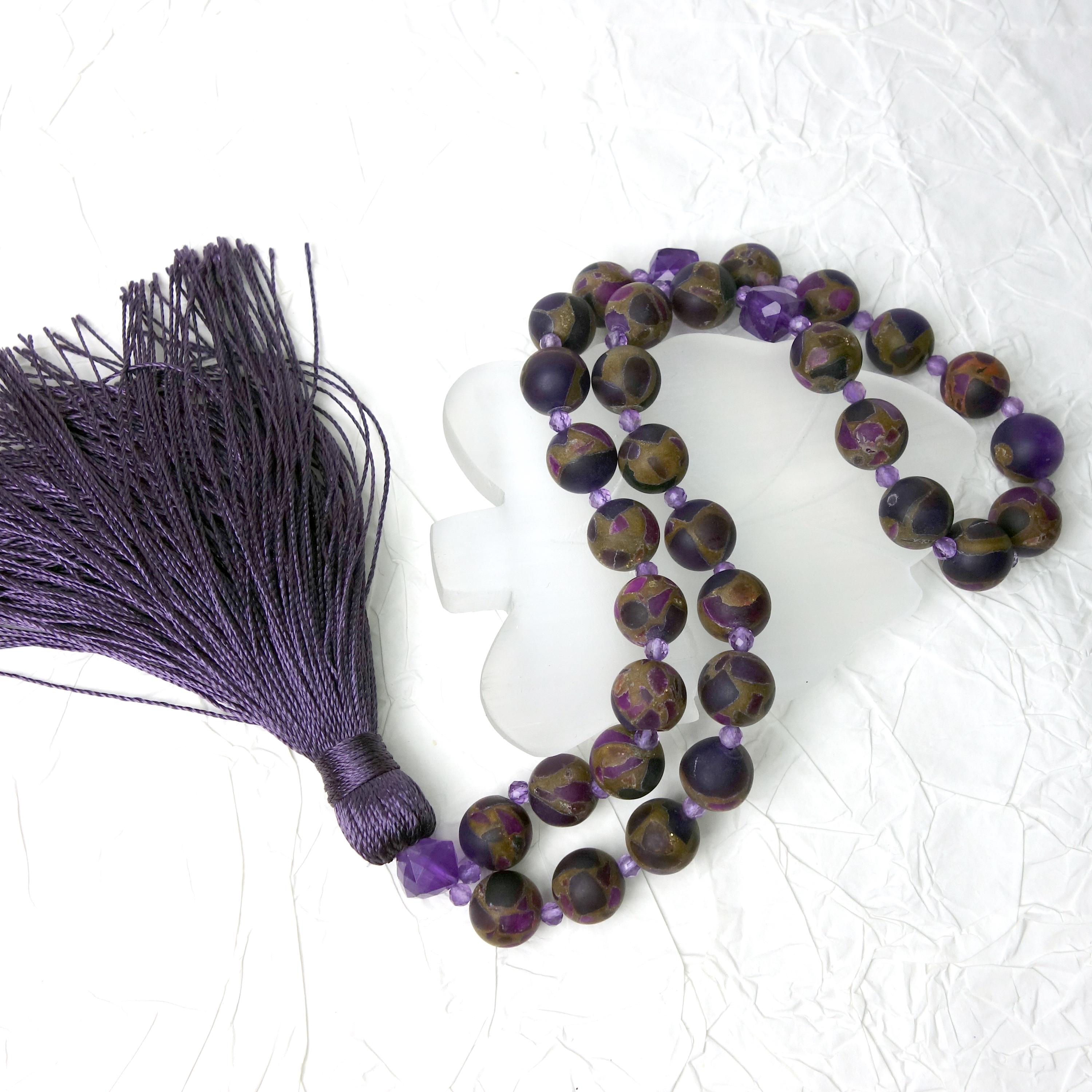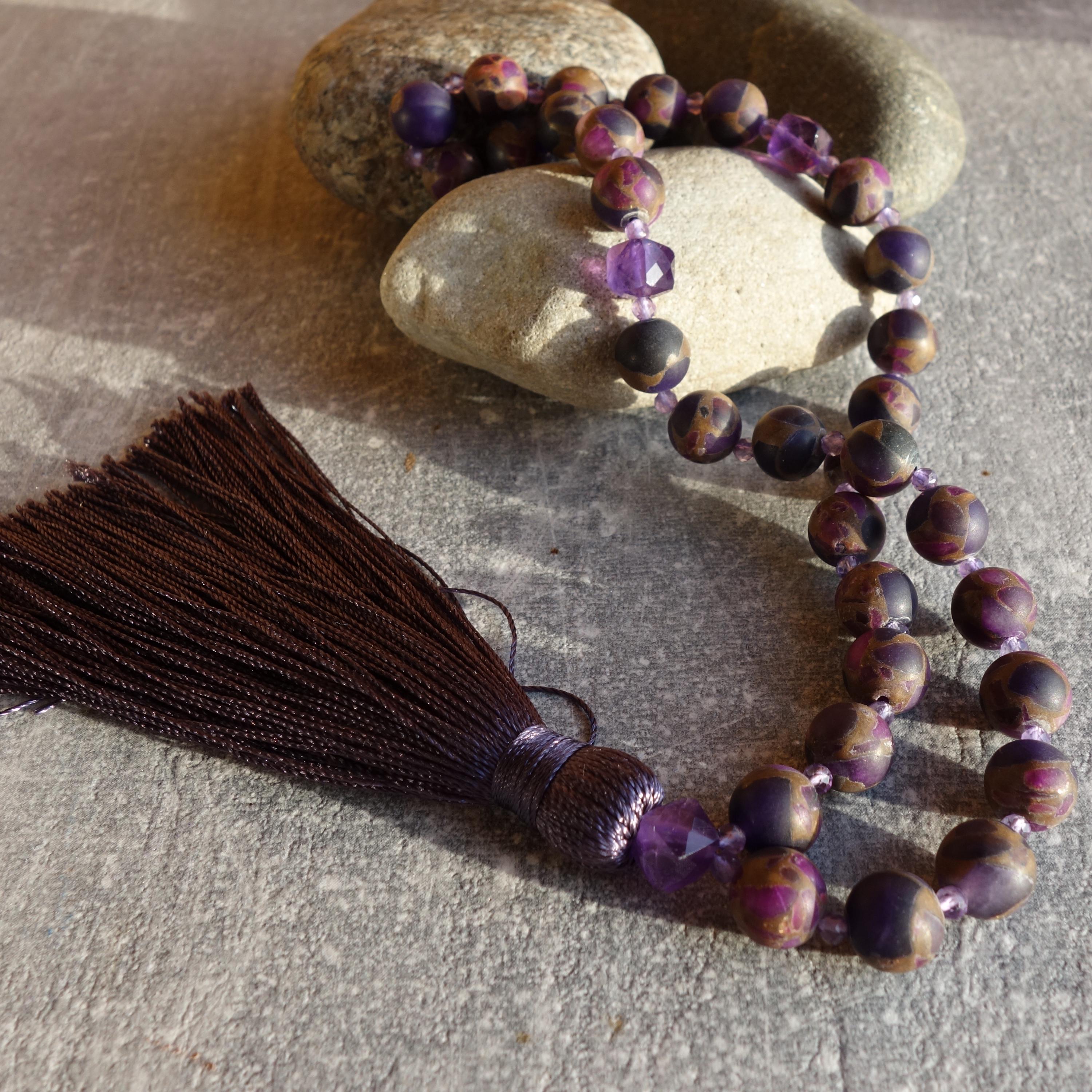 Handcrafted mala necklace featuring 30 dyed Dzi agate beads (10 mm) in rich purple hues, accented with natural amethyst beads (3 x 7.5 mm) and small faceted amethyst spacers (3.5 mm). Finished with a silky purple tassel for an elegant look. Perfect for meditation, mindfulness, prayer, yoga, or as a unique statement accessory.