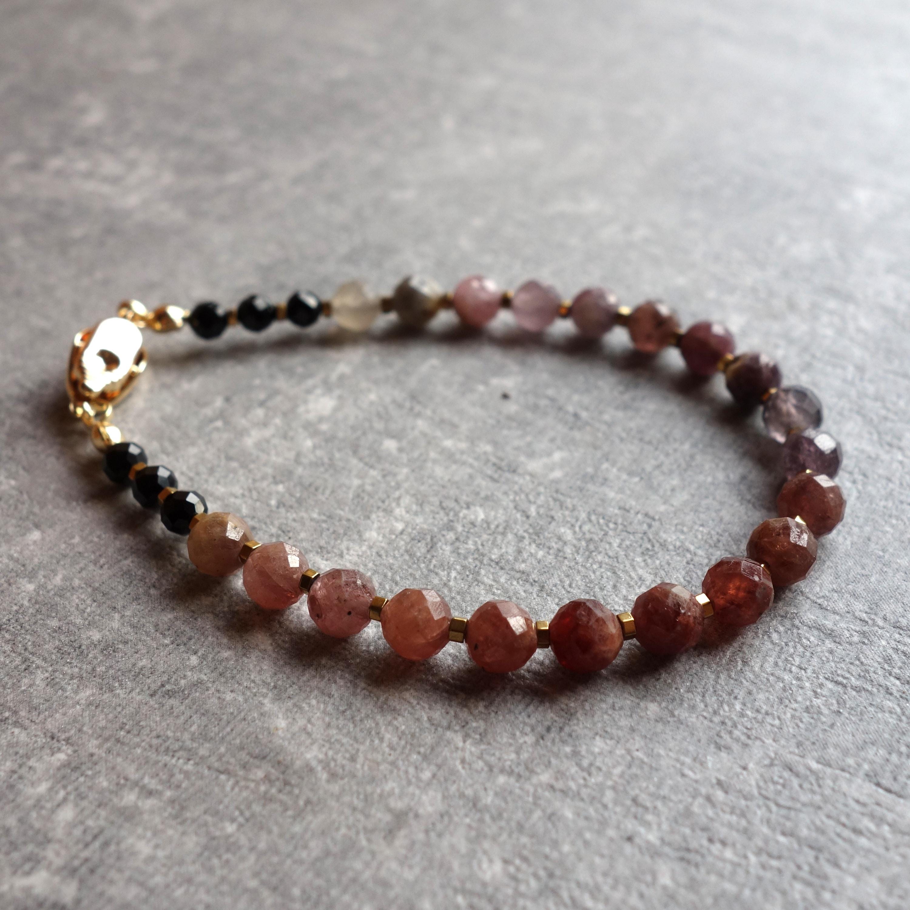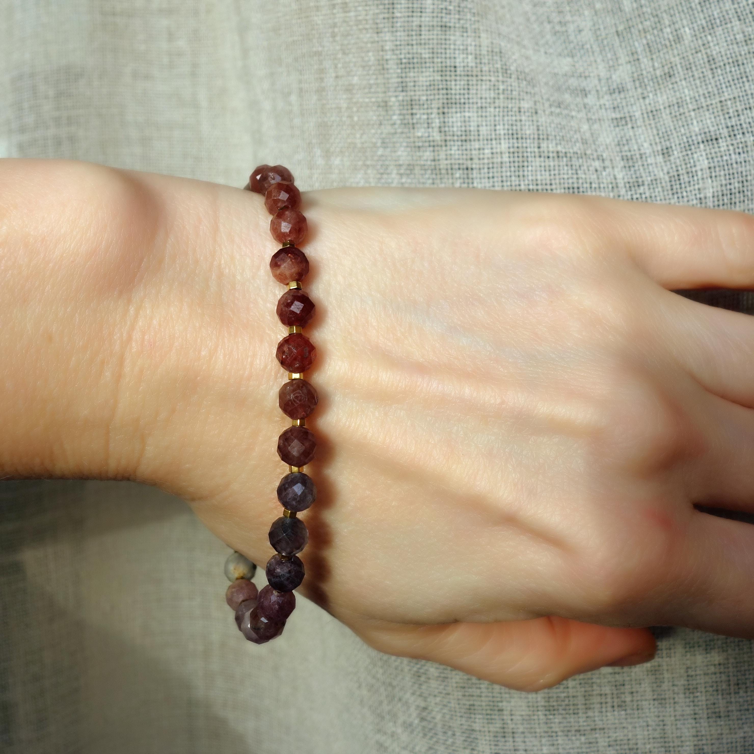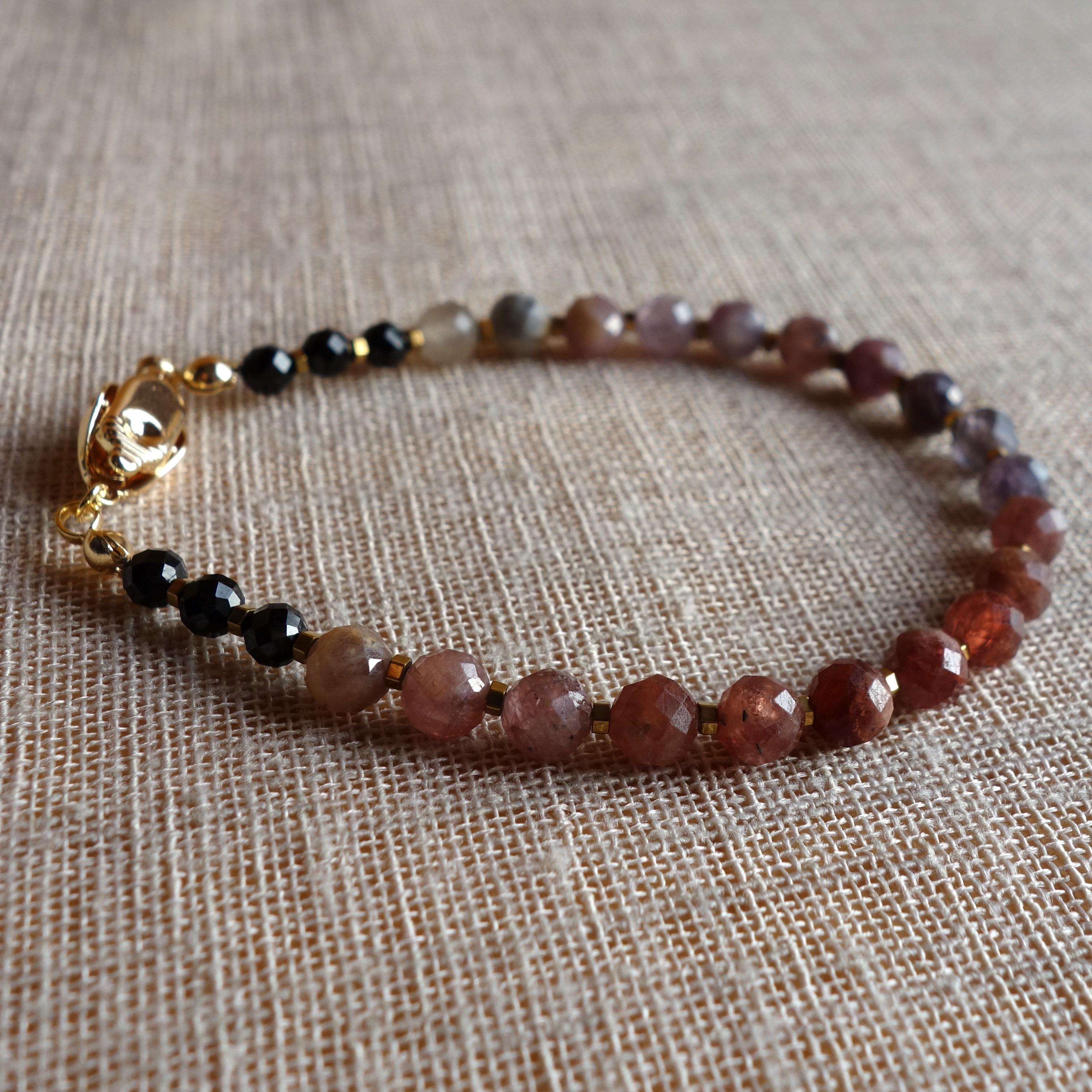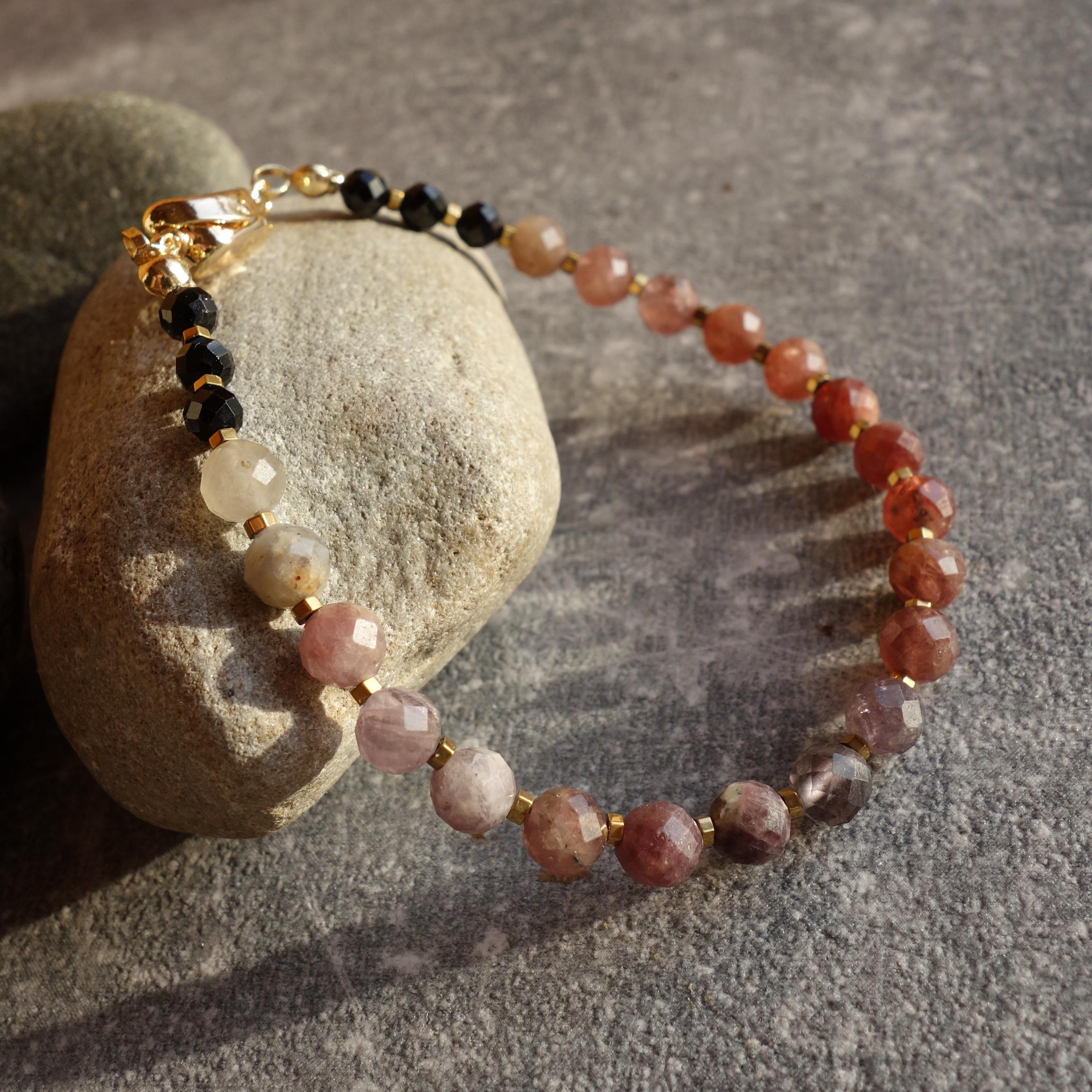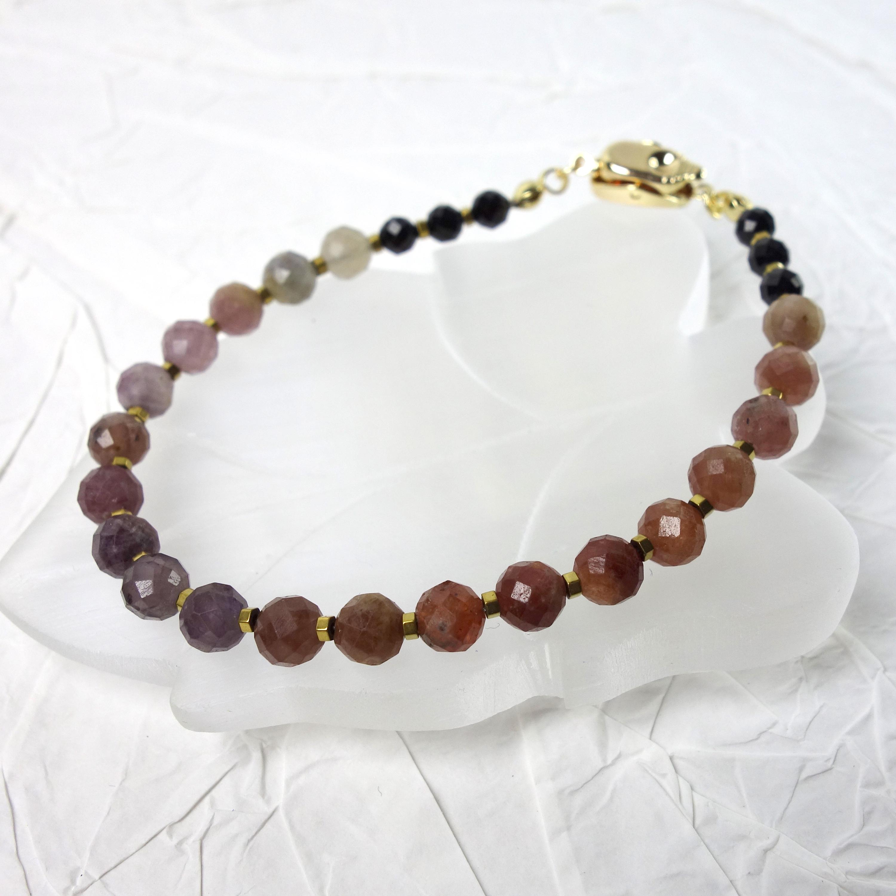 This handmade bracelet features a smooth gradient of natural faceted spinel beads — from warm pink tones to deep, glossy black. The larger 5.5 mm pink spinel beads create a soft, gentle color flow, while the 4 mm black spinel adds a clean, contrasting finish near the clasp.