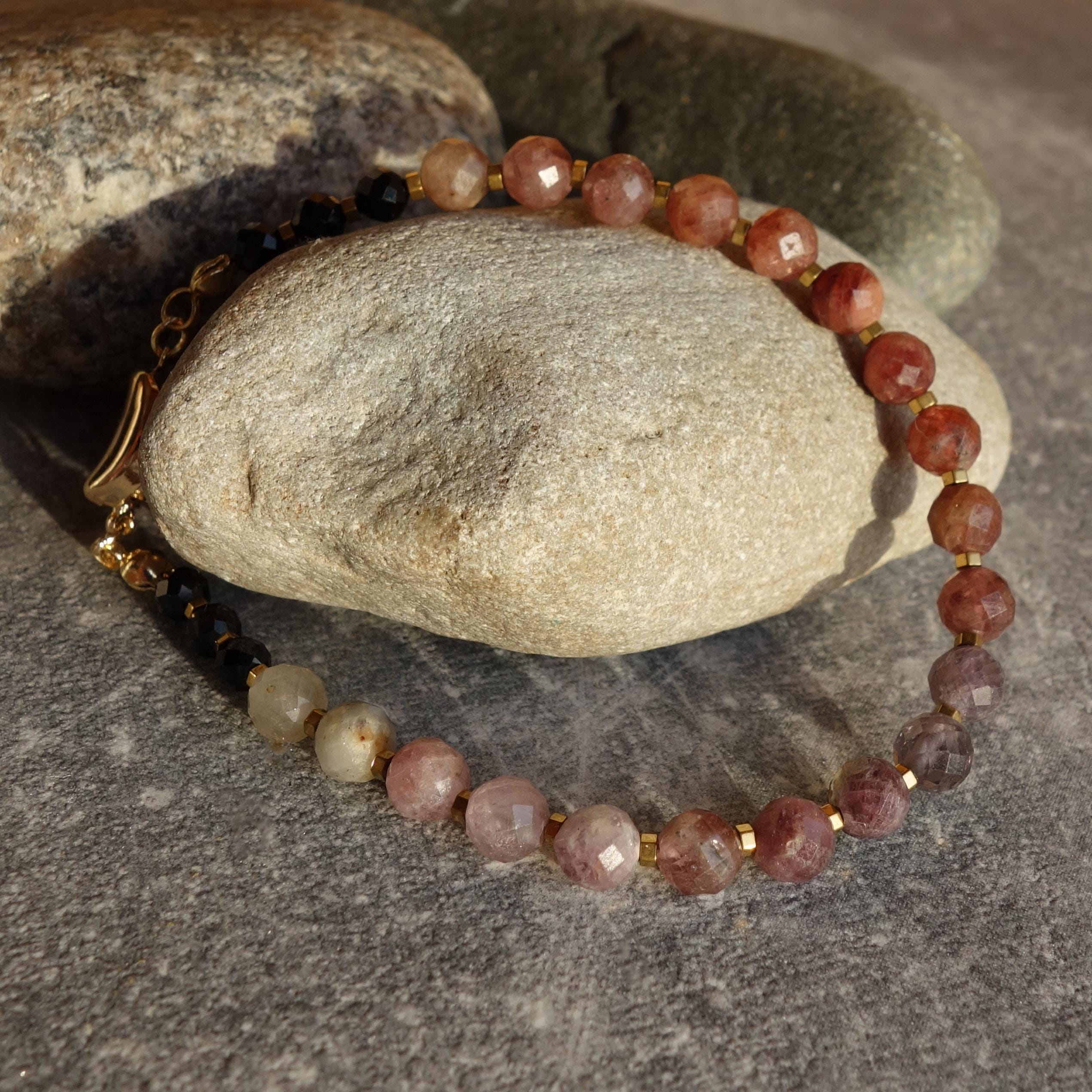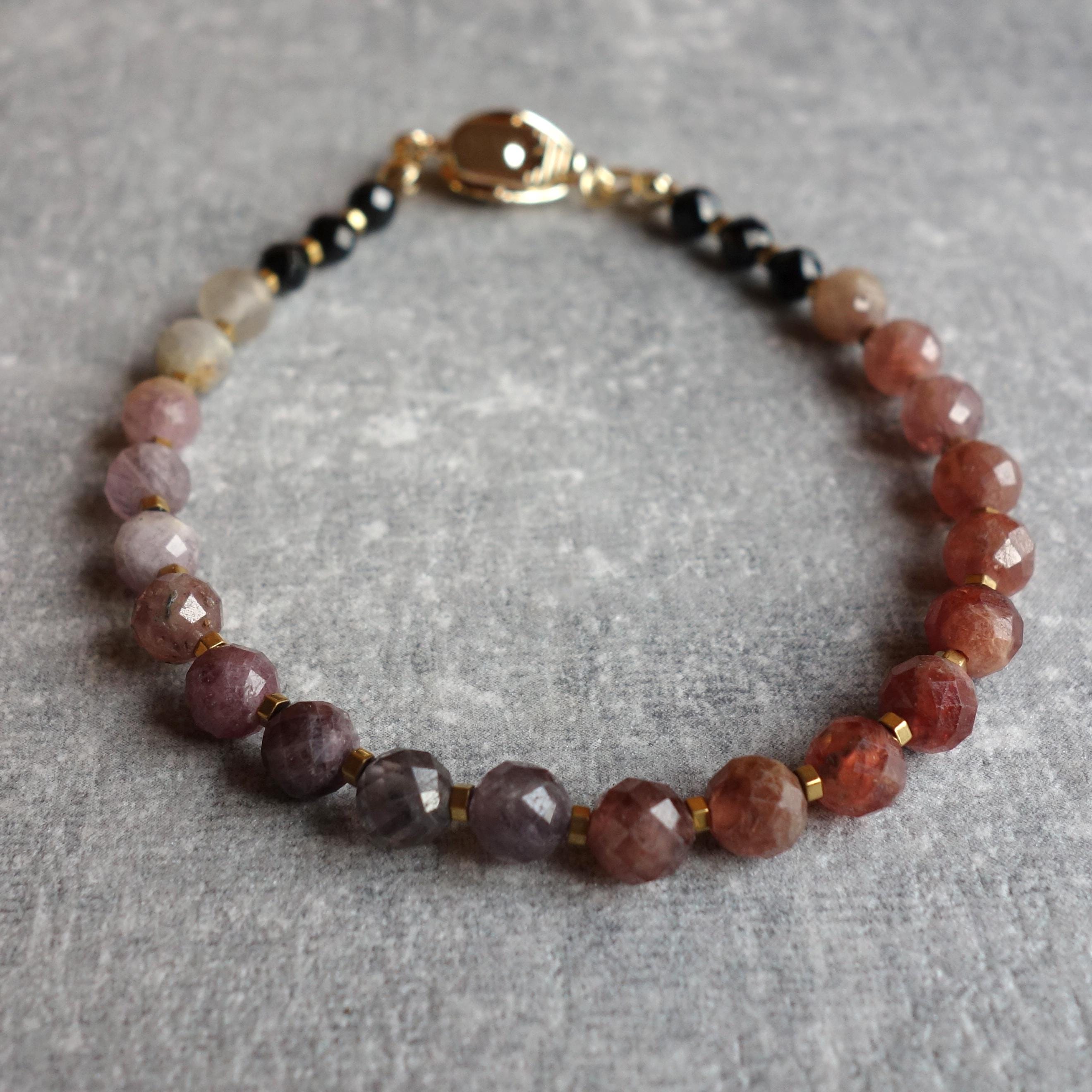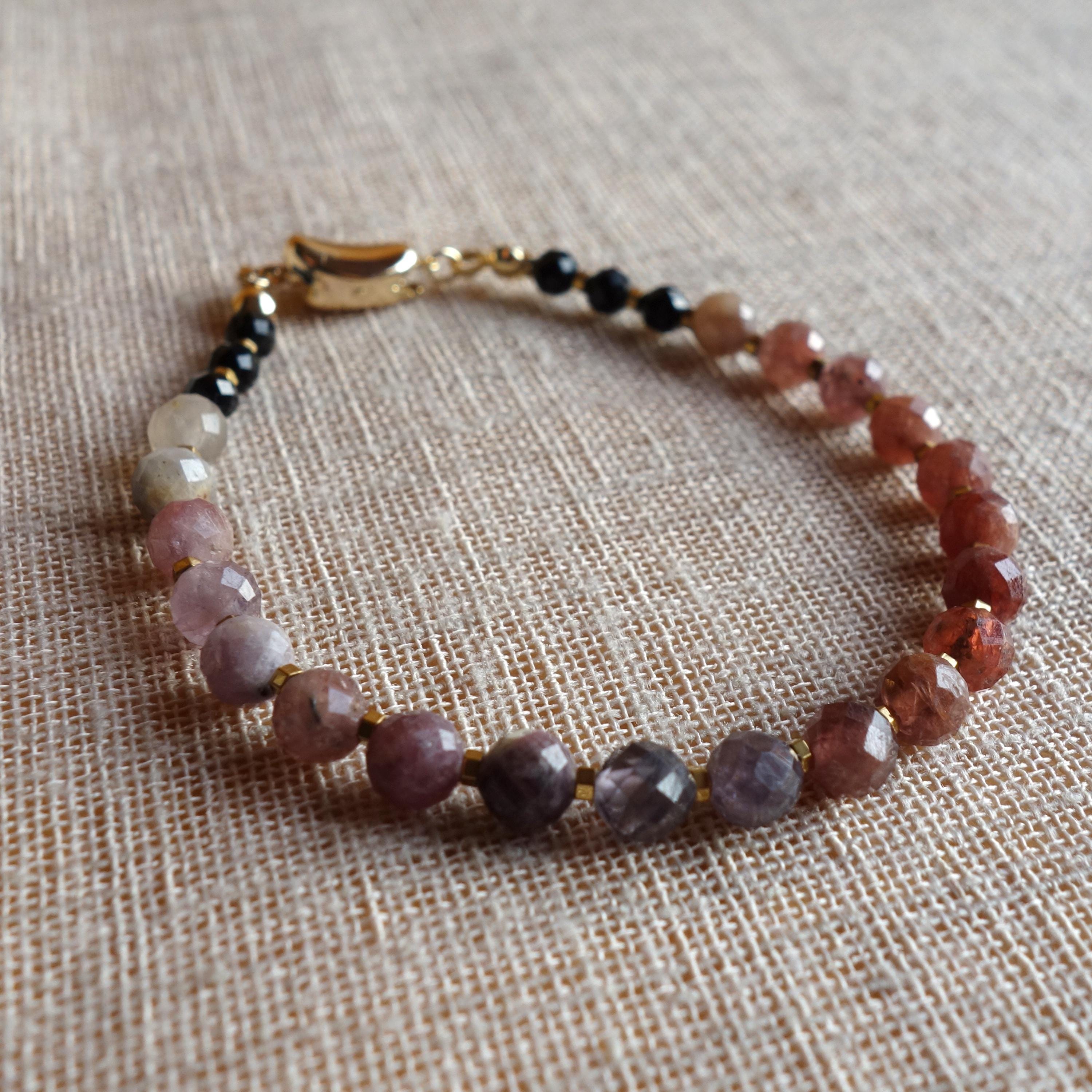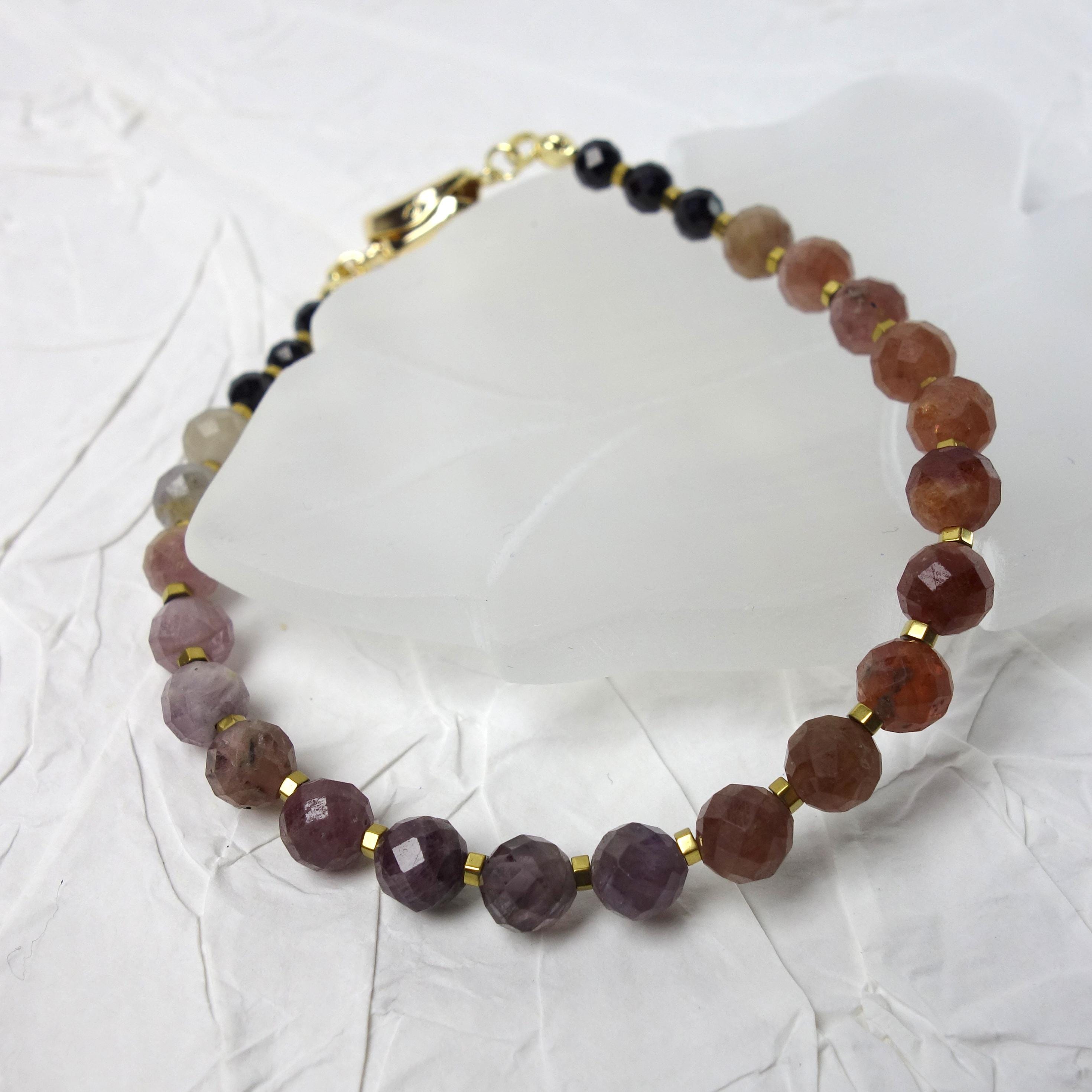 This handmade bracelet features a smooth gradient of natural faceted spinel beads — from warm pink tones to deep, glossy black. The larger 5.5 mm pink spinel beads create a soft, gentle color flow, while the 4 mm black spinel adds a clean, contrasting finish near the clasp.