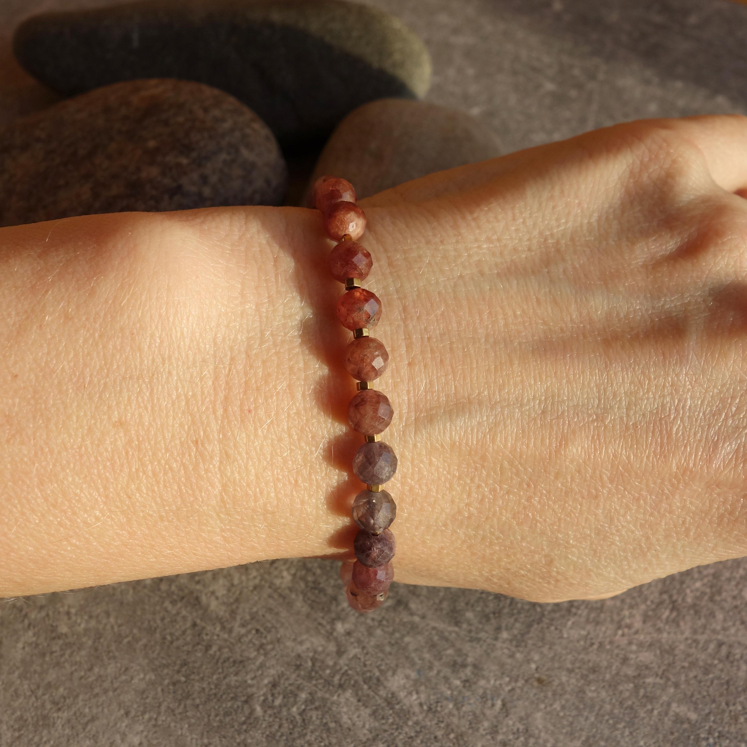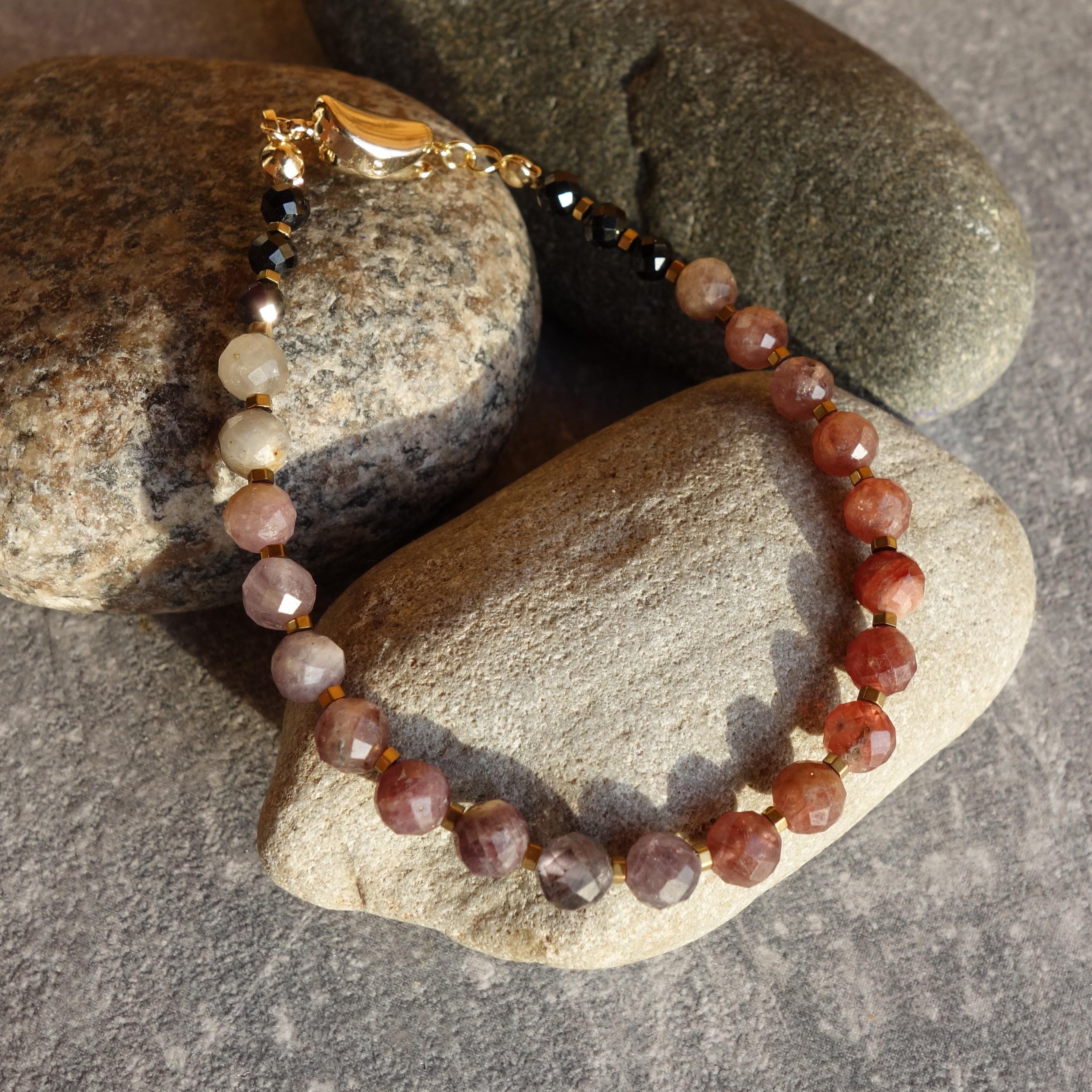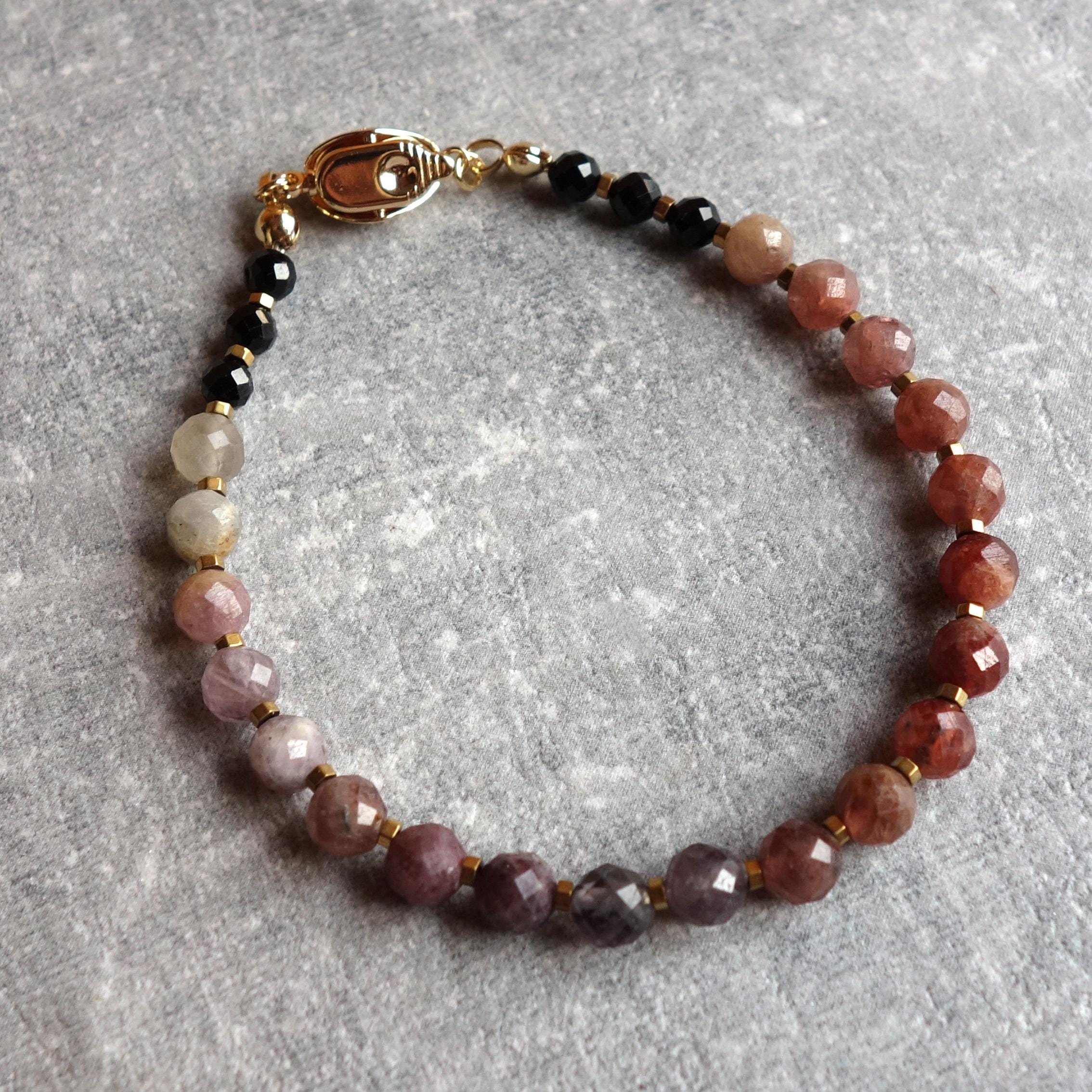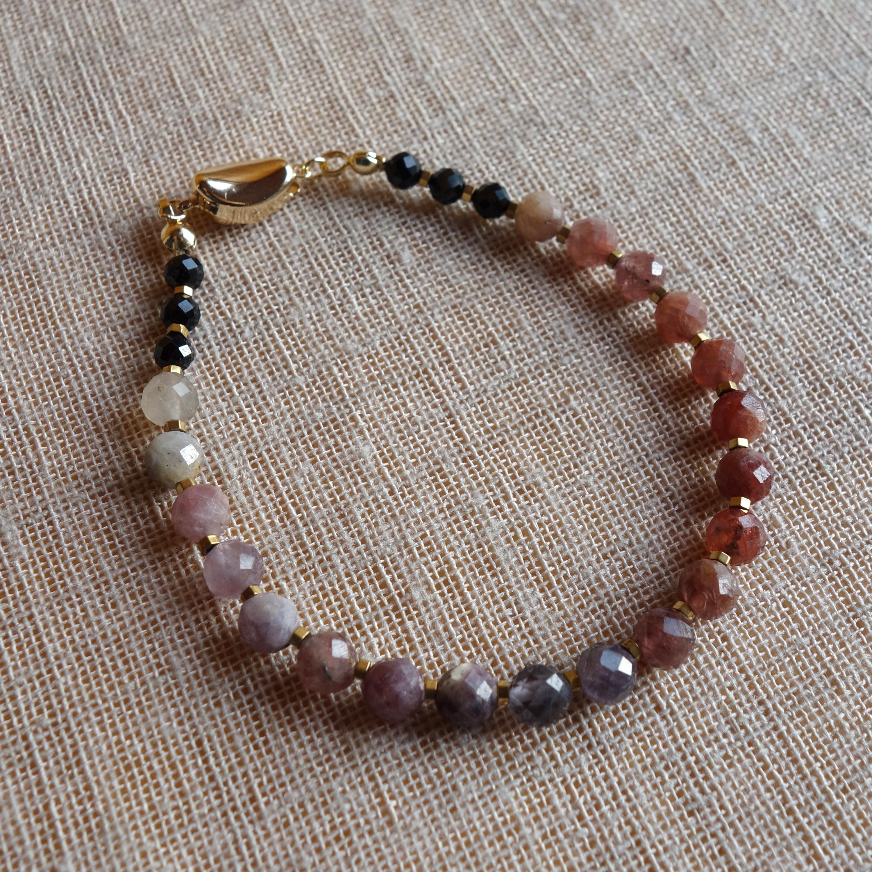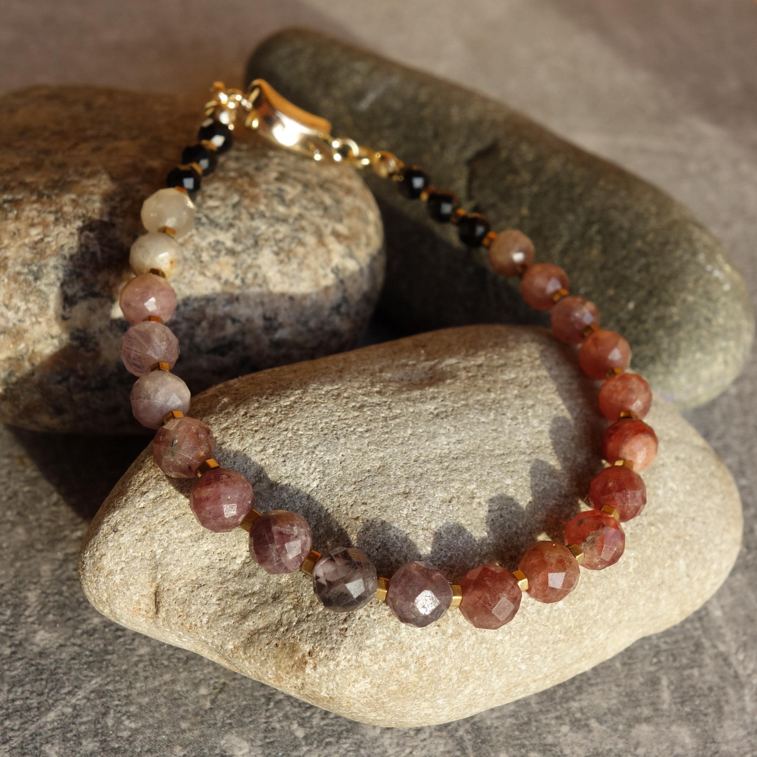 This handmade bracelet features a smooth gradient of natural faceted spinel beads — from warm pink tones to deep, glossy black. The larger 5.5 mm pink spinel beads create a soft, gentle color flow, while the 4 mm black spinel adds a clean, contrasting finish near the clasp.