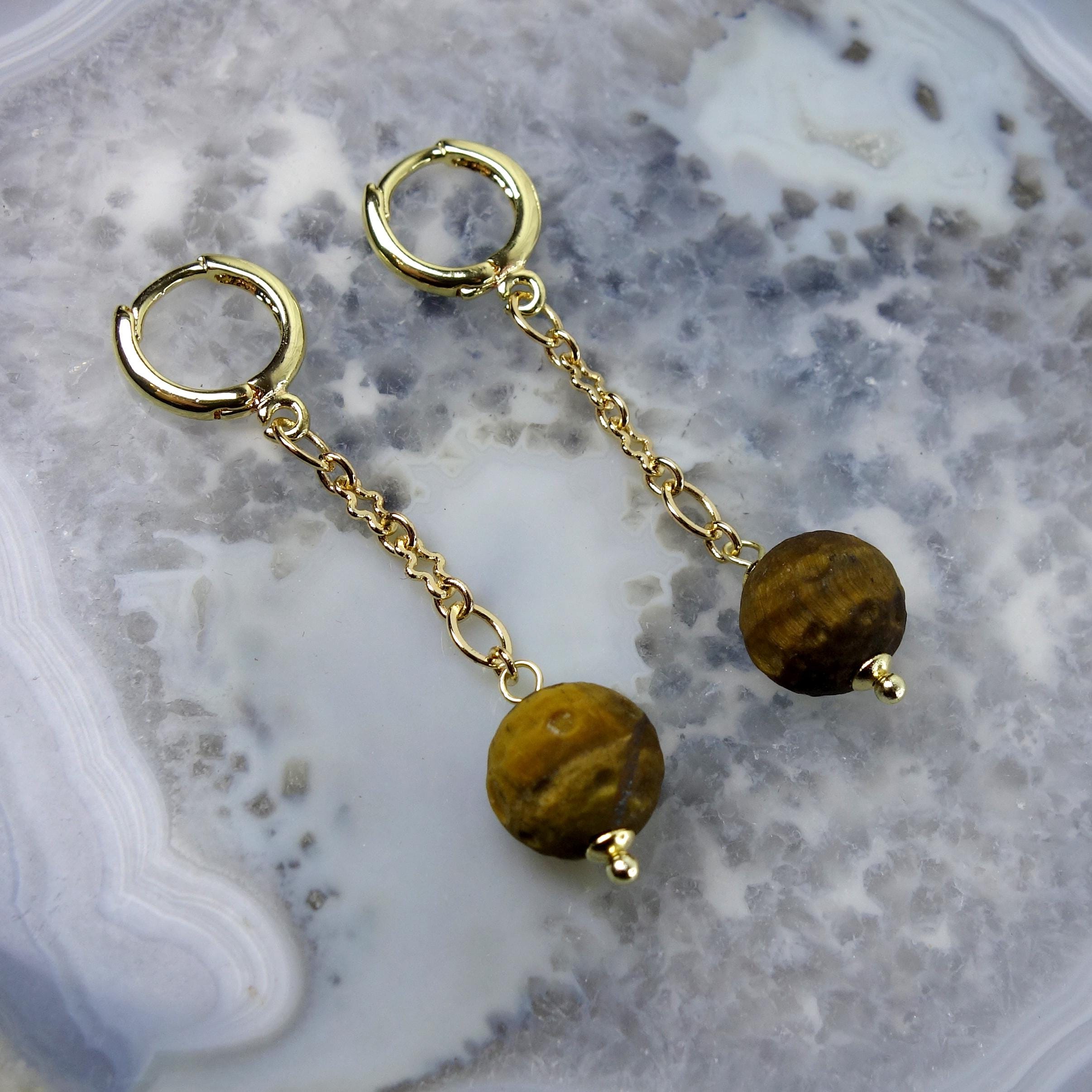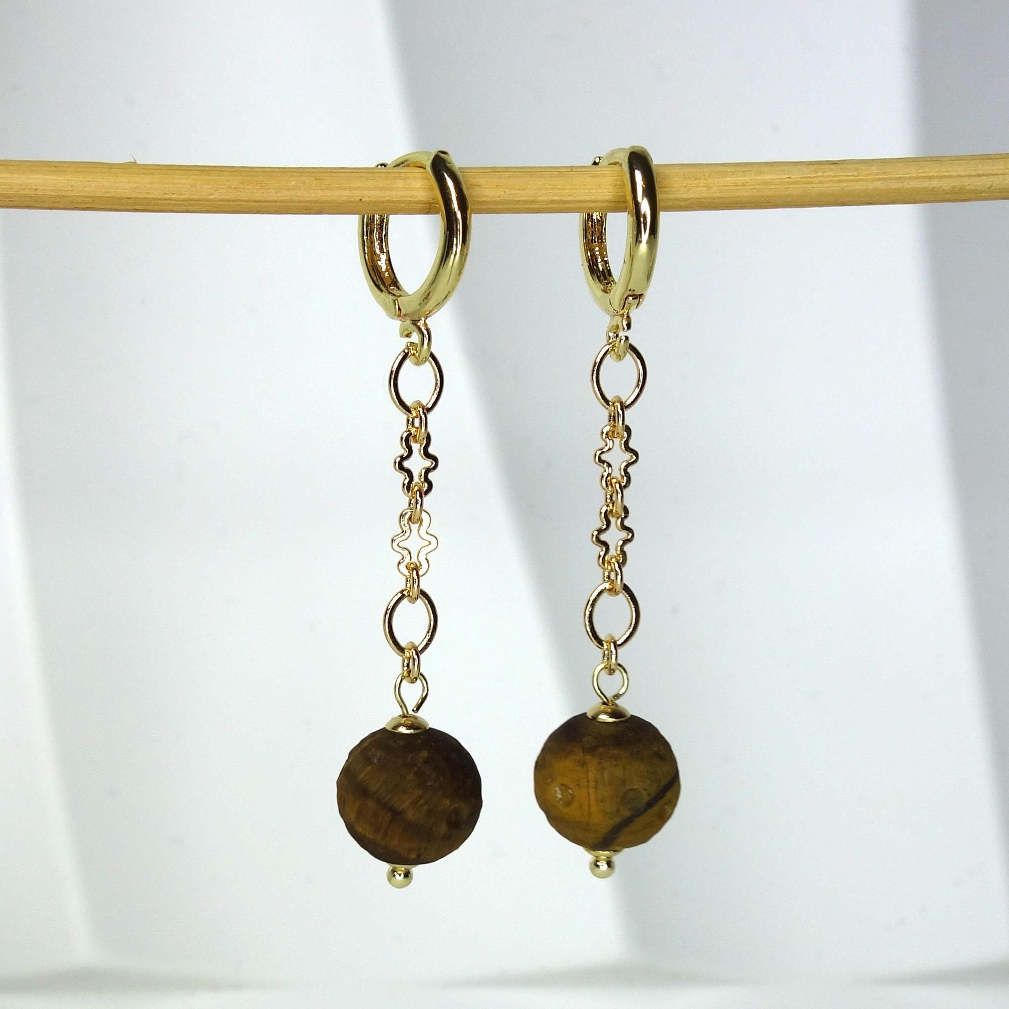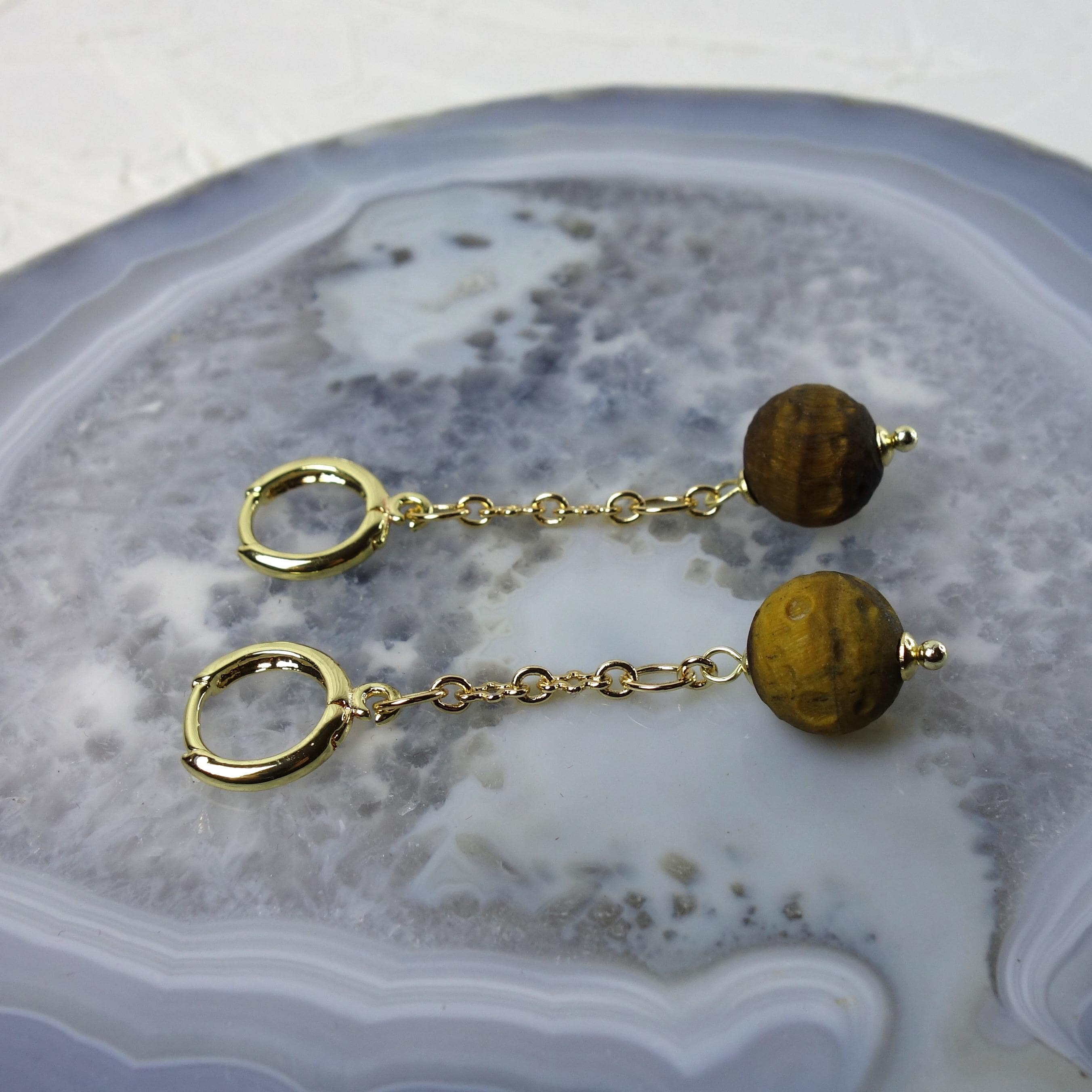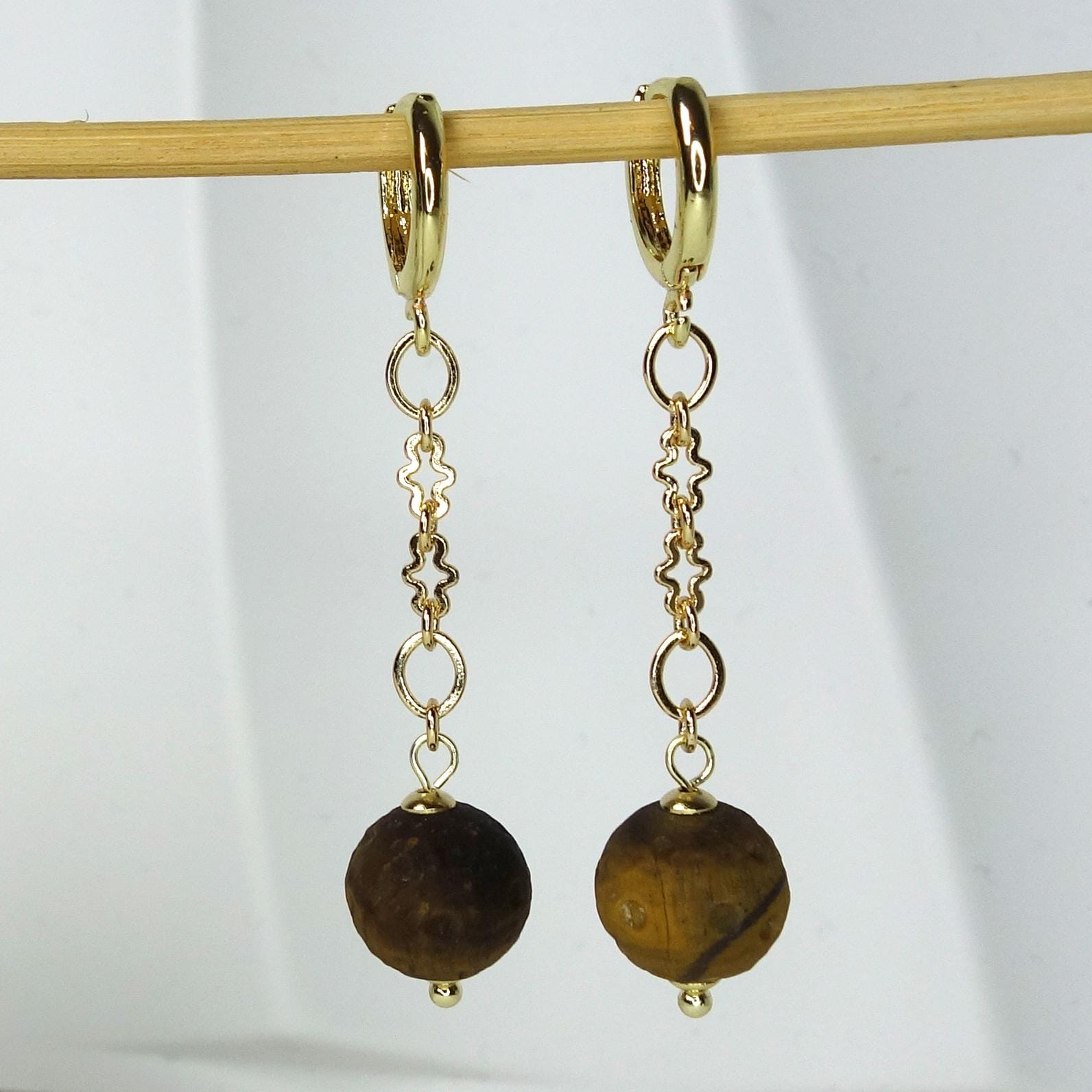 Elegant dangle earrings featuring natural tiger's eye gemstone beads paired with shiny gold-plated stainless steel hoops and chain. The warm brown and golden tones of tiger’s eye create a subtle yet eye-catching look that suits both casual and dressy outfits.