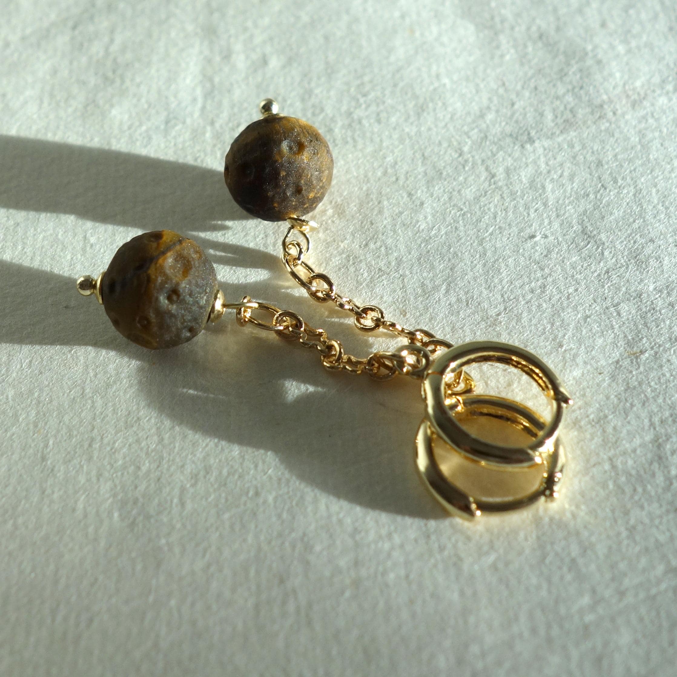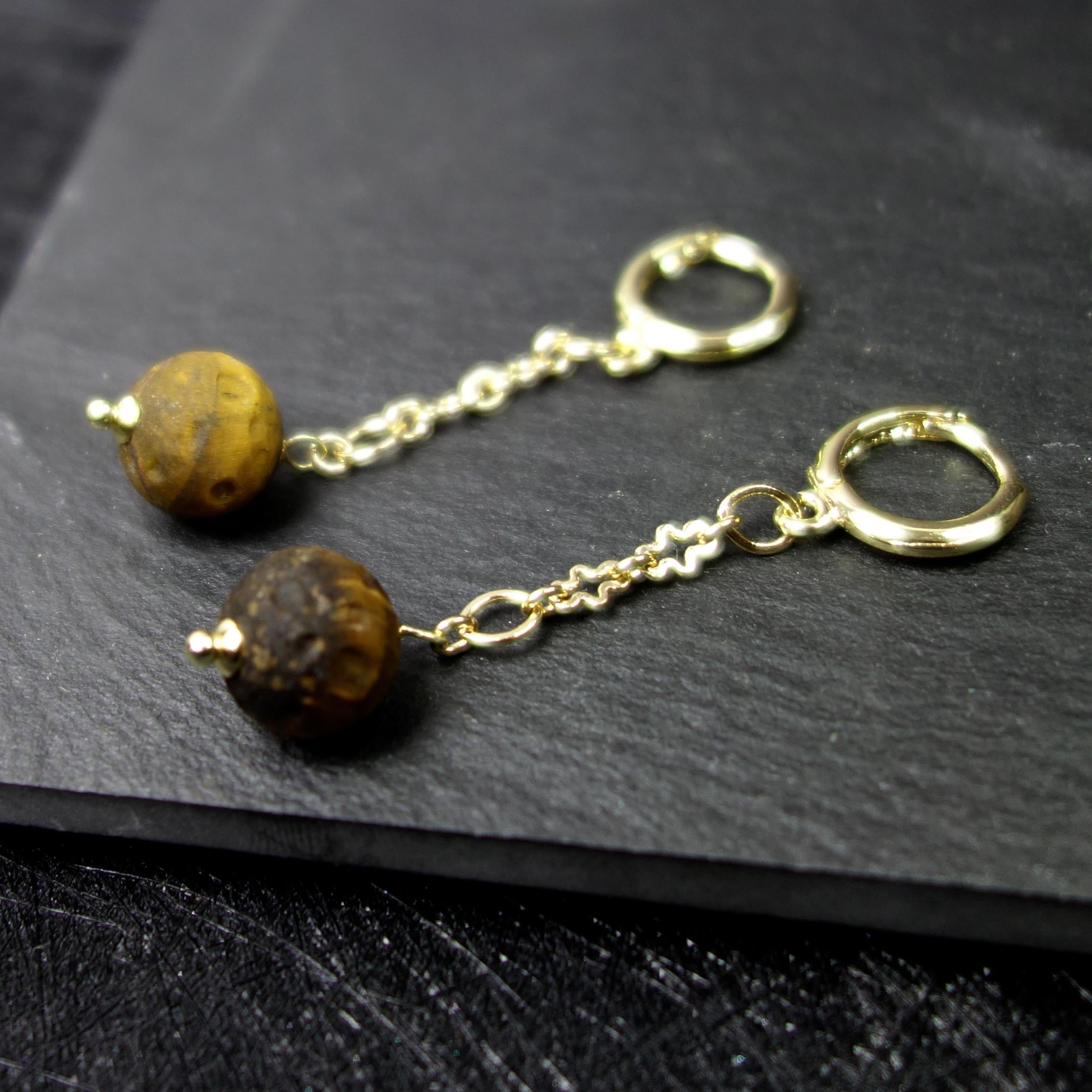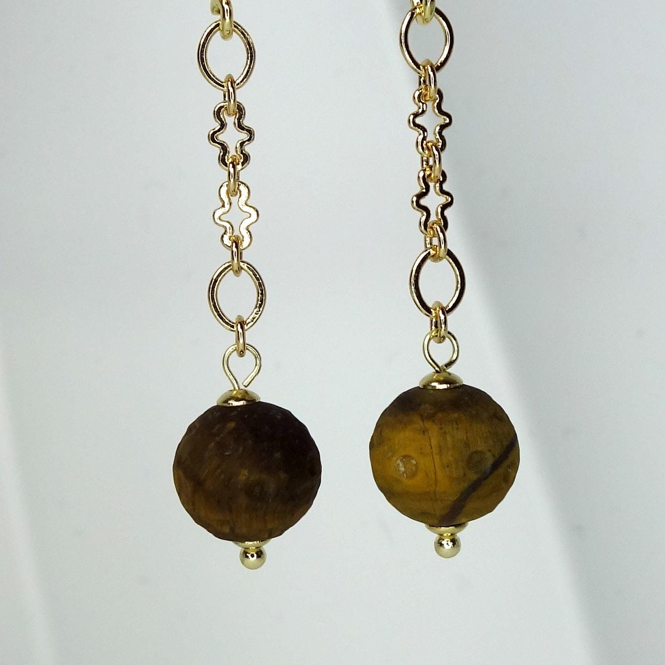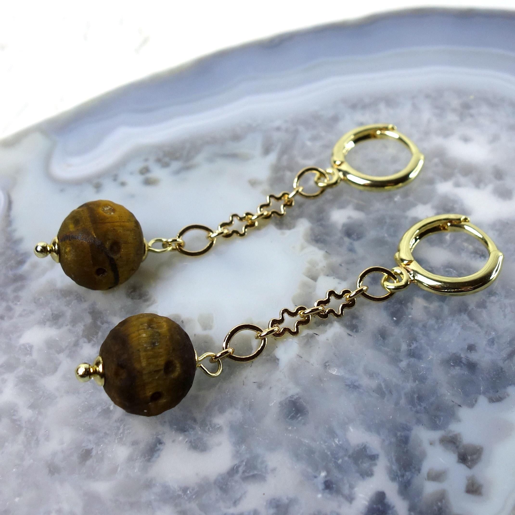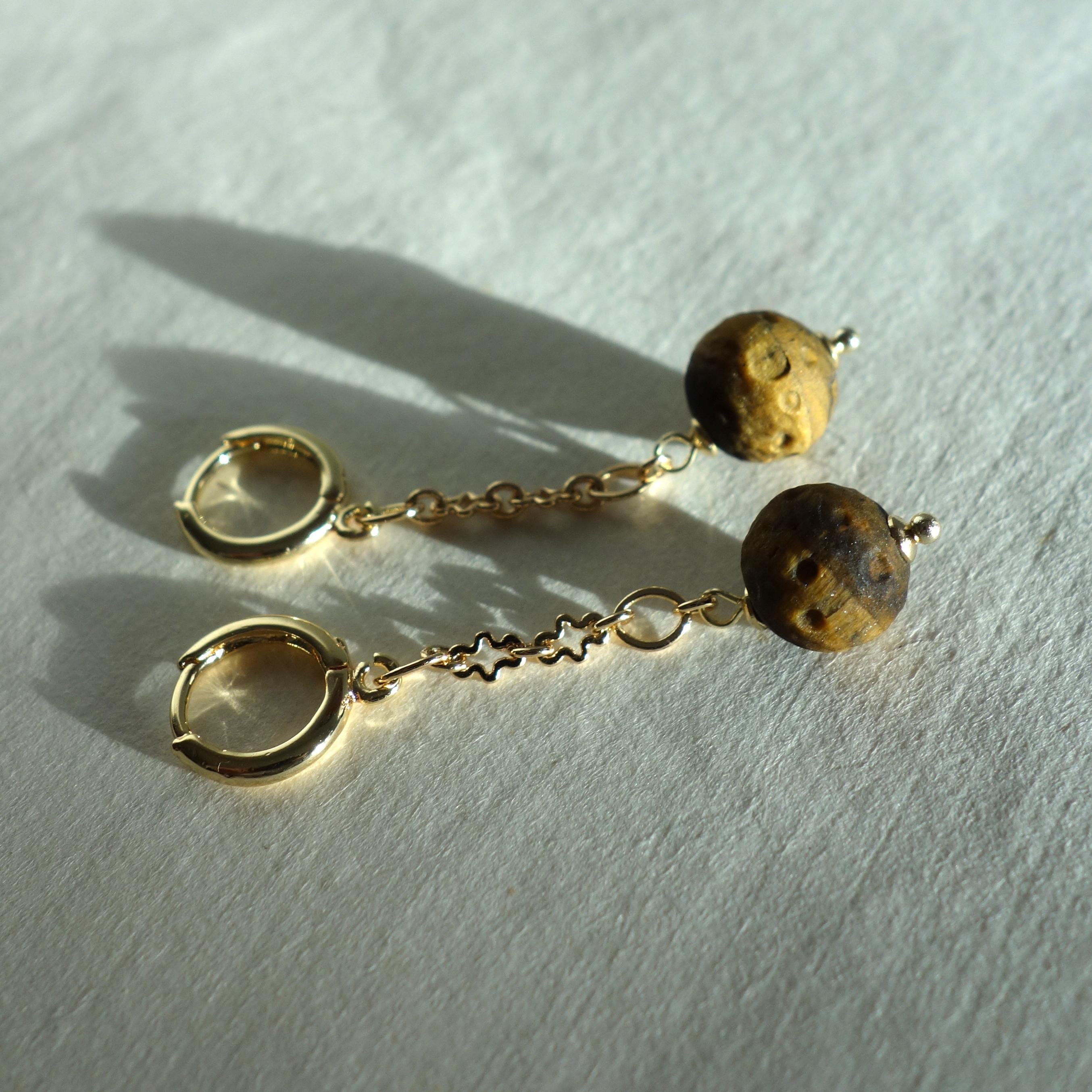 The 10 mm round tiger’s eye beads have a planet-like shape and pattern, giving the earrings a unique cosmic touch.
