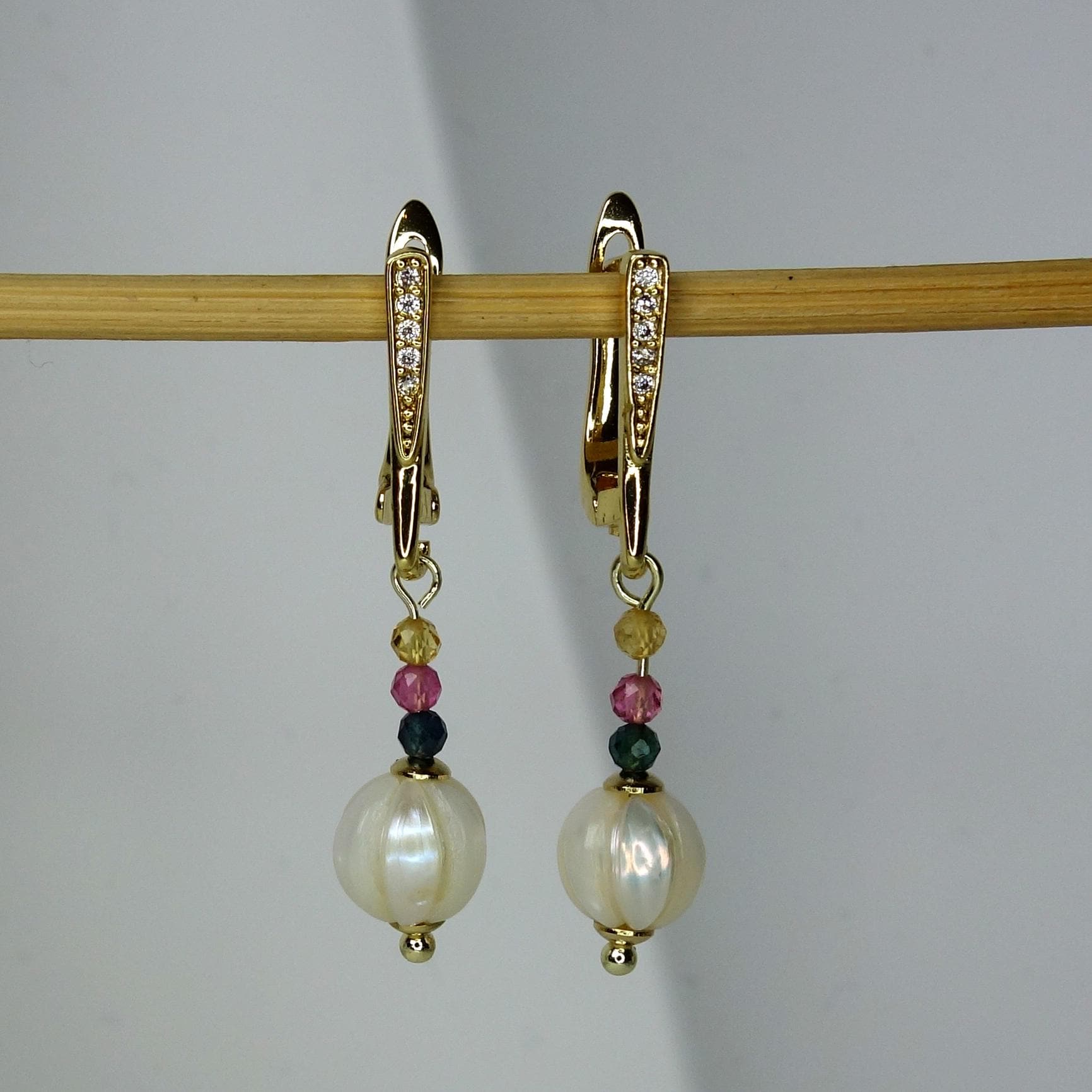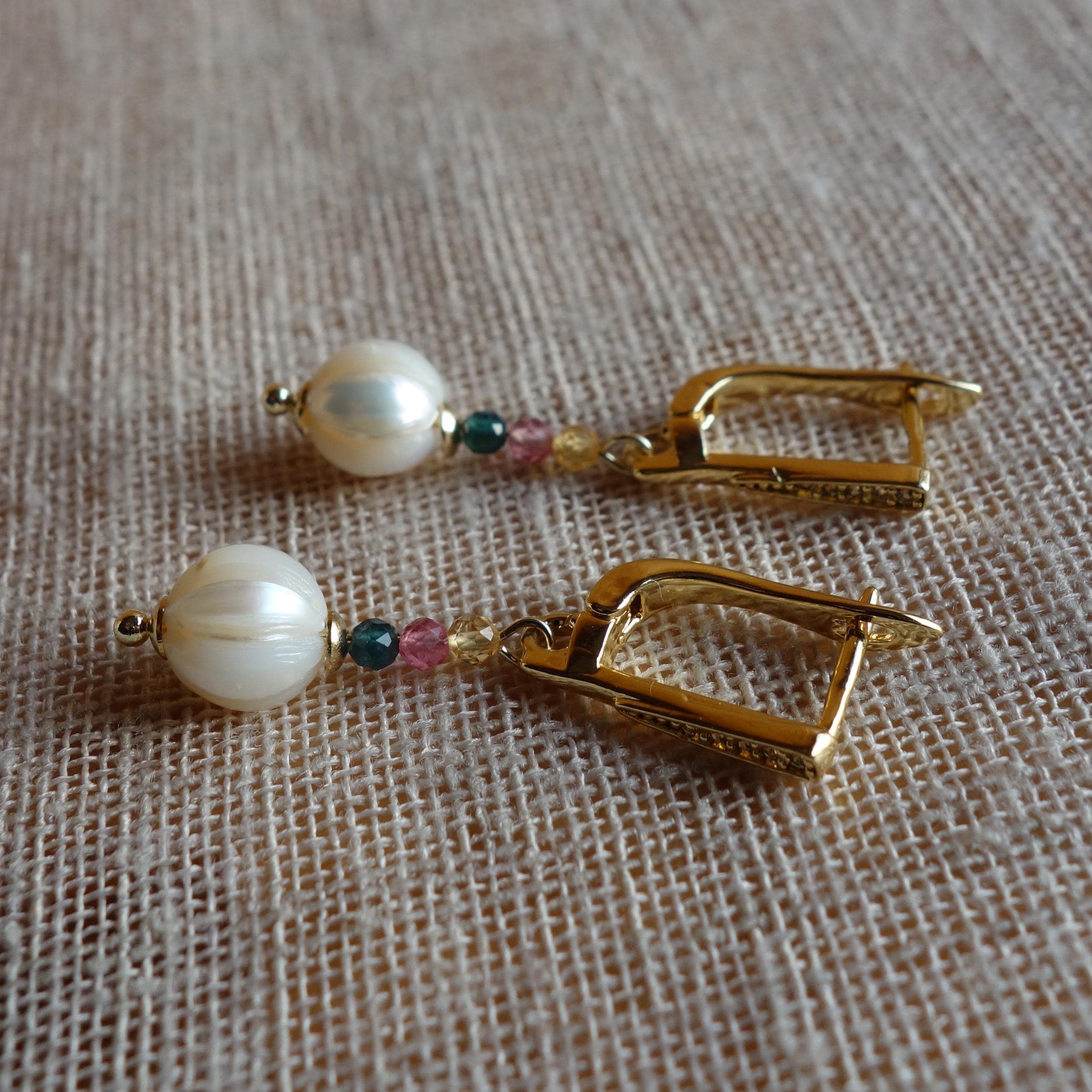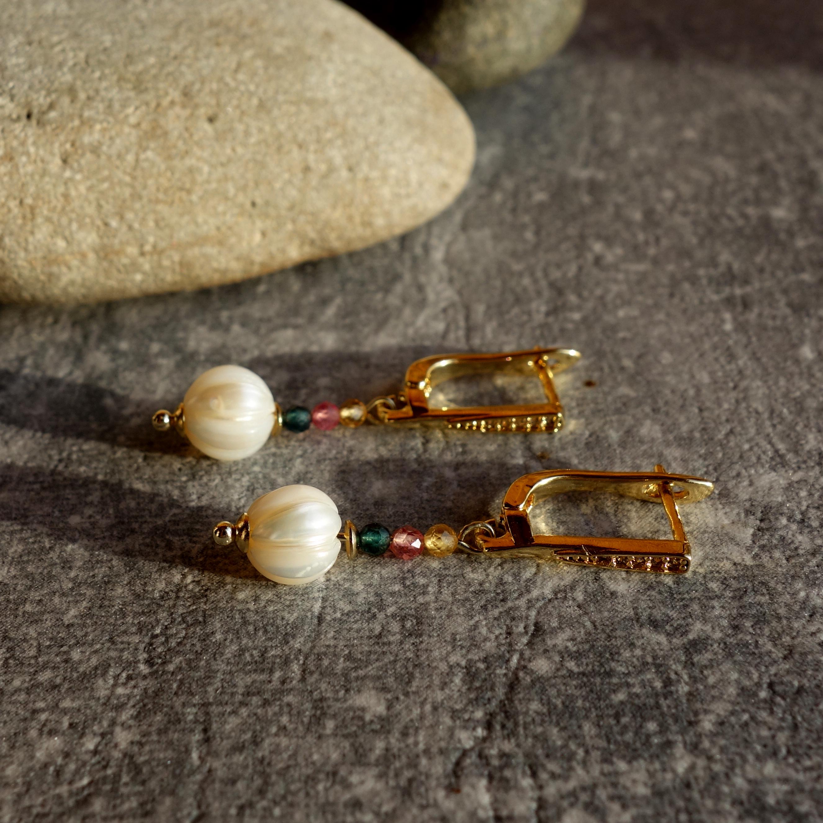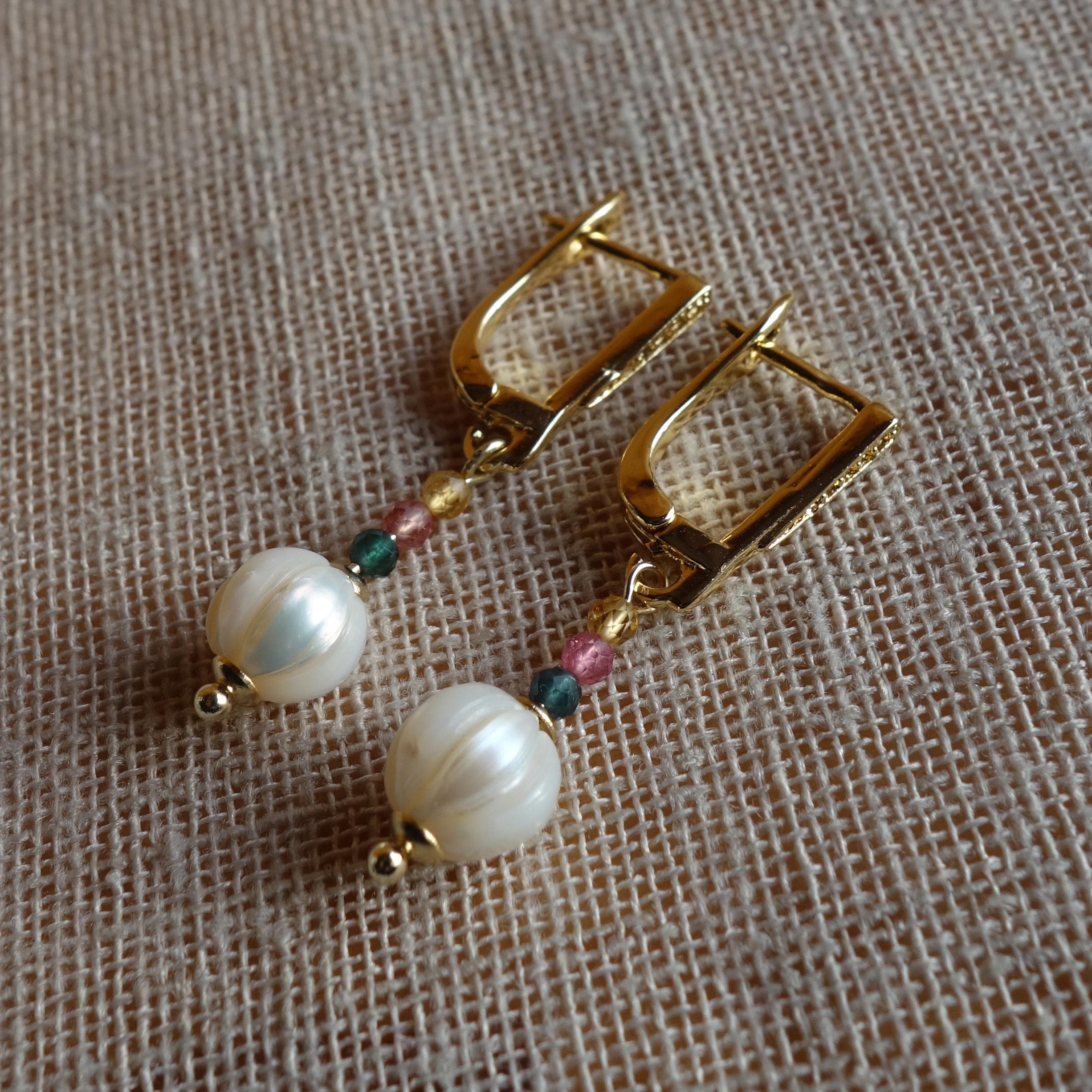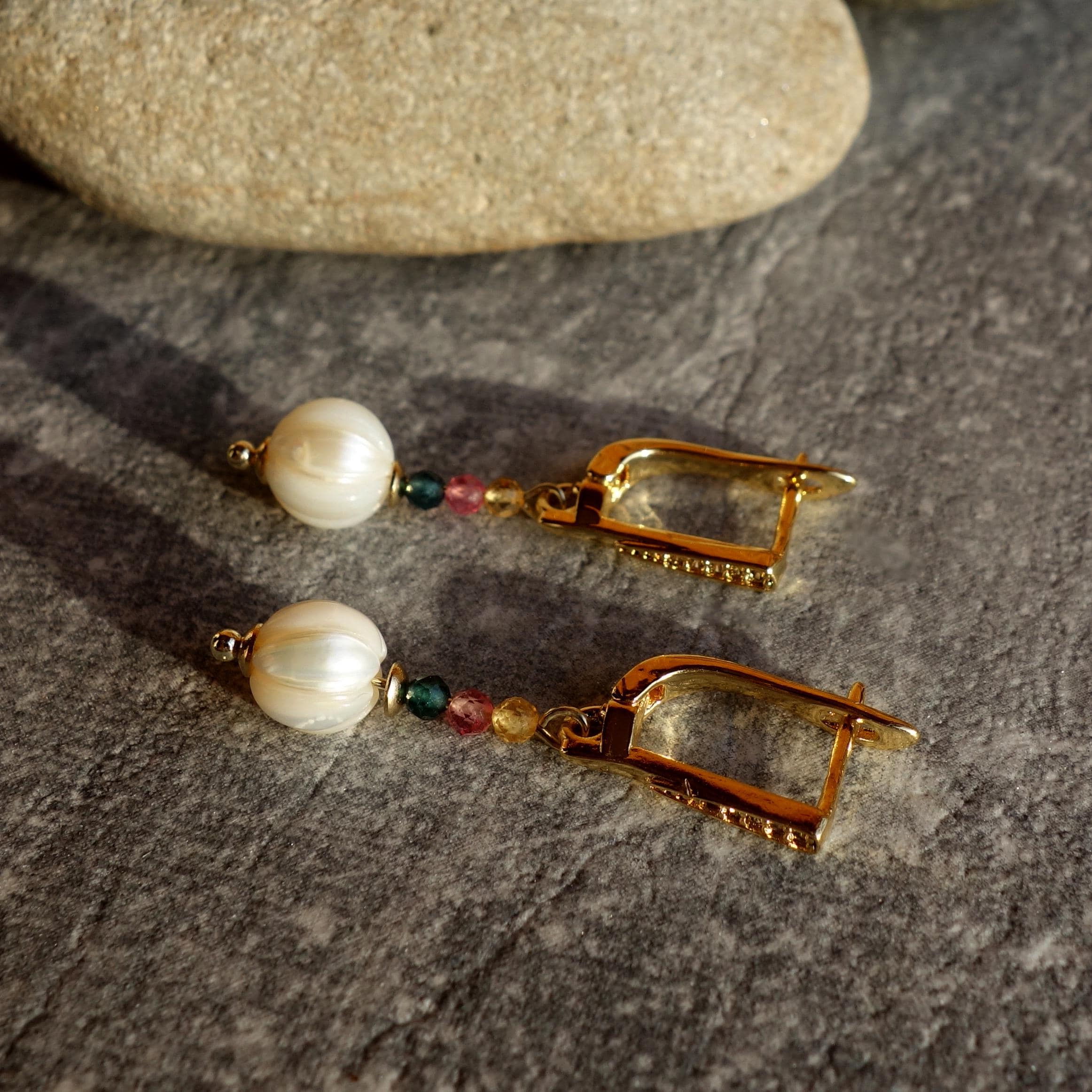 These earrings feature faceted freshwater pearls, carefully cut to enhance their natural luster and light reflection.