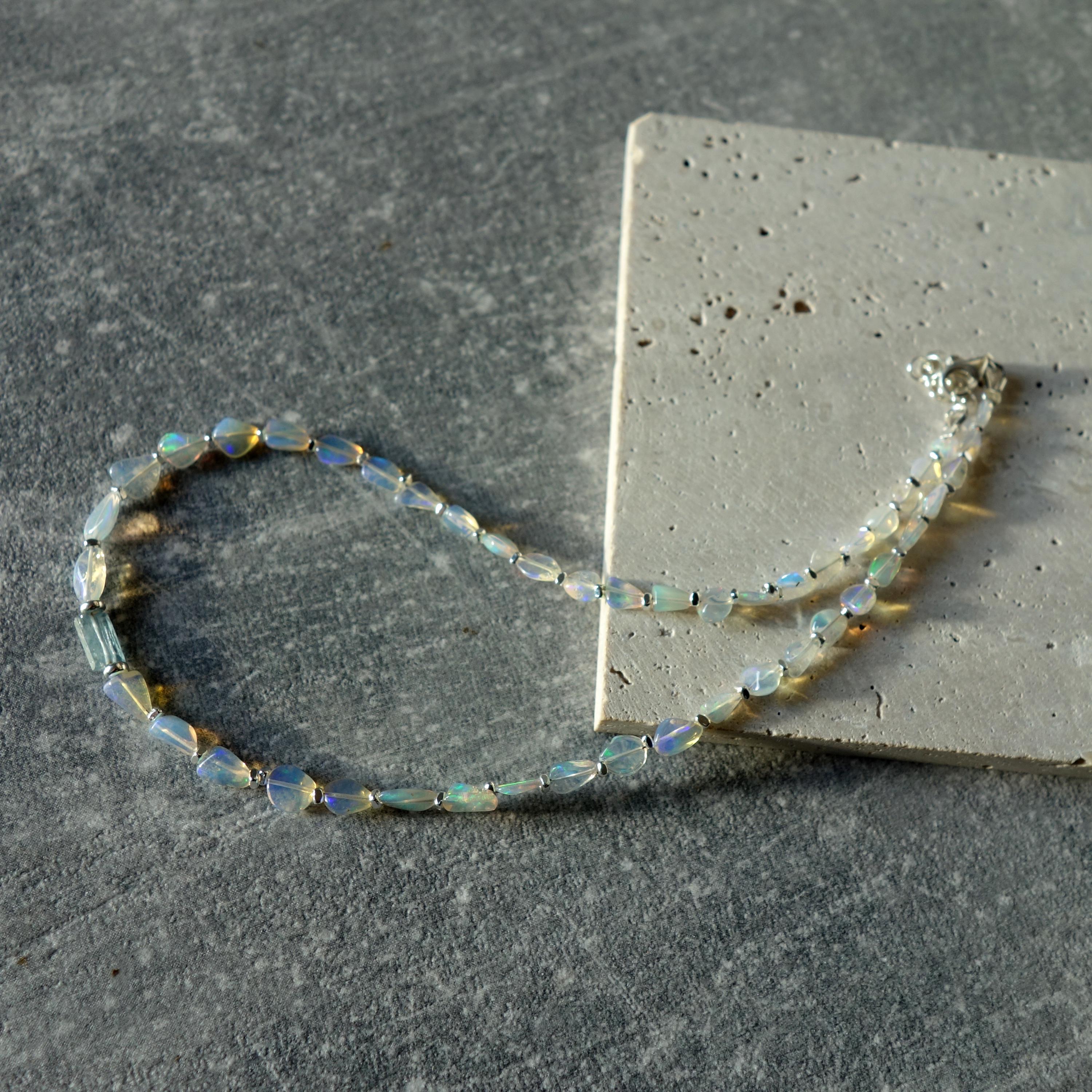 This delicate choker necklace features natural opals with mesmerizing iridescent fire and soft blue kyanite accents, all set in glaming 925 sterling silver. The 34 cm length plus 2 cm extender creates a perfect fit for layering or standalone wear, with opals catching light beautifully against the skin.