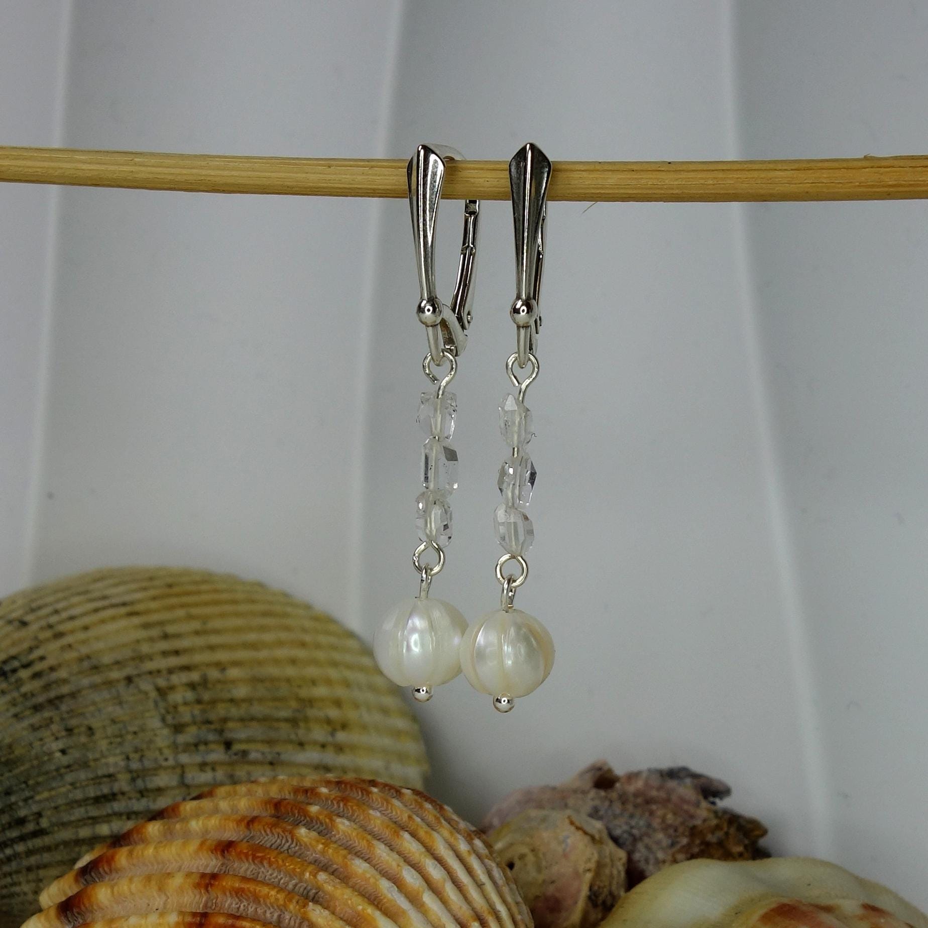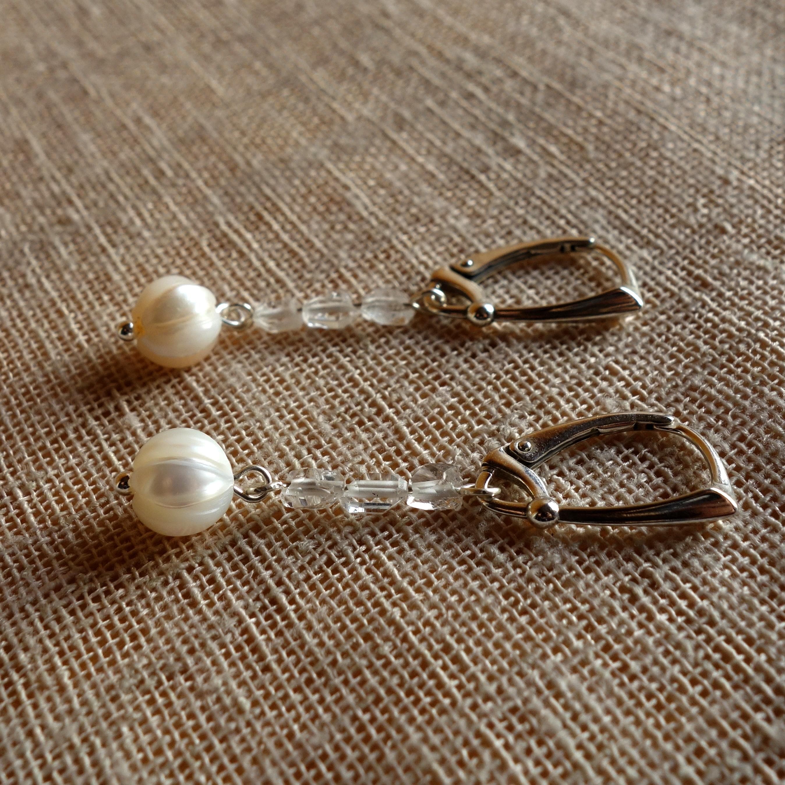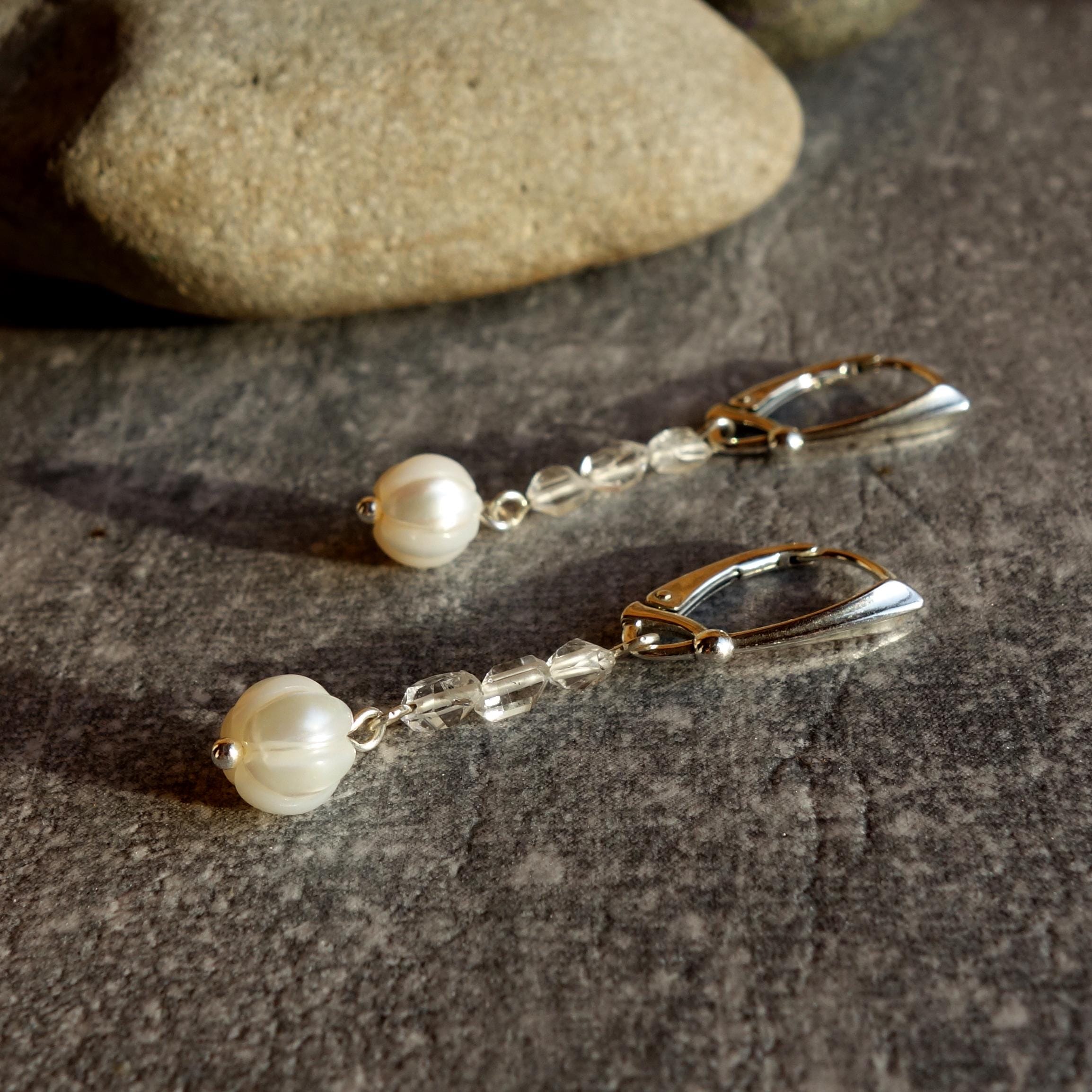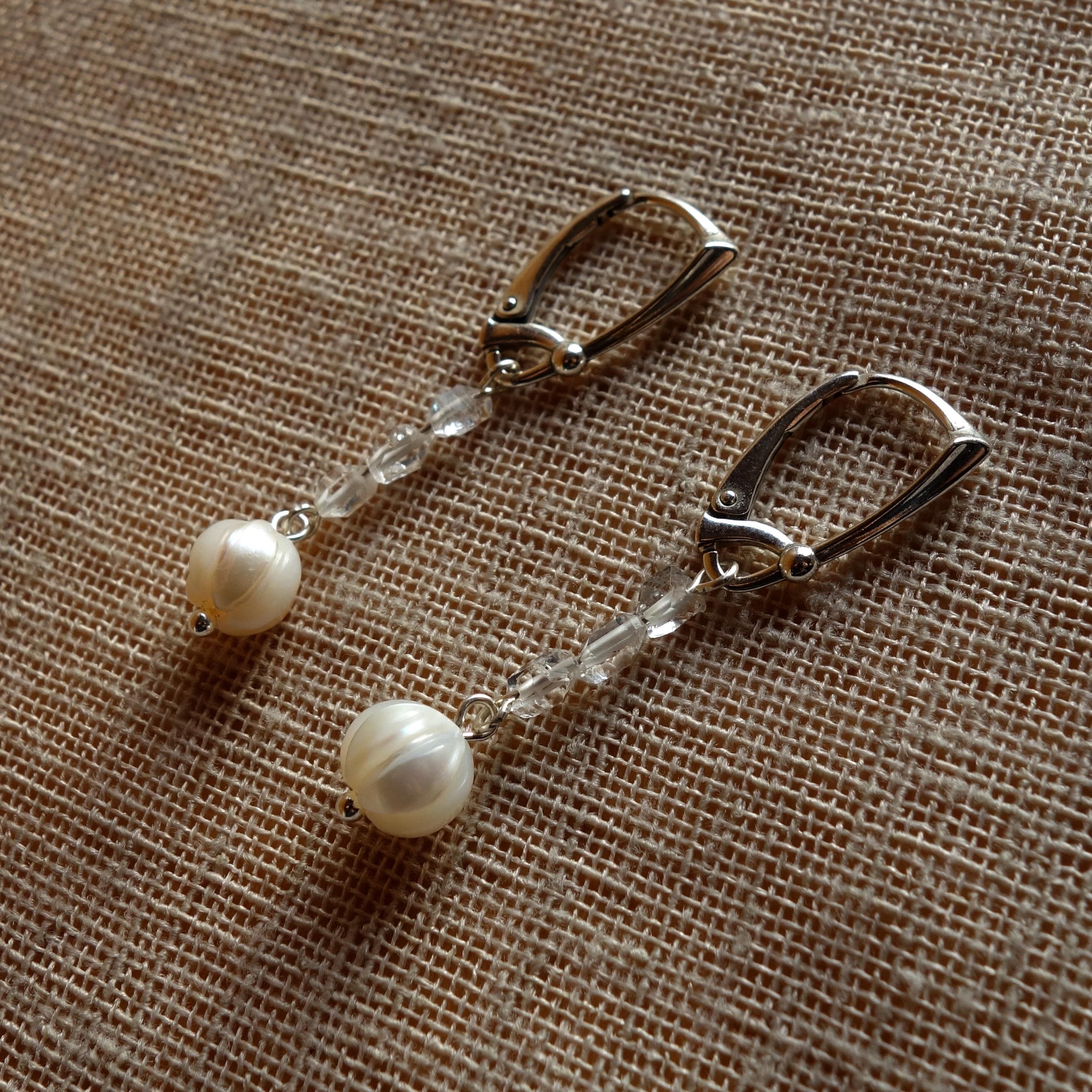 These delicate earrings combine clear Herkimer “diamond” crystals with softly shimmering faceted pearls, all finished with sleek sterling silver lever-back ear wires. The 4 cm length creates an elegant, elongated line that looks refined yet comfortable for all-day wear.