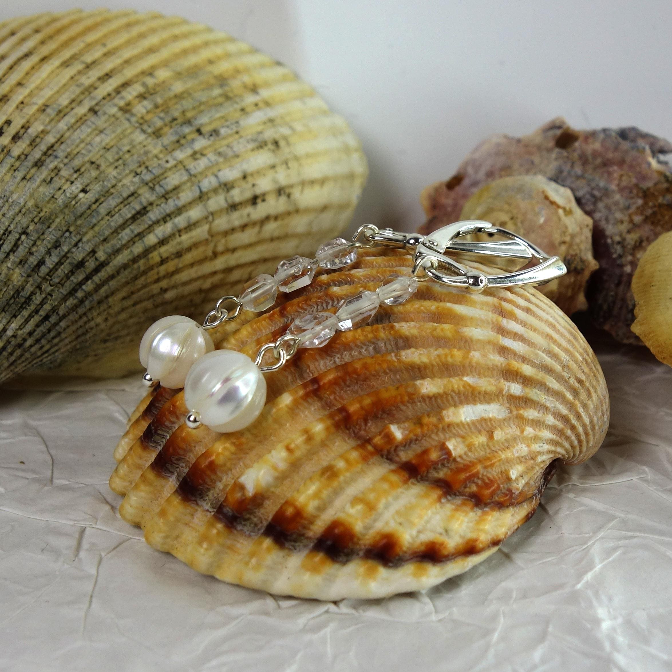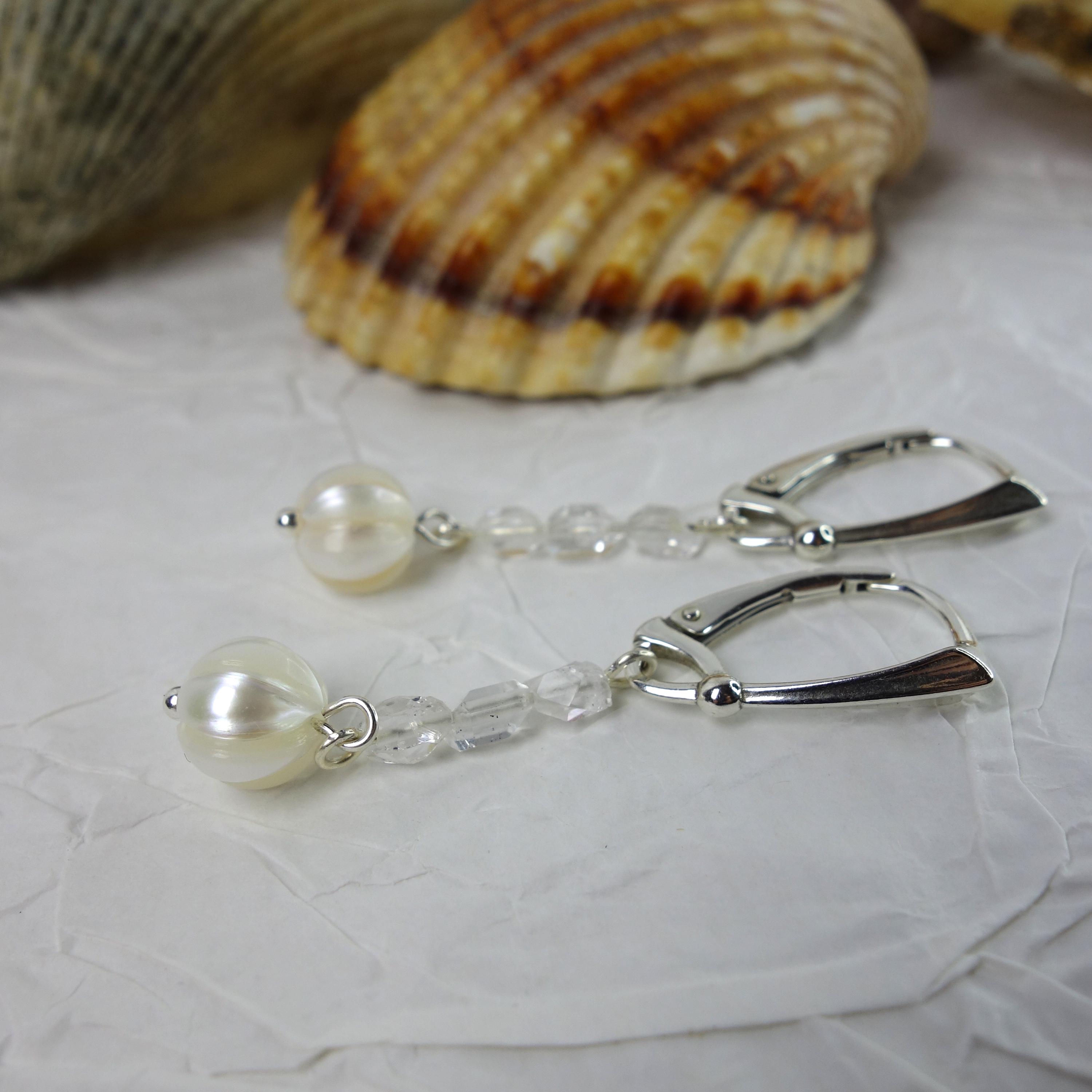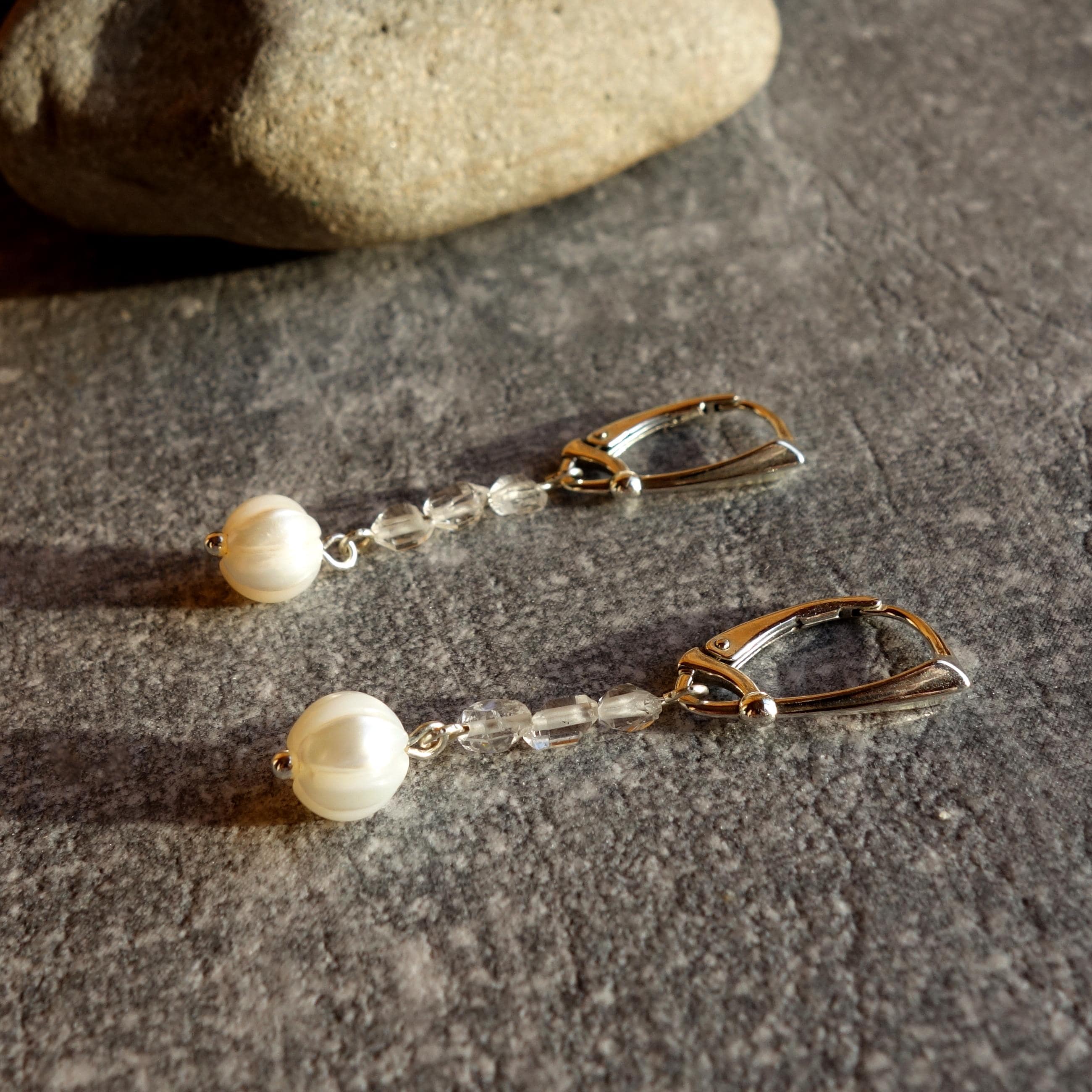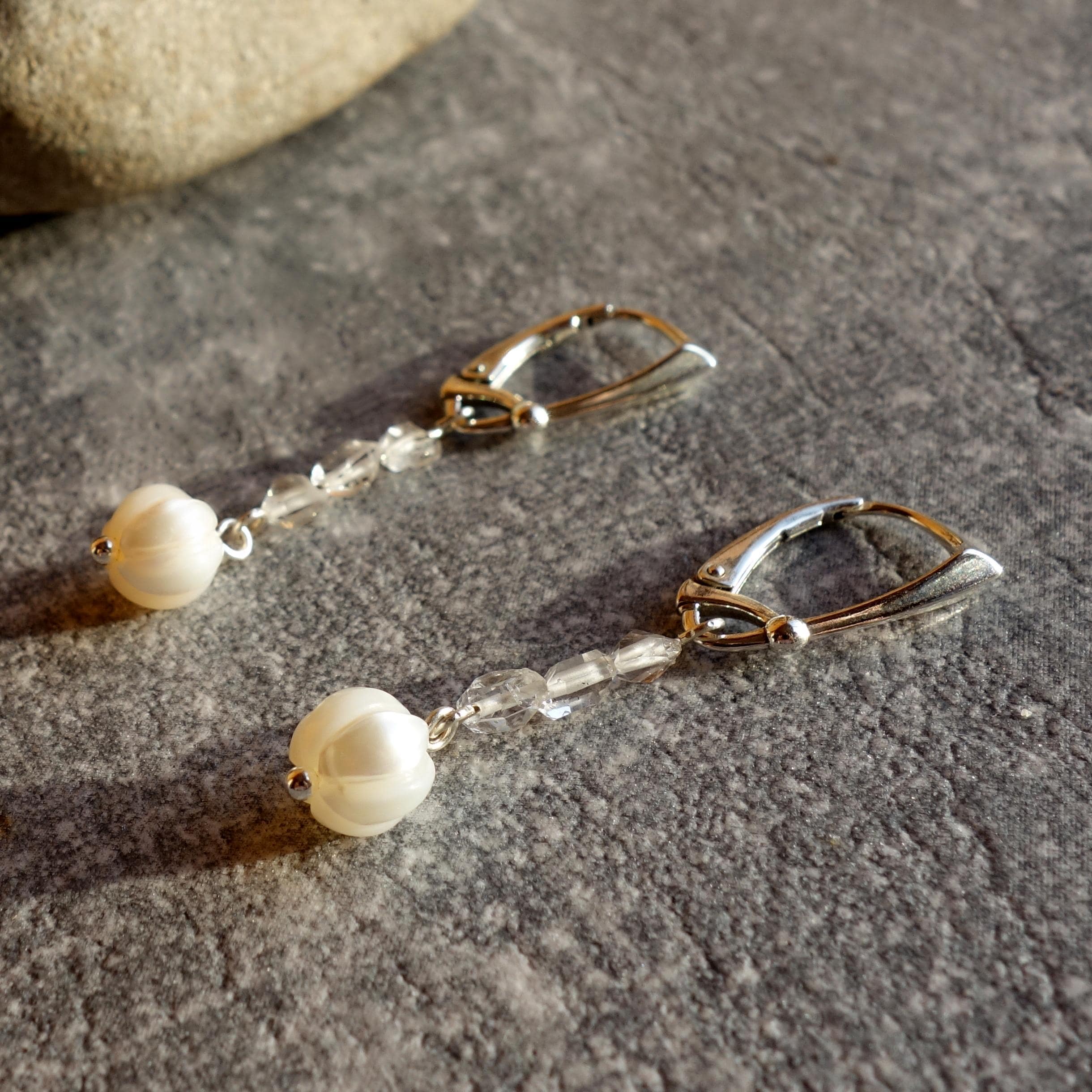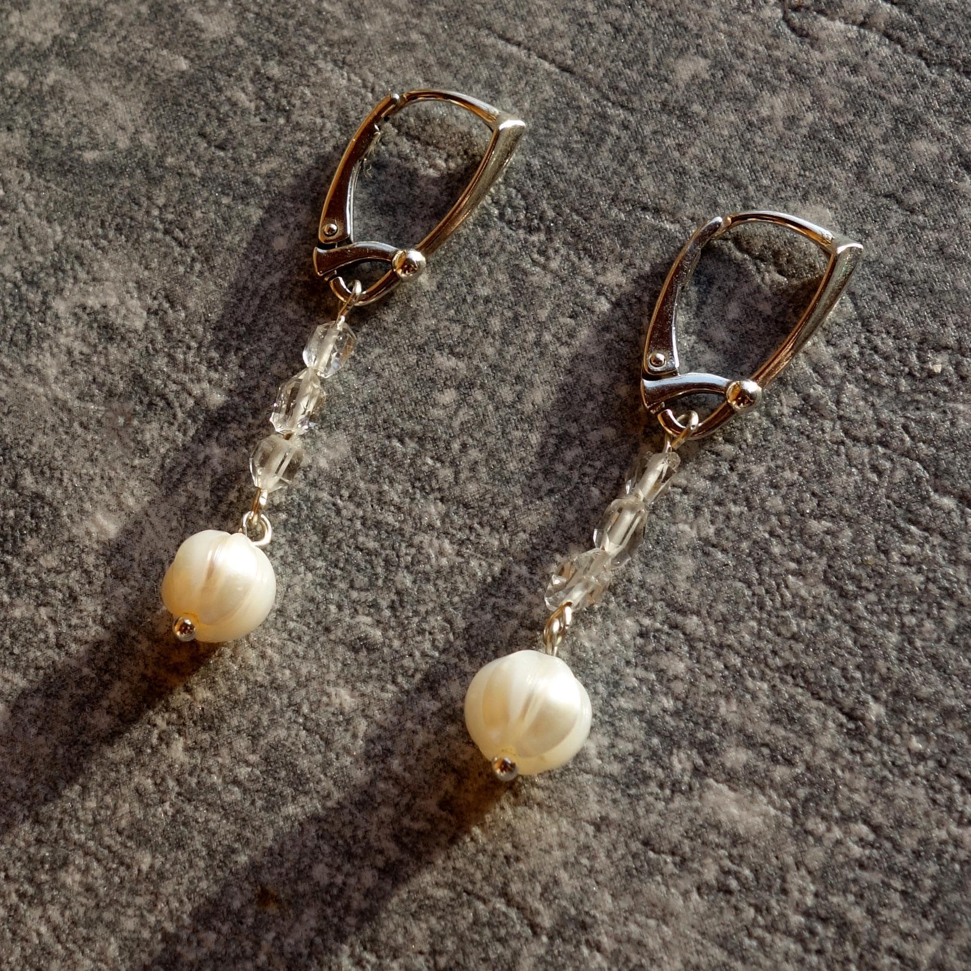 These delicate earrings combine clear Herkimer “diamond” crystals with softly shimmering faceted pearls, all finished with sleek sterling silver lever-back ear wires. The 4 cm length creates an elegant, elongated line that looks refined yet comfortable for all-day wear.