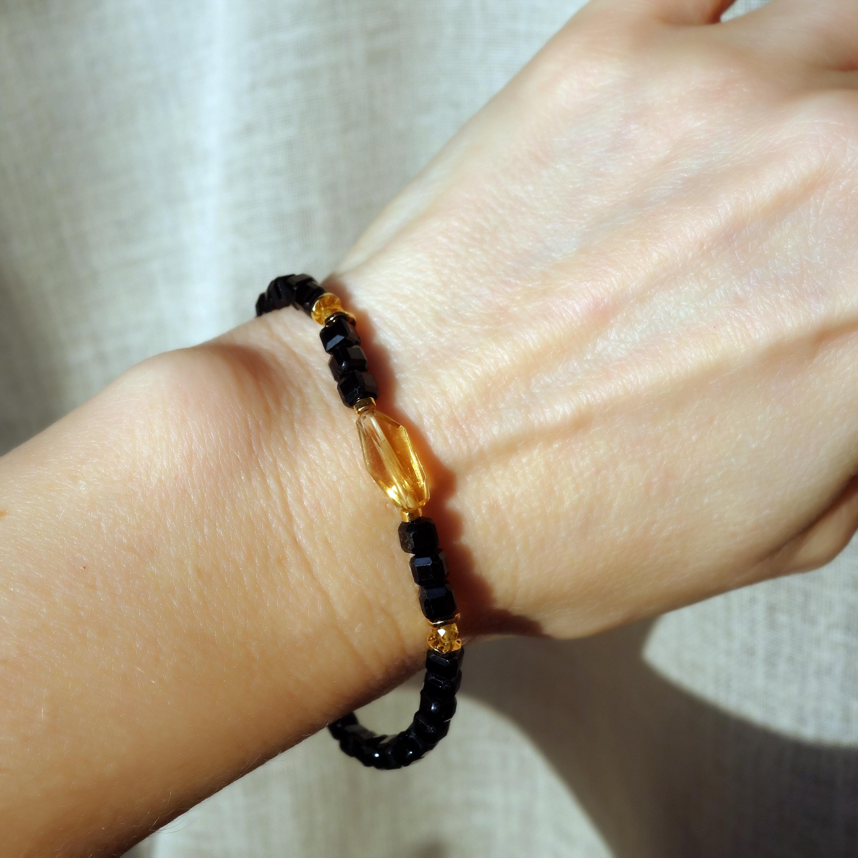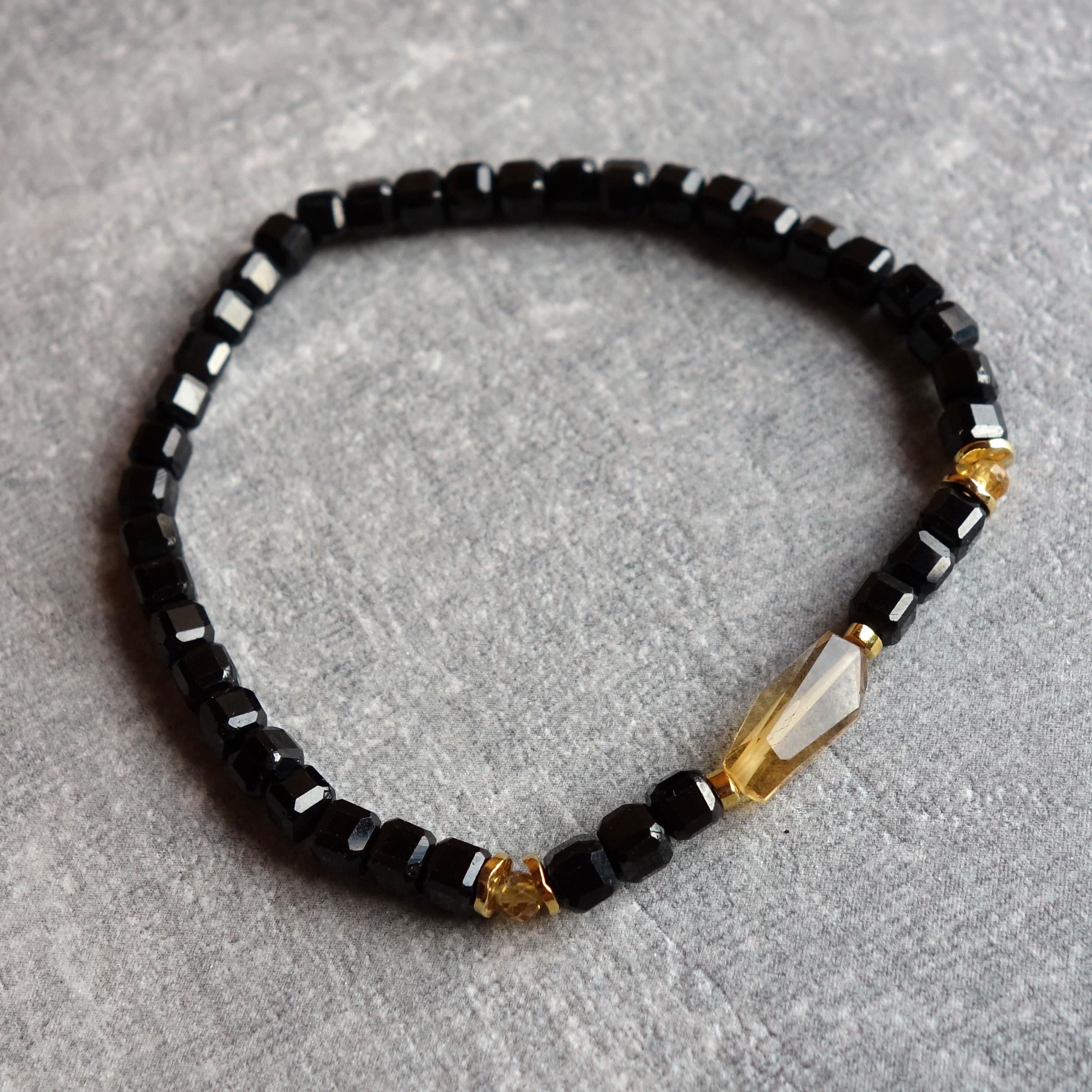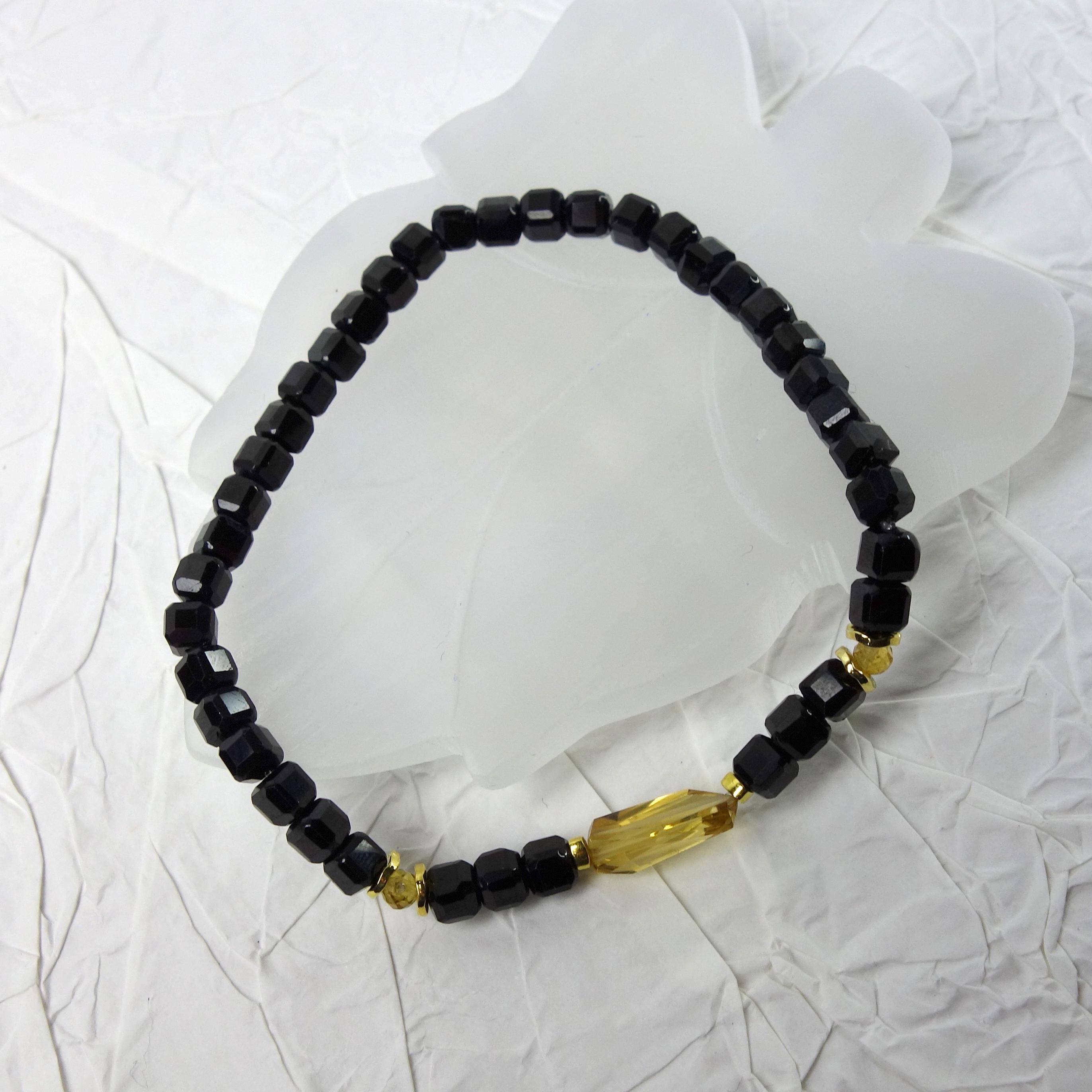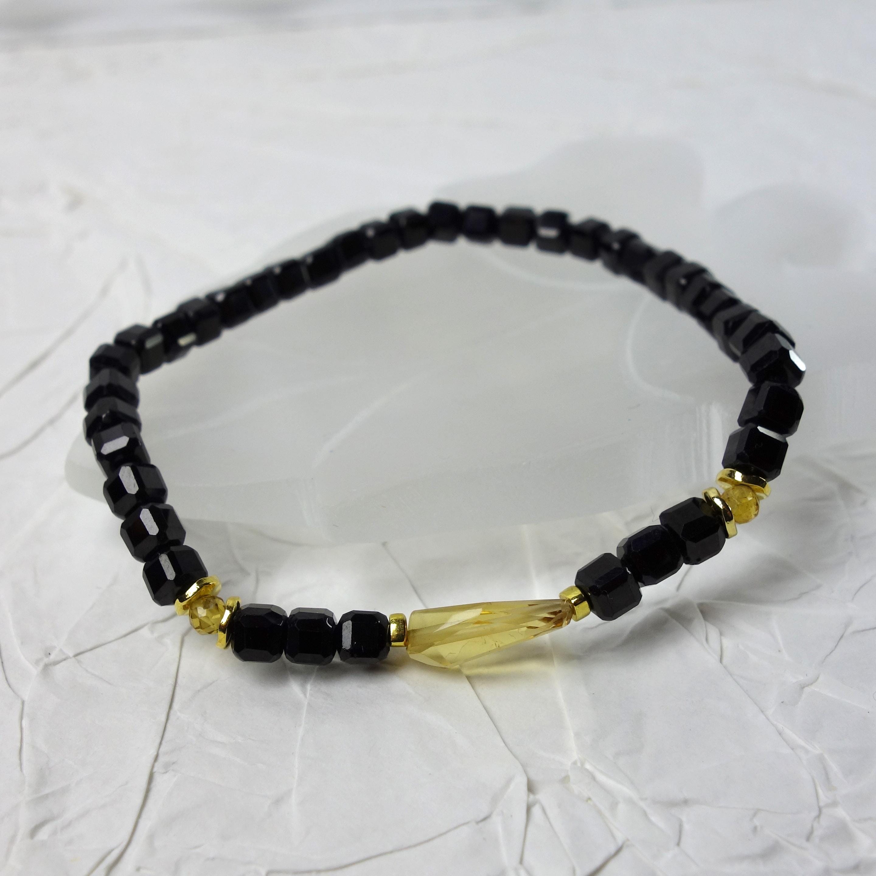 This elegant bracelet is a one-of-a-kind piece featuring glossy black spinel cubes and a warm golden citrine accent for a sleek, minimalist look. Black spinel is known as a protective stone that helps ground and dispel negativity, while citrine is associated with joy, energy, and abundance, making this bracelet a powerful everyday talisman.