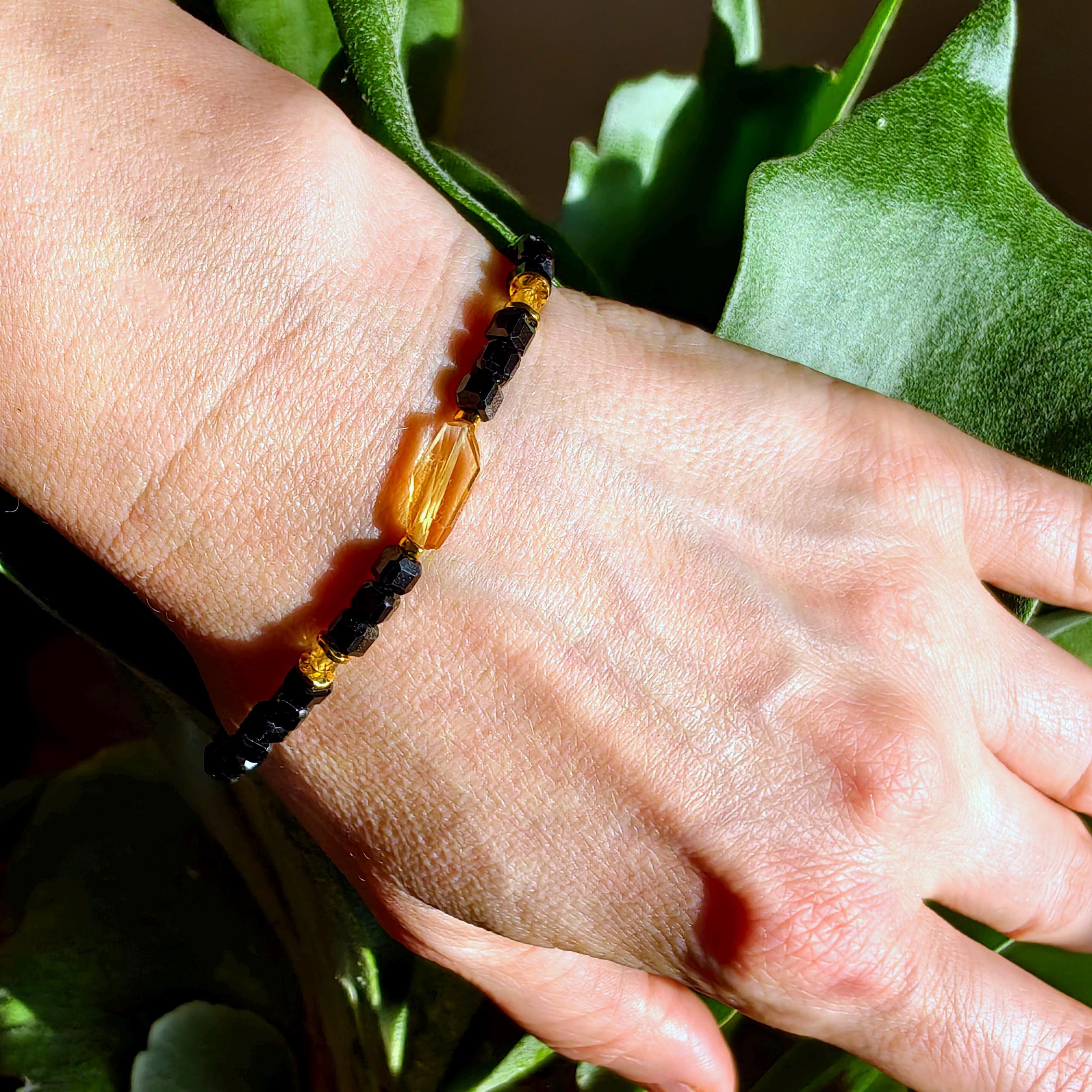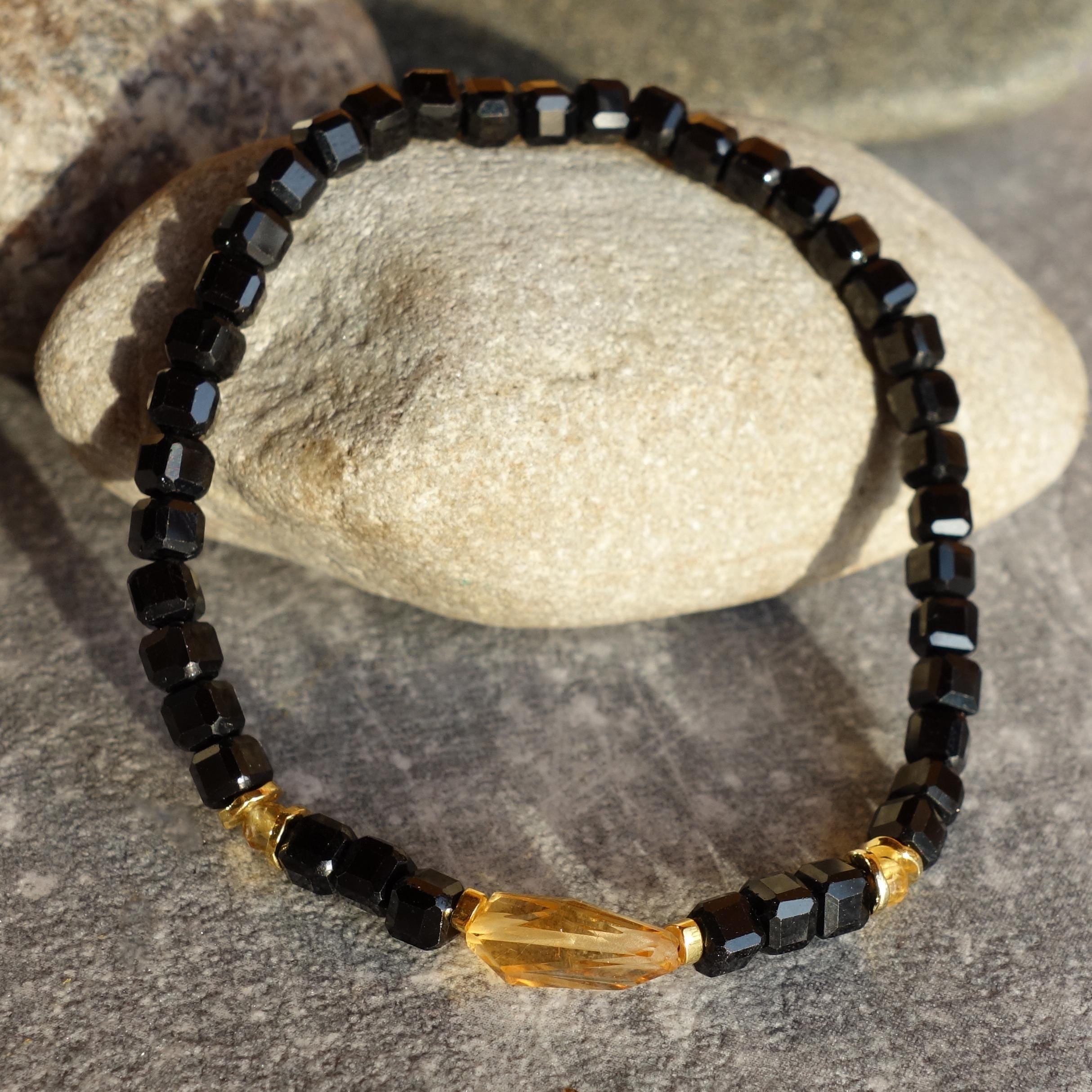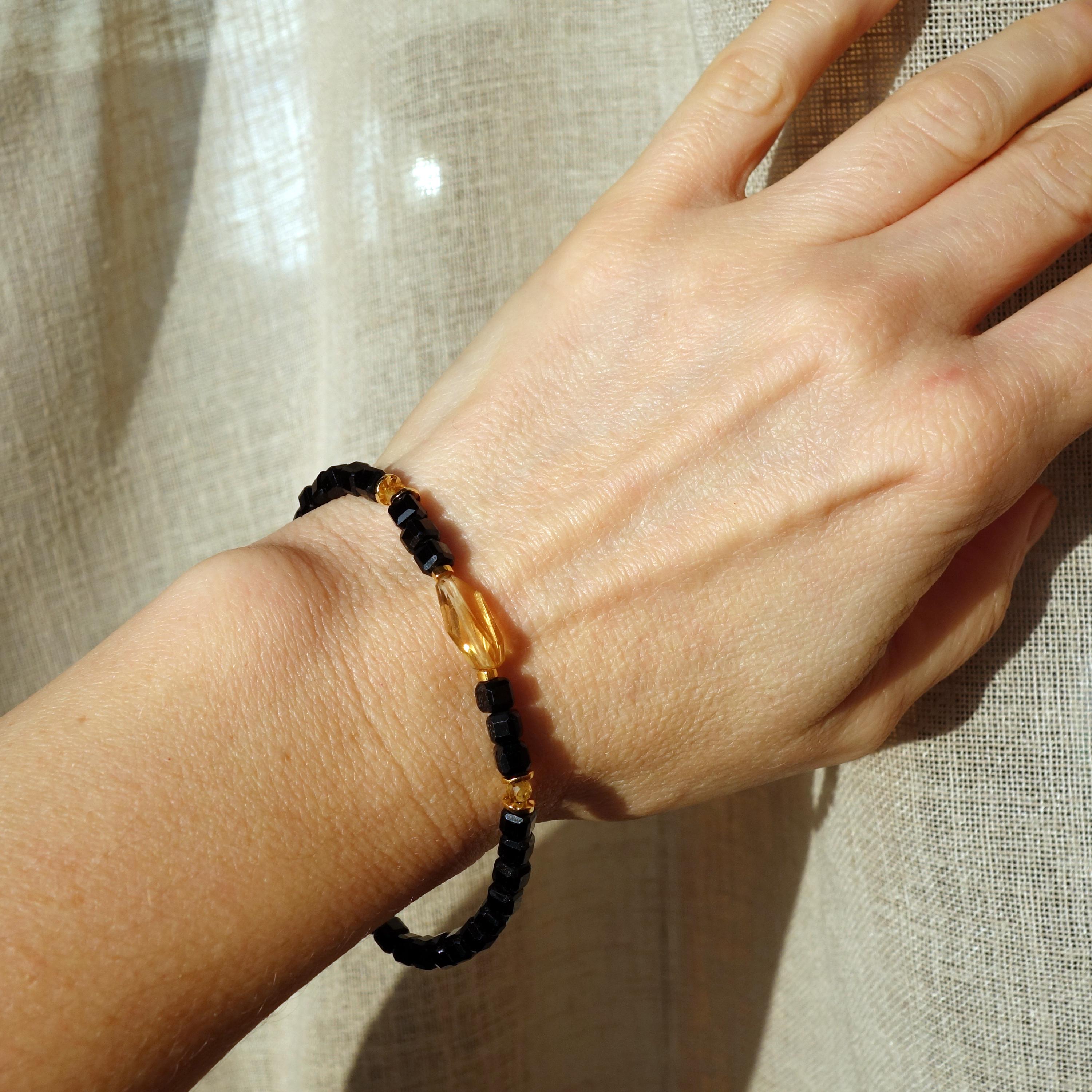 This elegant bracelet is a one-of-a-kind piece featuring glossy black spinel cubes and a warm golden citrine accent for a sleek, minimalist look. Black spinel is known as a protective stone that helps ground and dispel negativity, while citrine is associated with joy, energy, and abundance, making this bracelet a powerful everyday talisman.