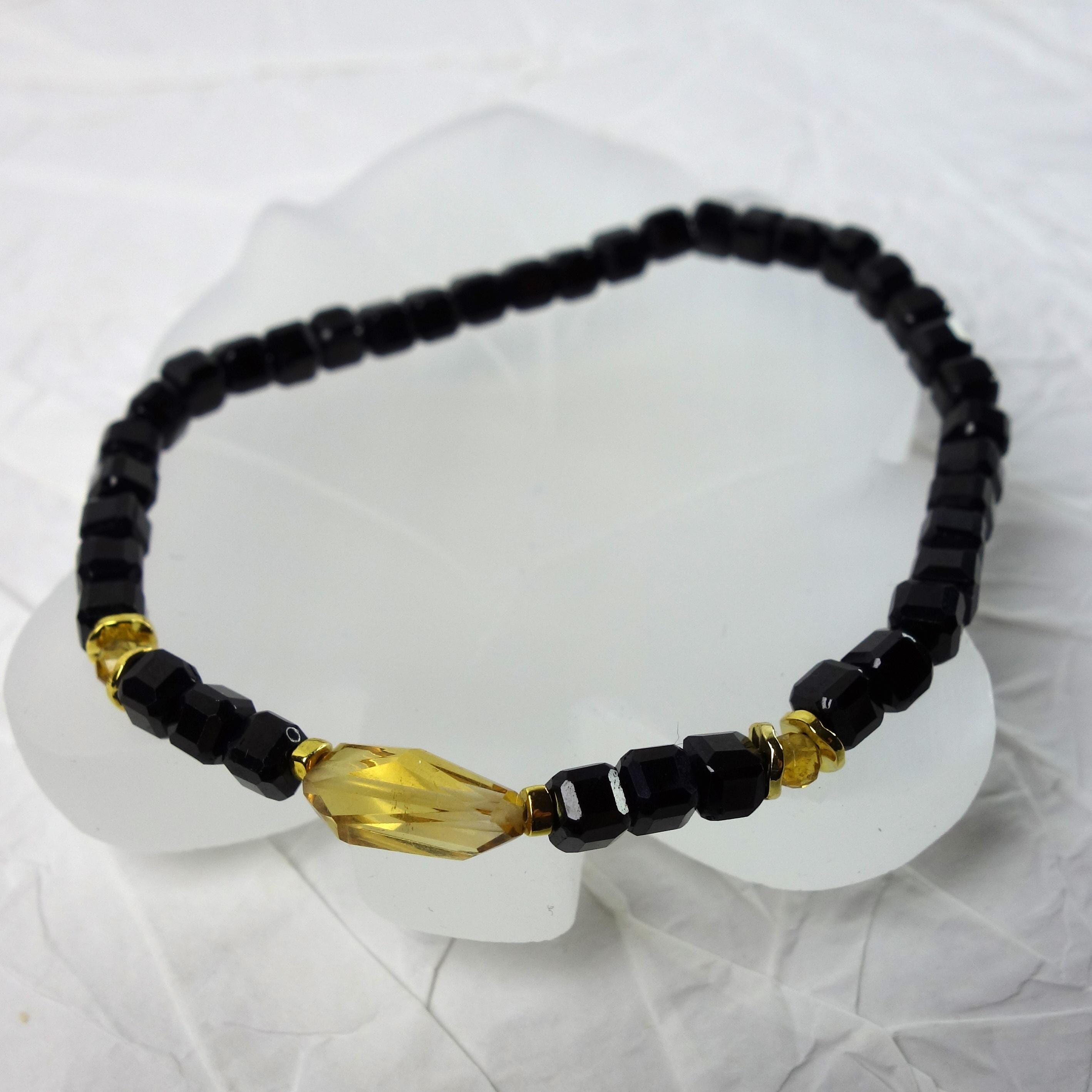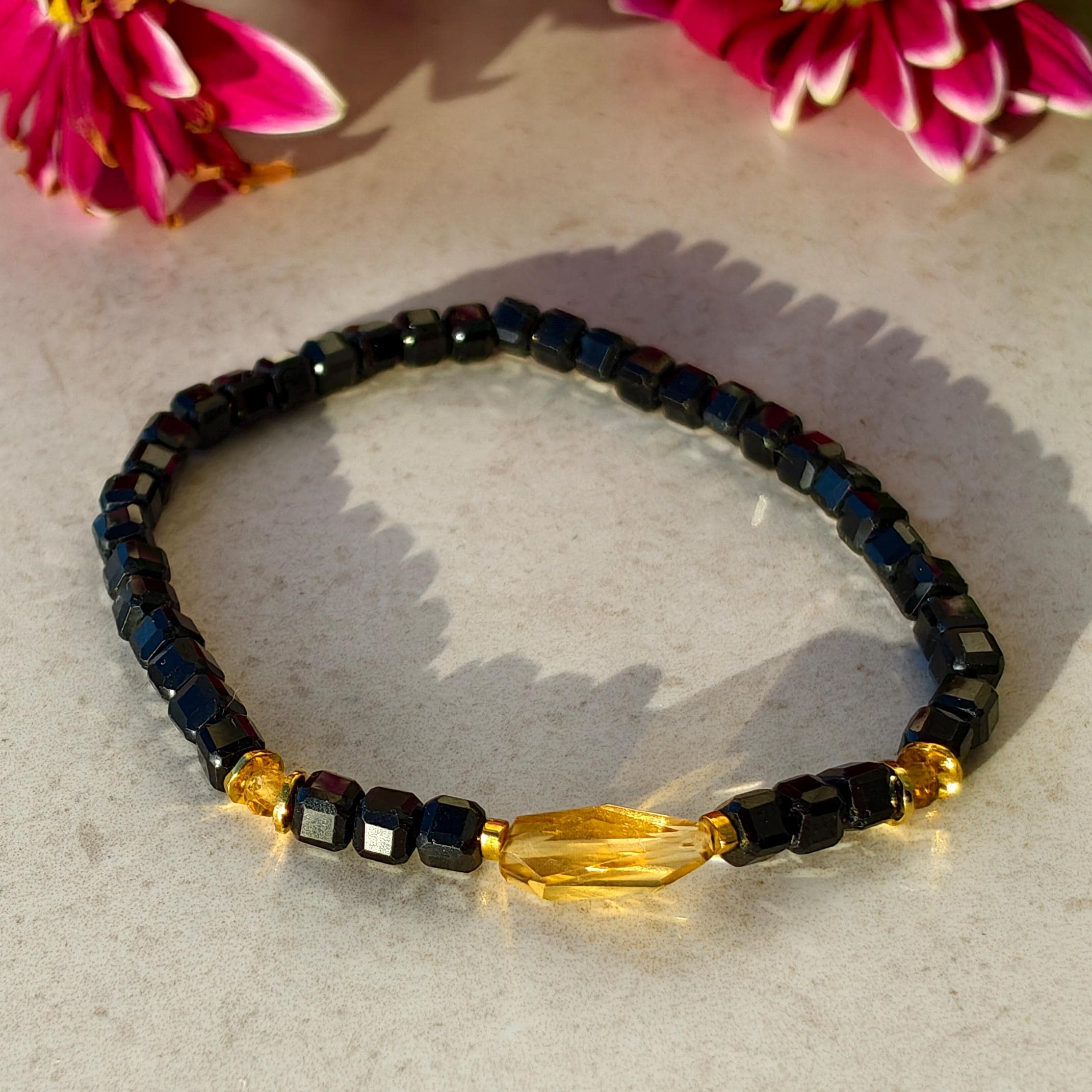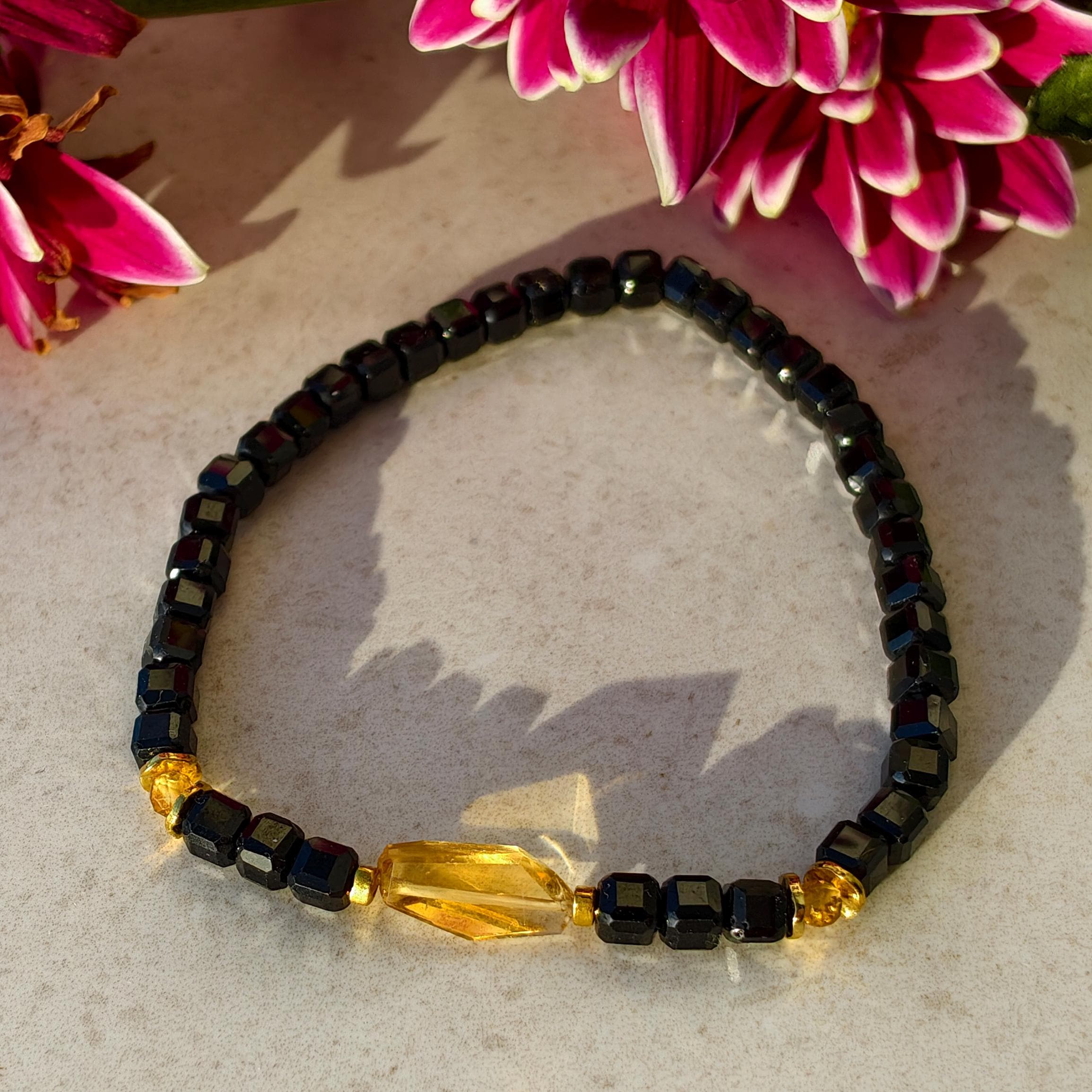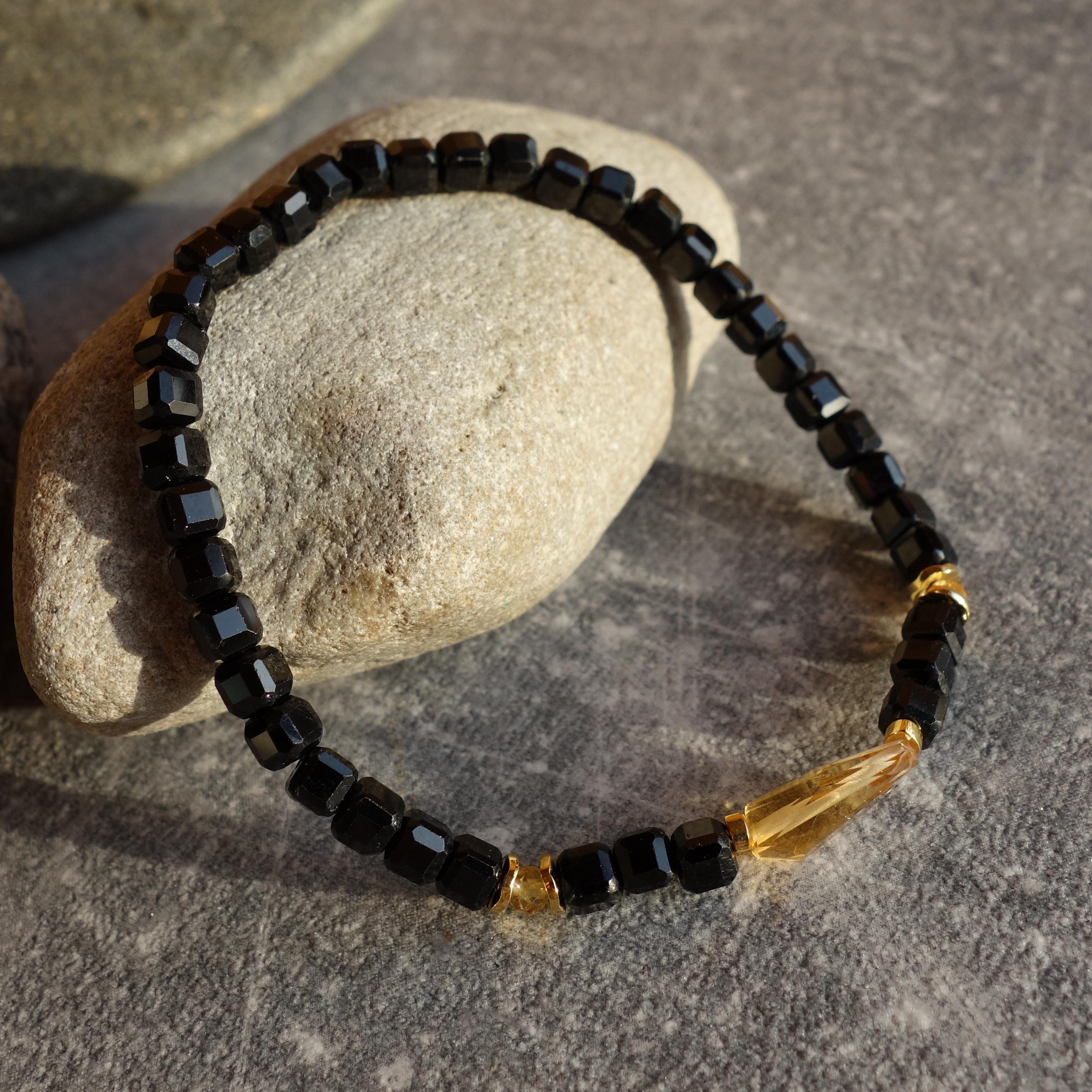 This elegant bracelet is a one-of-a-kind piece featuring glossy black spinel cubes and a warm golden citrine accent for a sleek, minimalist look. Black spinel is known as a protective stone that helps ground and dispel negativity, while citrine is associated with joy, energy, and abundance, making this bracelet a powerful everyday talisman.