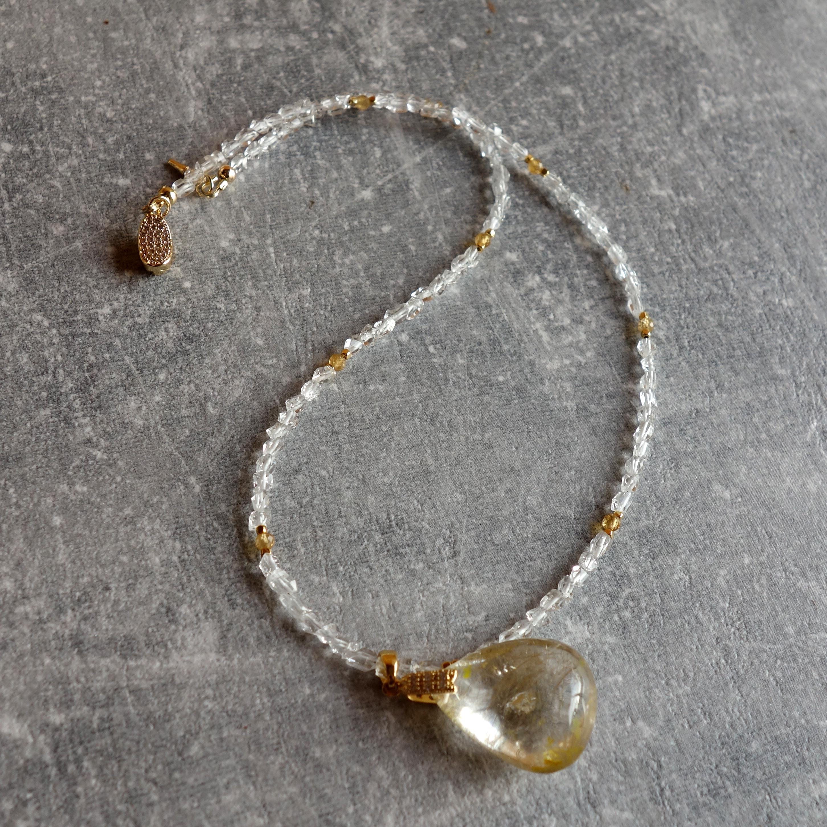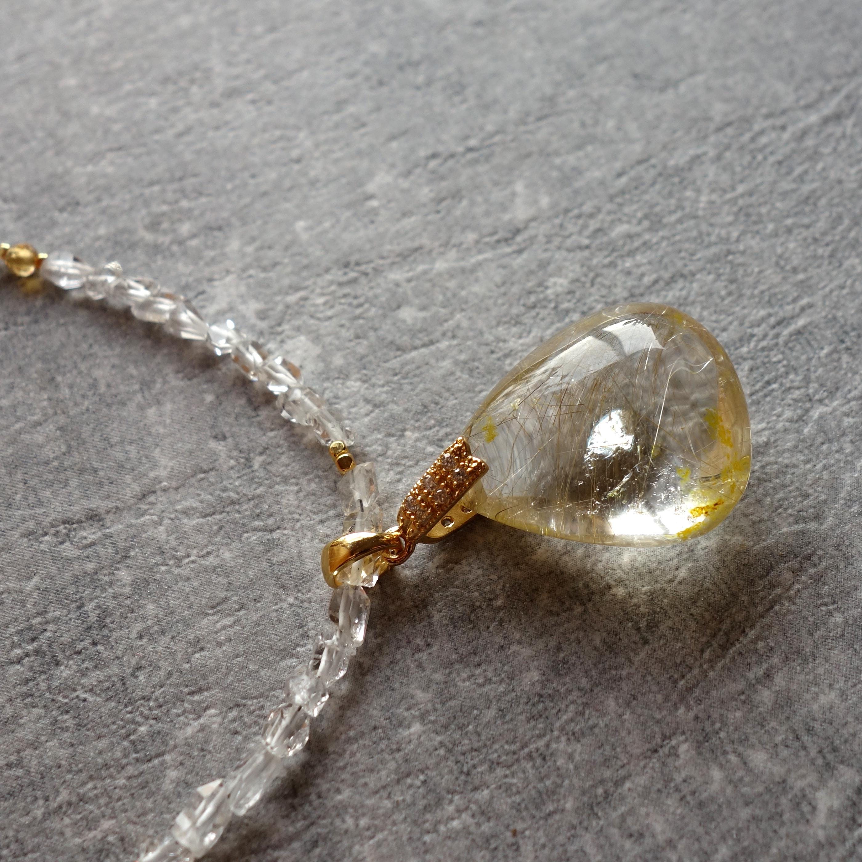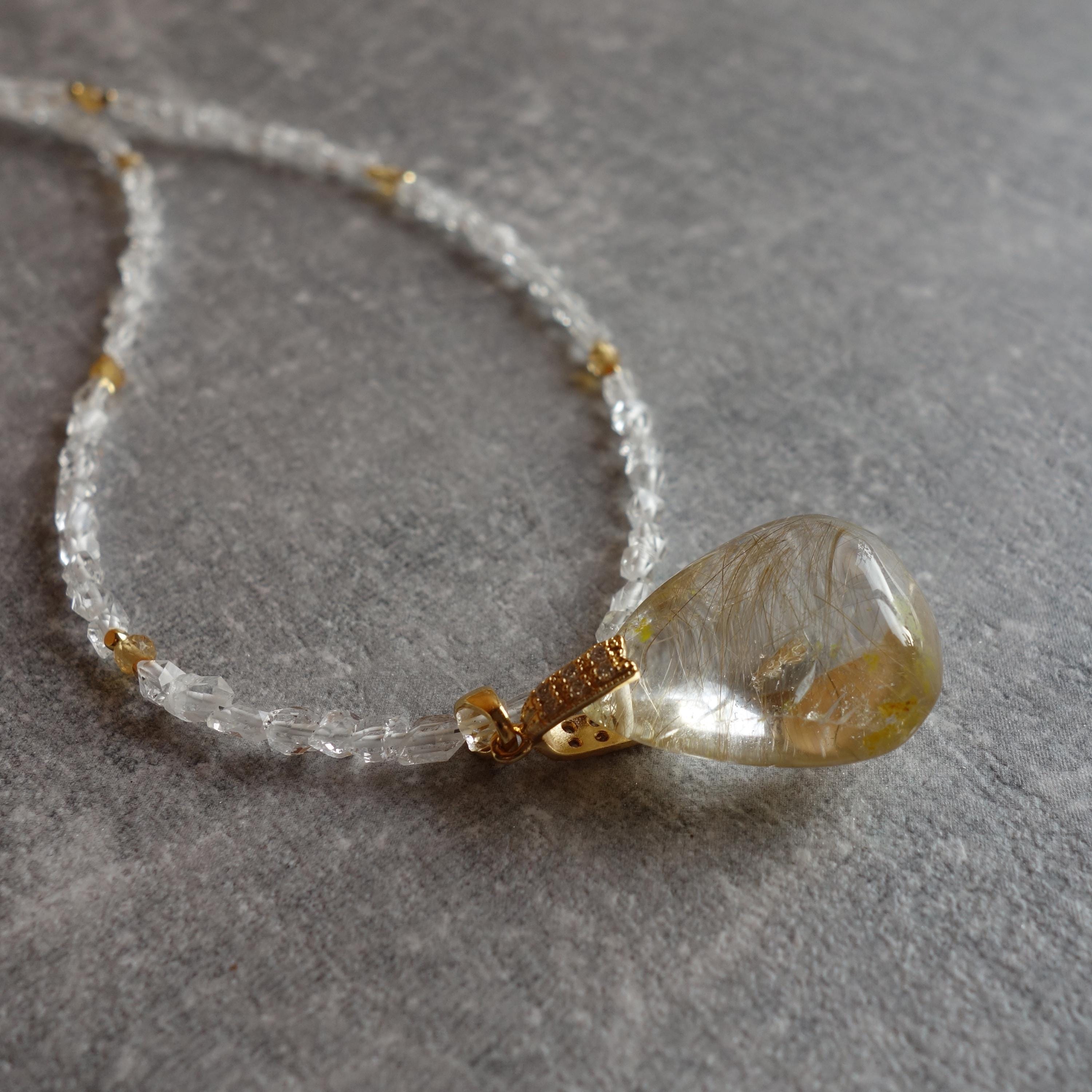 This delicate necklace is a one-of-a-kind handmade creation featuring sparkling Herkimer diamonds paired with sunny yellow tourmaline accents and a stunning rutilated quartz pendant. Herkimer diamonds, known as "attunement stones," amplify energy and promote spiritual clarity, while yellow tourmaline brings vitality and emotional balance, and rutilated quartz enhances manifestation with its golden rutile inclusions.