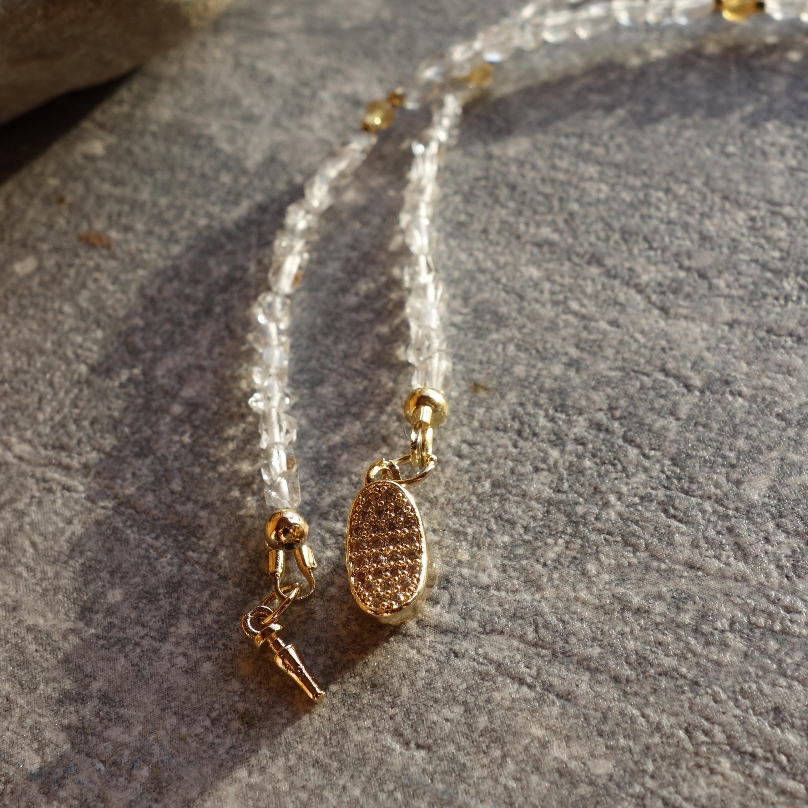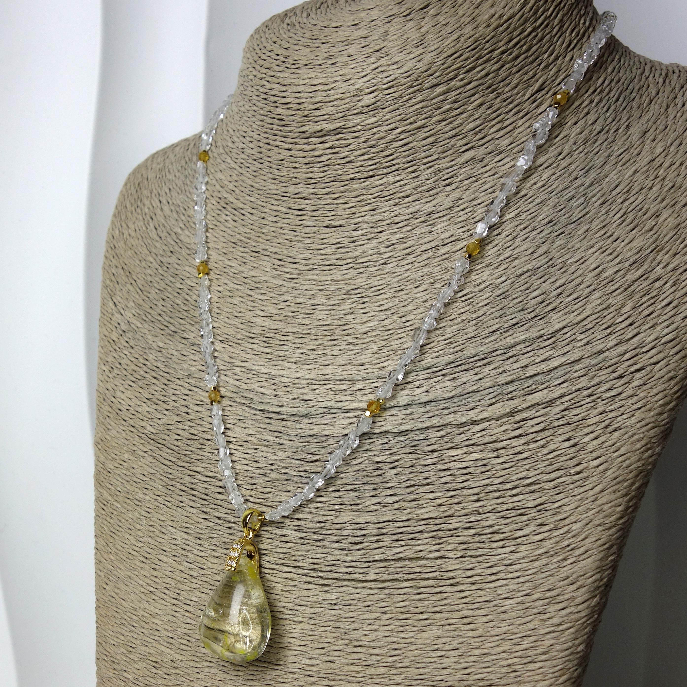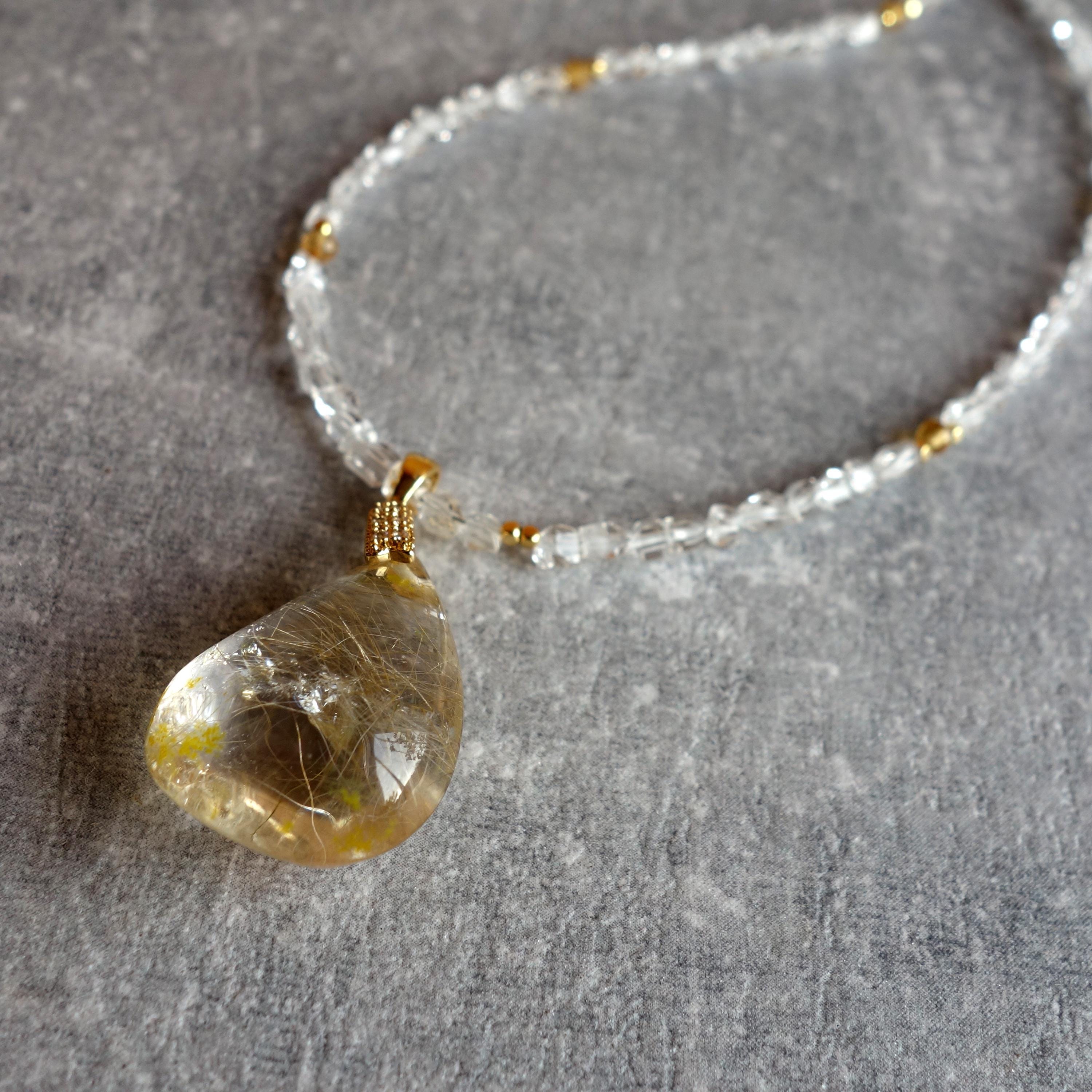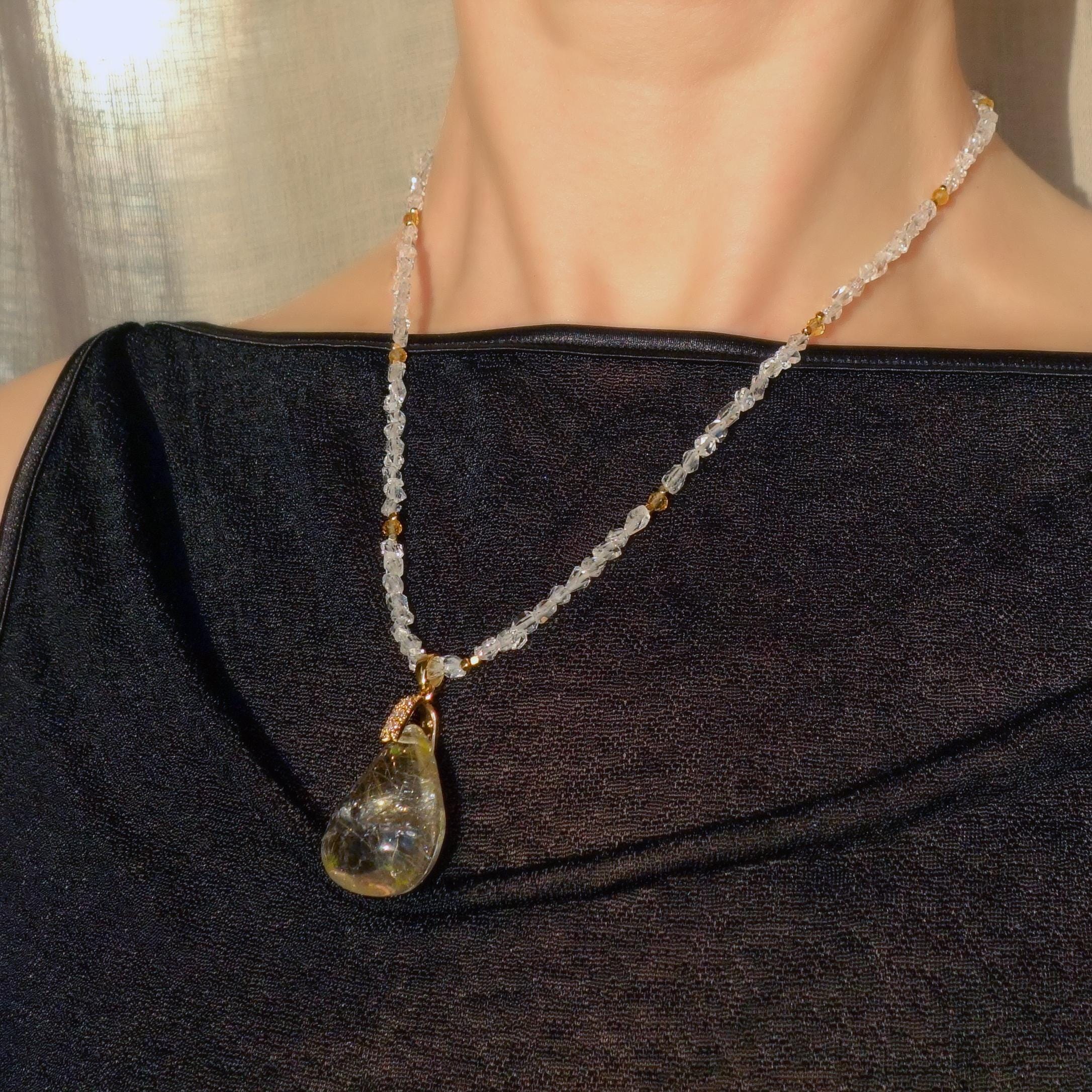 This delicate necklace is a one-of-a-kind handmade creation featuring sparkling Herkimer diamonds paired with sunny yellow tourmaline accents and a stunning rutilated quartz pendant. Herkimer diamonds, known as "attunement stones," amplify energy and promote spiritual clarity, while yellow tourmaline brings vitality and emotional balance, and rutilated quartz enhances manifestation with its golden rutile inclusions.