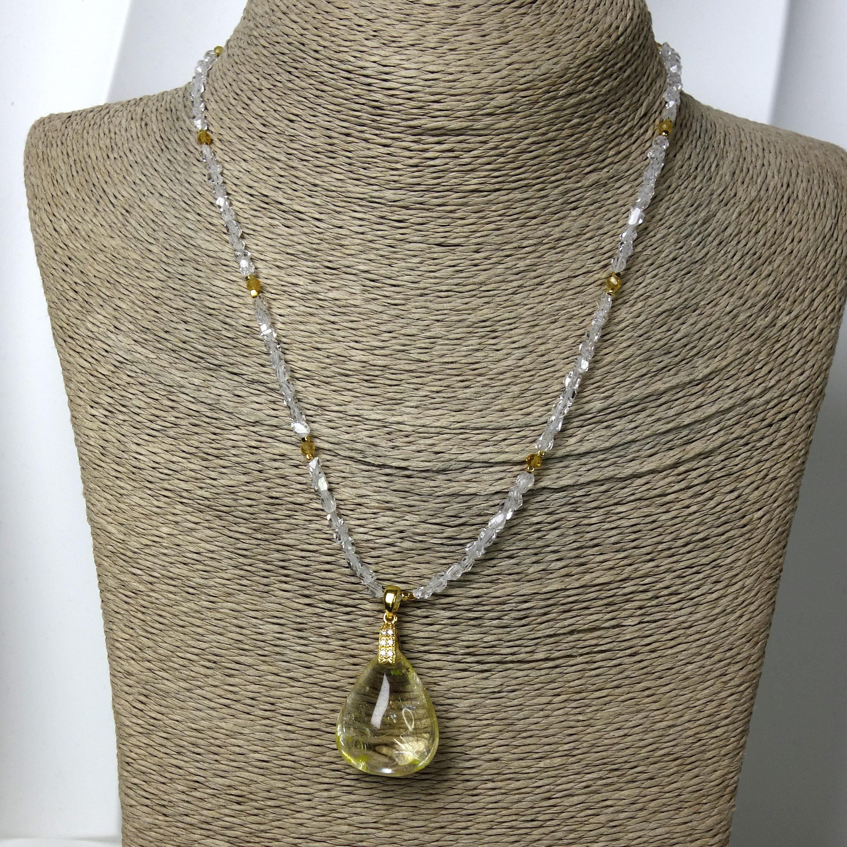 Beads: Natural Herkimer diamonds (double-terminated quartz crystals) and yellow tourmaline.