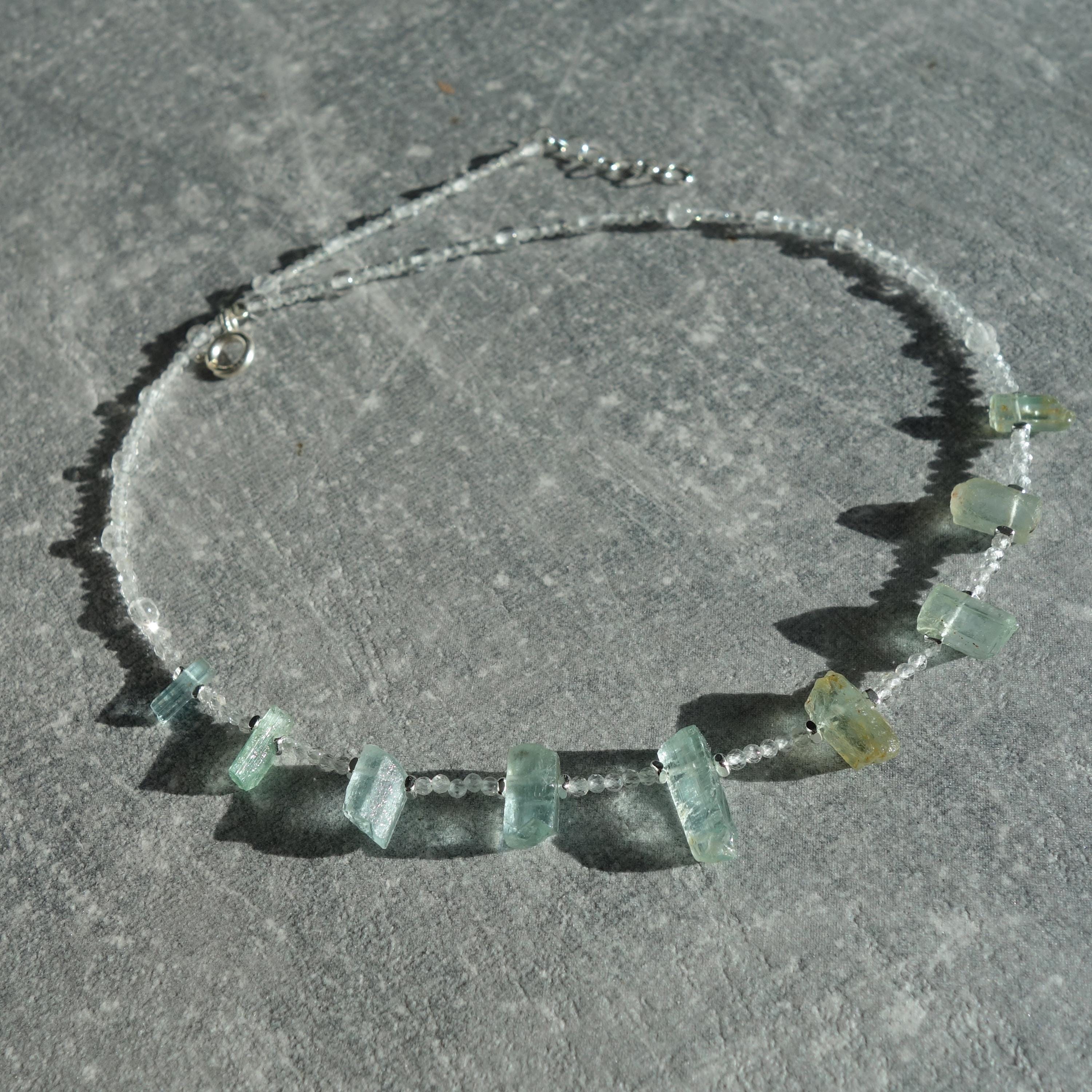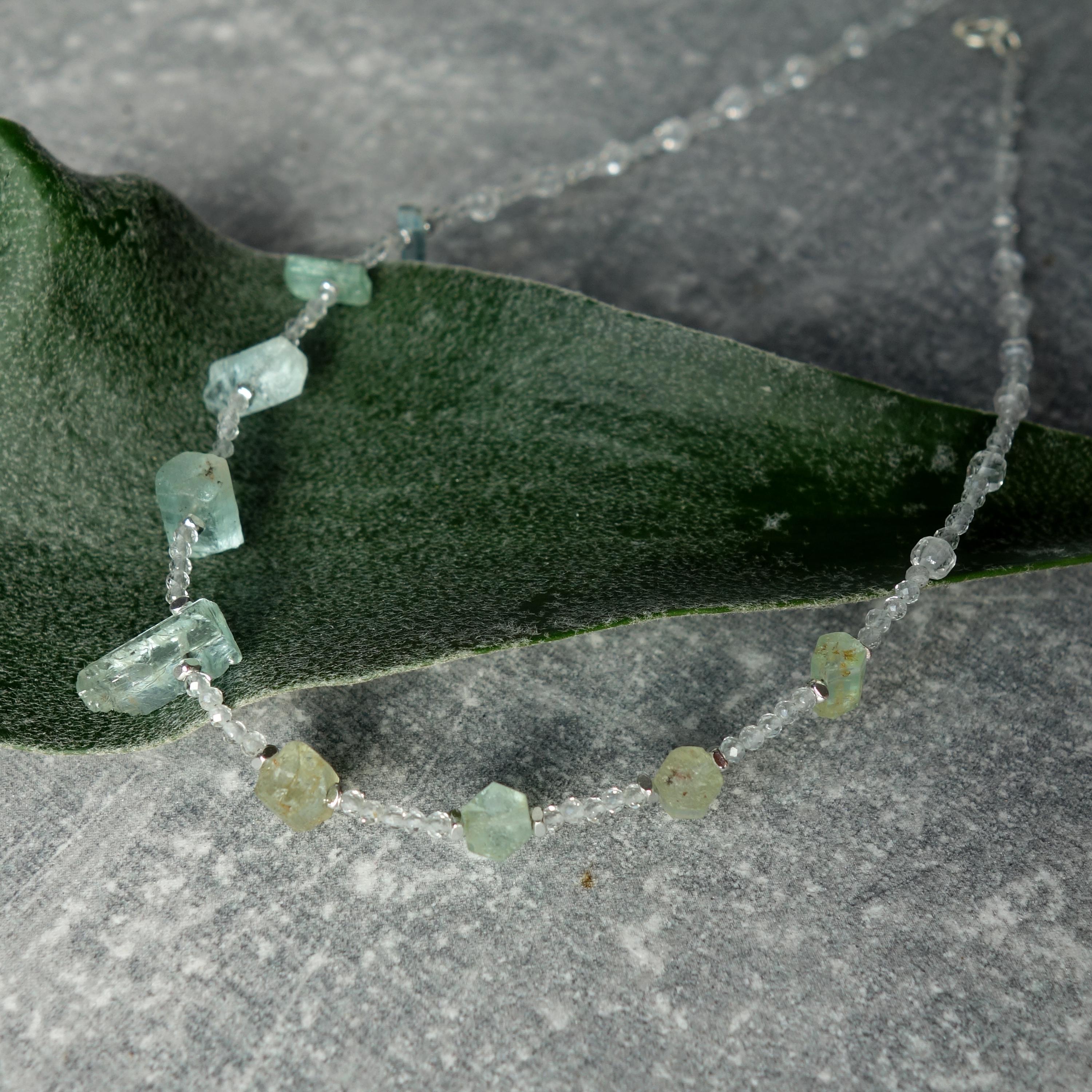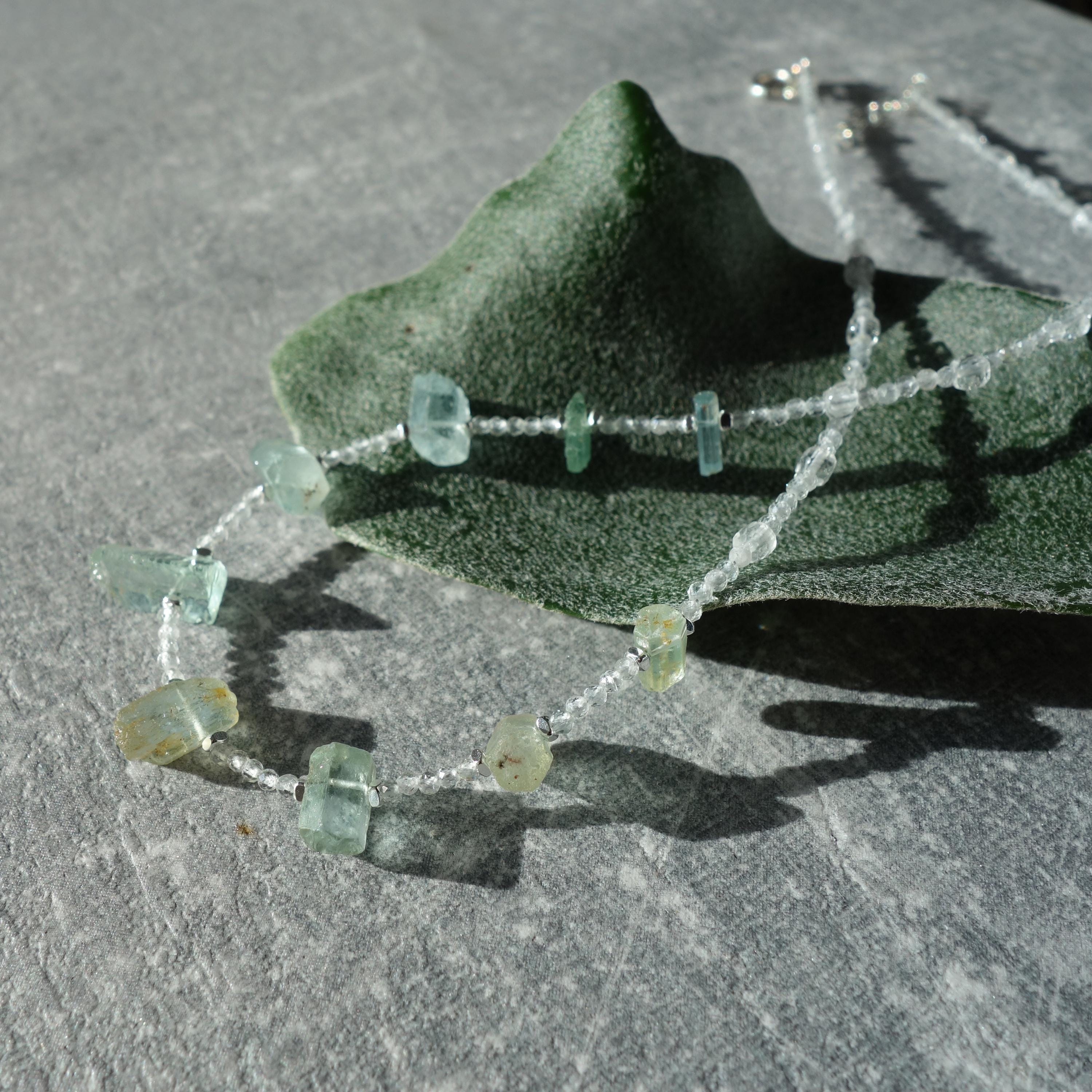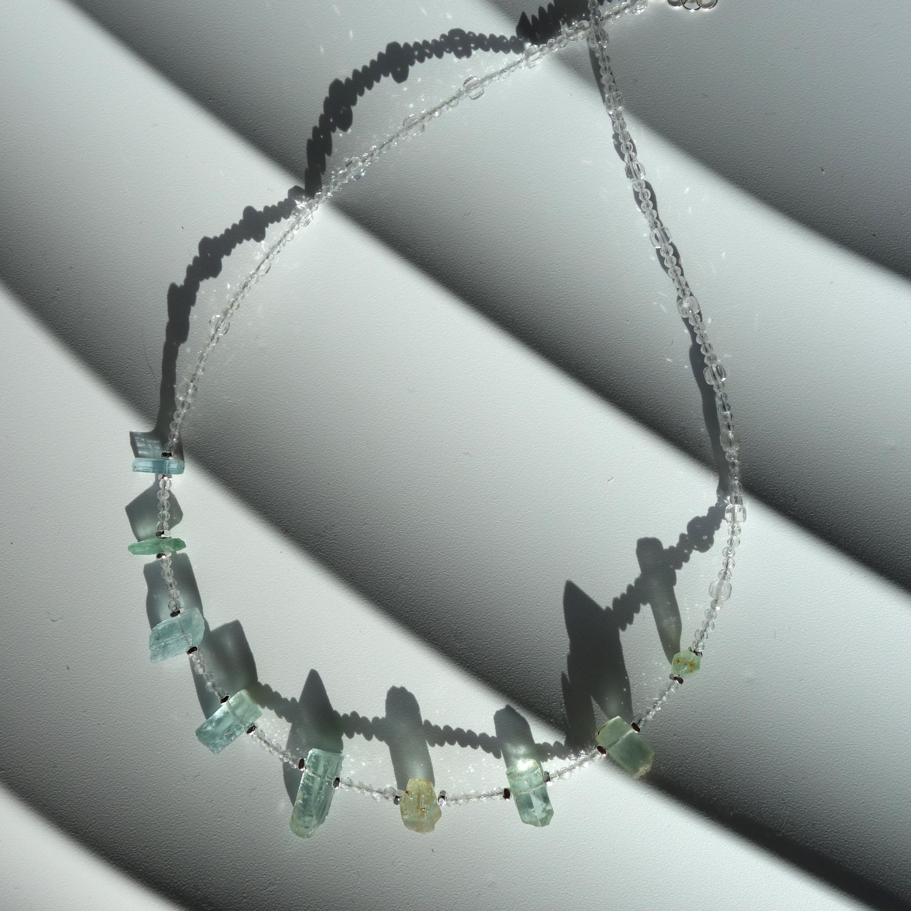 This delicate necklace is a one-of-a-kind piece combining sparkling clear quartz with raw aquamarine crystals for a fresh, ocean-inspired look. Light and airy, it sits close to the collarbone and works beautifully for everyday wear or as a subtle bridal accent.