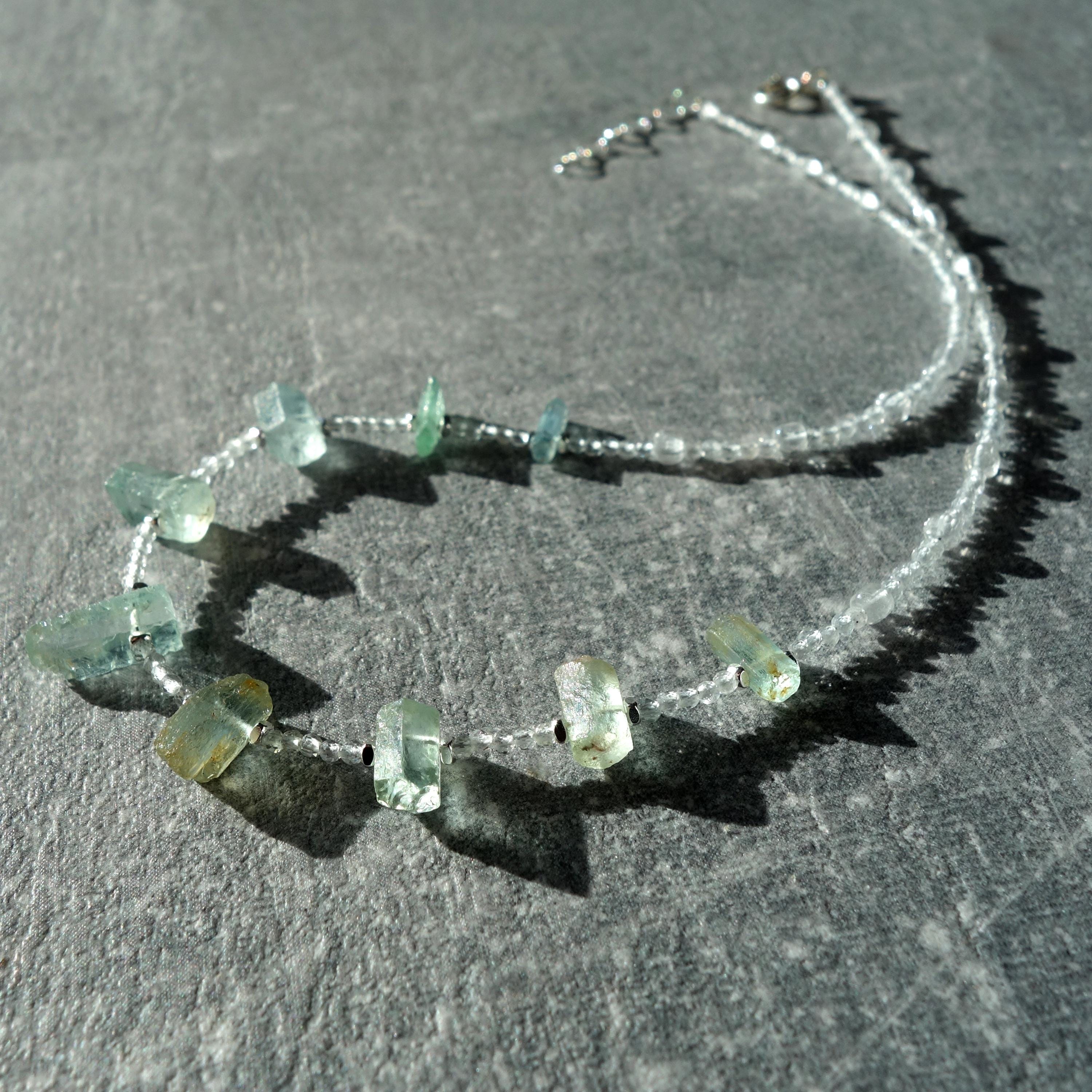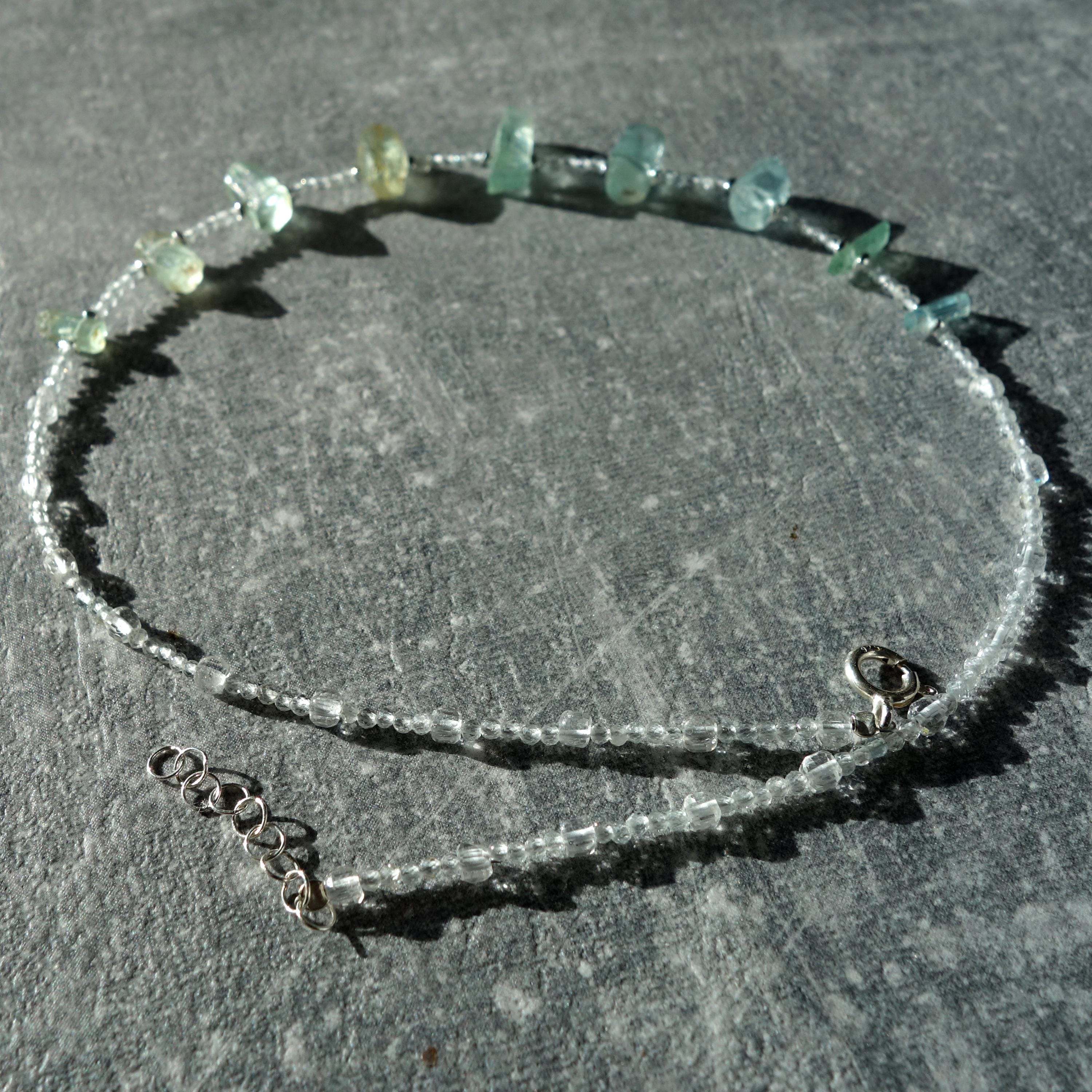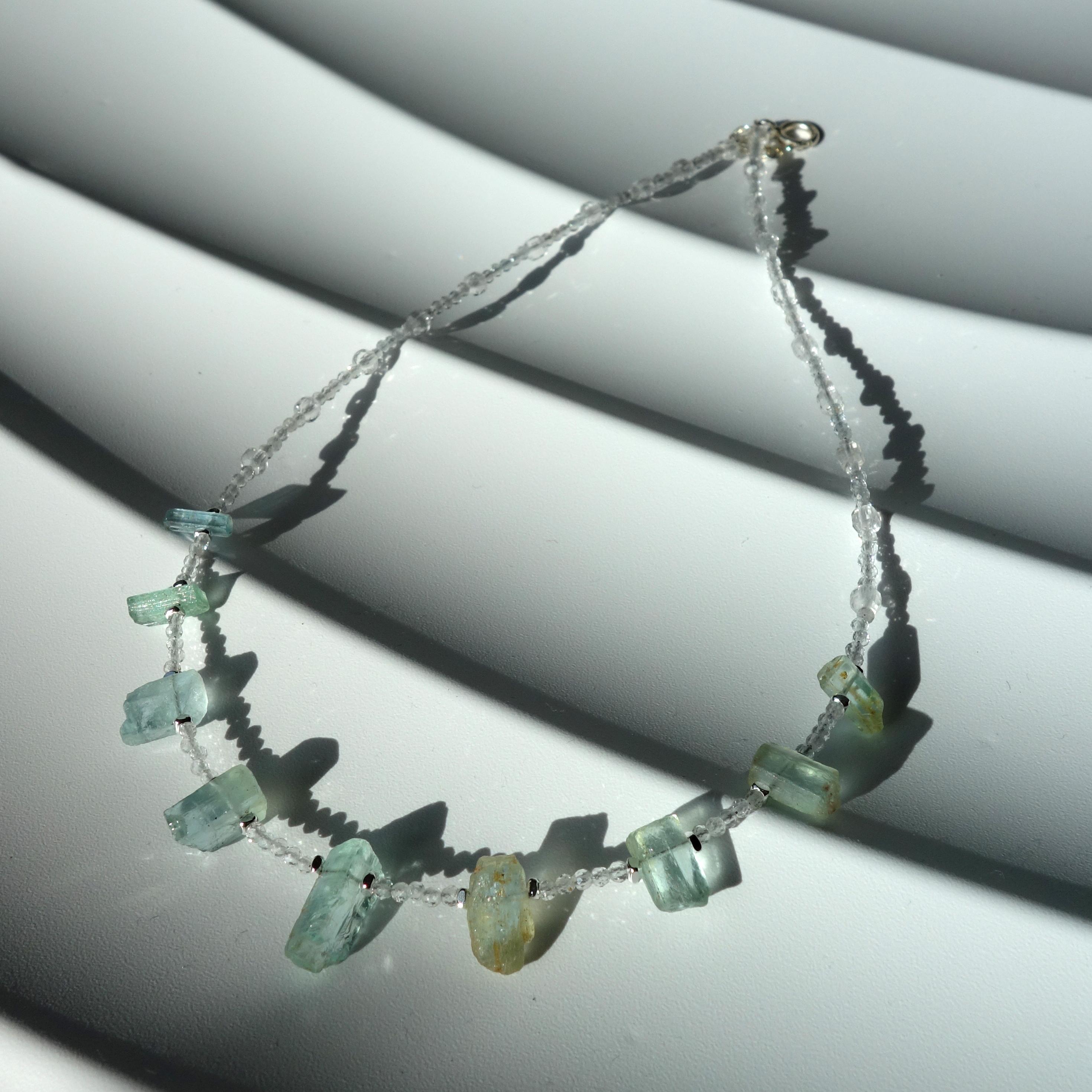 This delicate necklace is a one-of-a-kind piece combining sparkling clear quartz with raw aquamarine crystals for a fresh, ocean-inspired look. Light and airy, it sits close to the collarbone and works beautifully for everyday wear or as a subtle bridal accent.