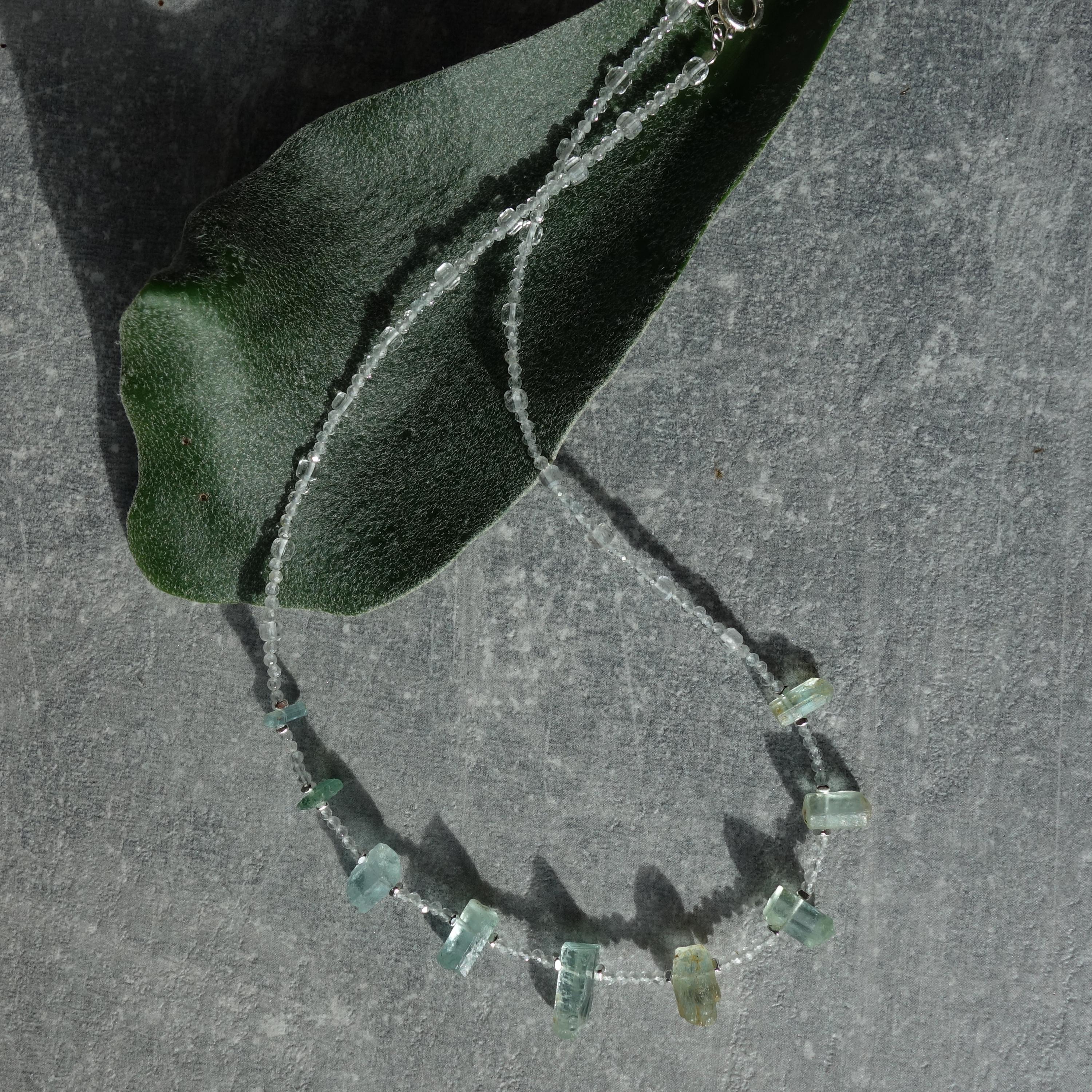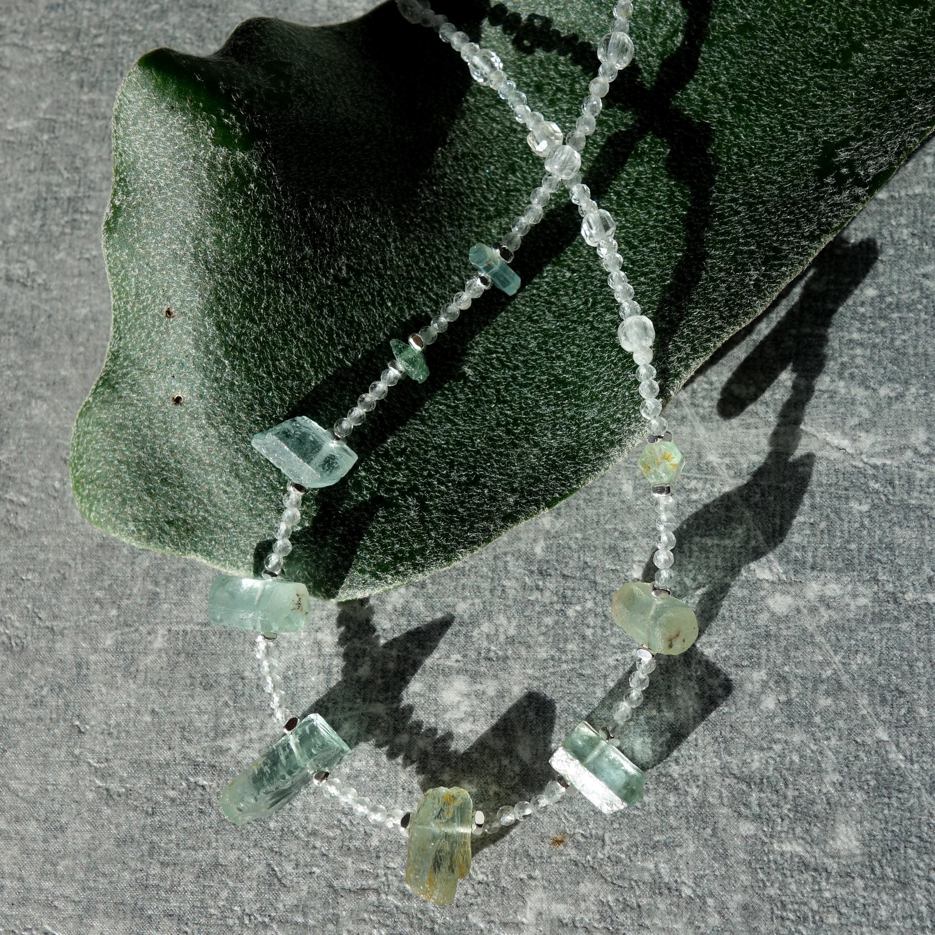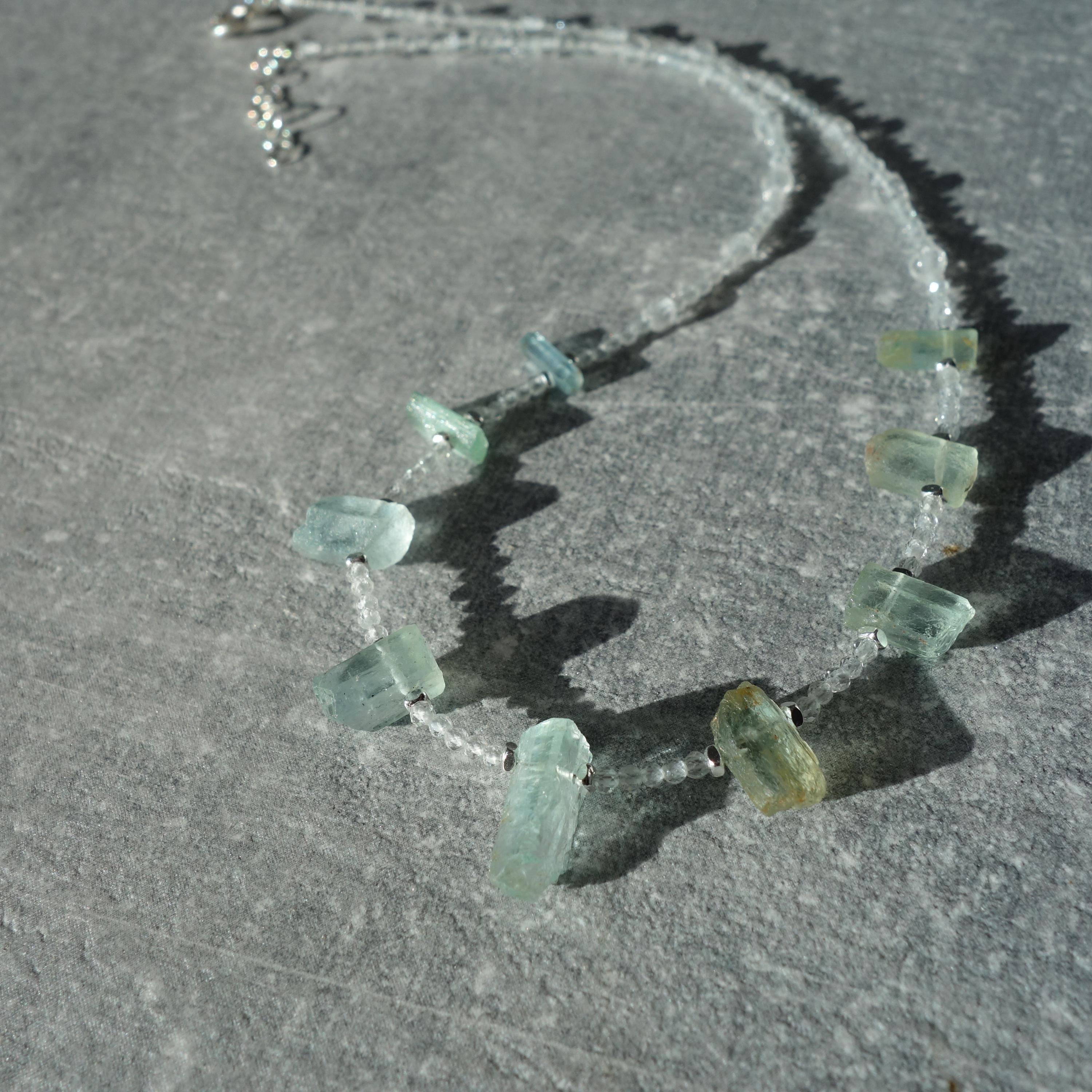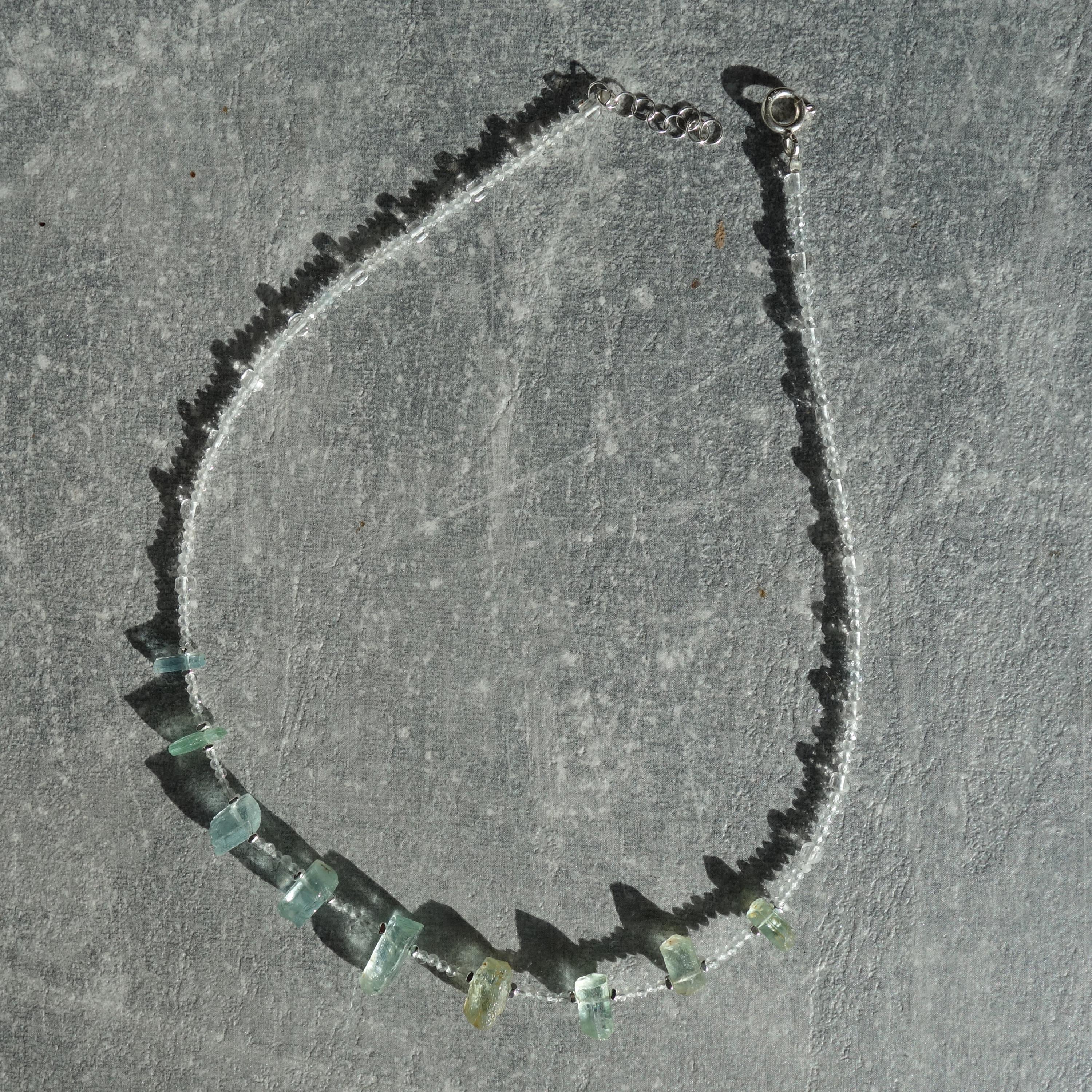 This delicate necklace is a one-of-a-kind piece combining sparkling clear quartz with raw aquamarine crystals for a fresh, ocean-inspired look. Light and airy, it sits close to the collarbone and works beautifully for everyday wear or as a subtle bridal accent.