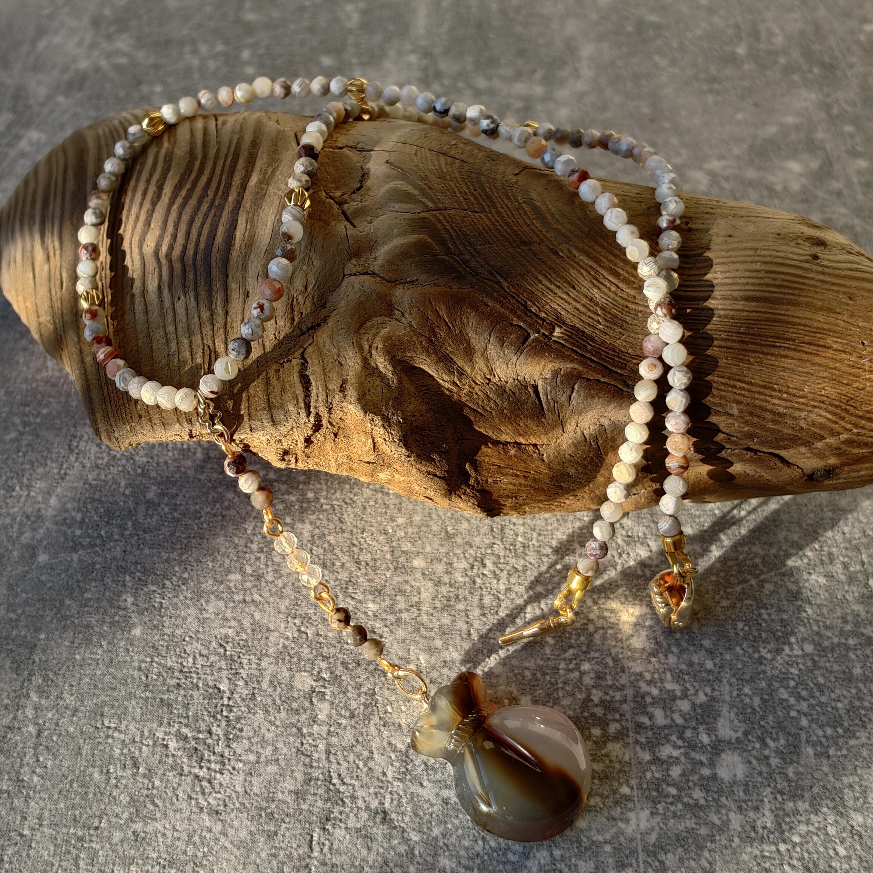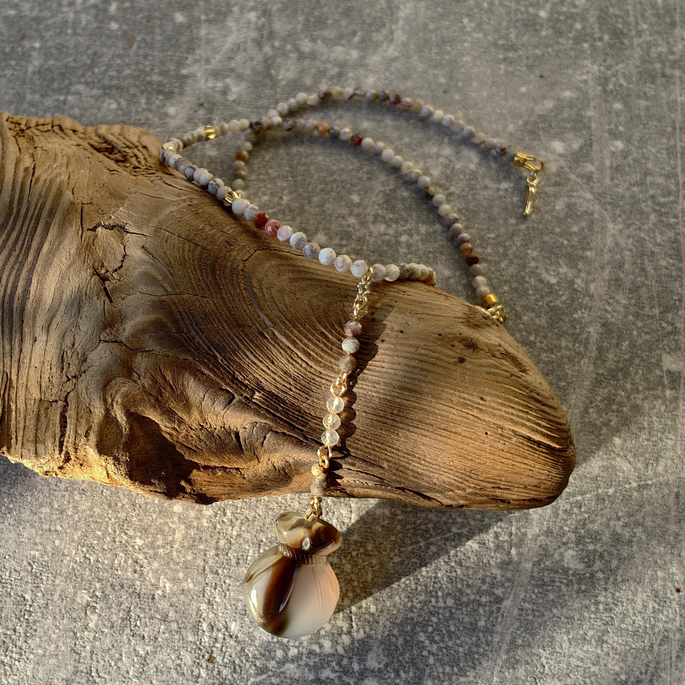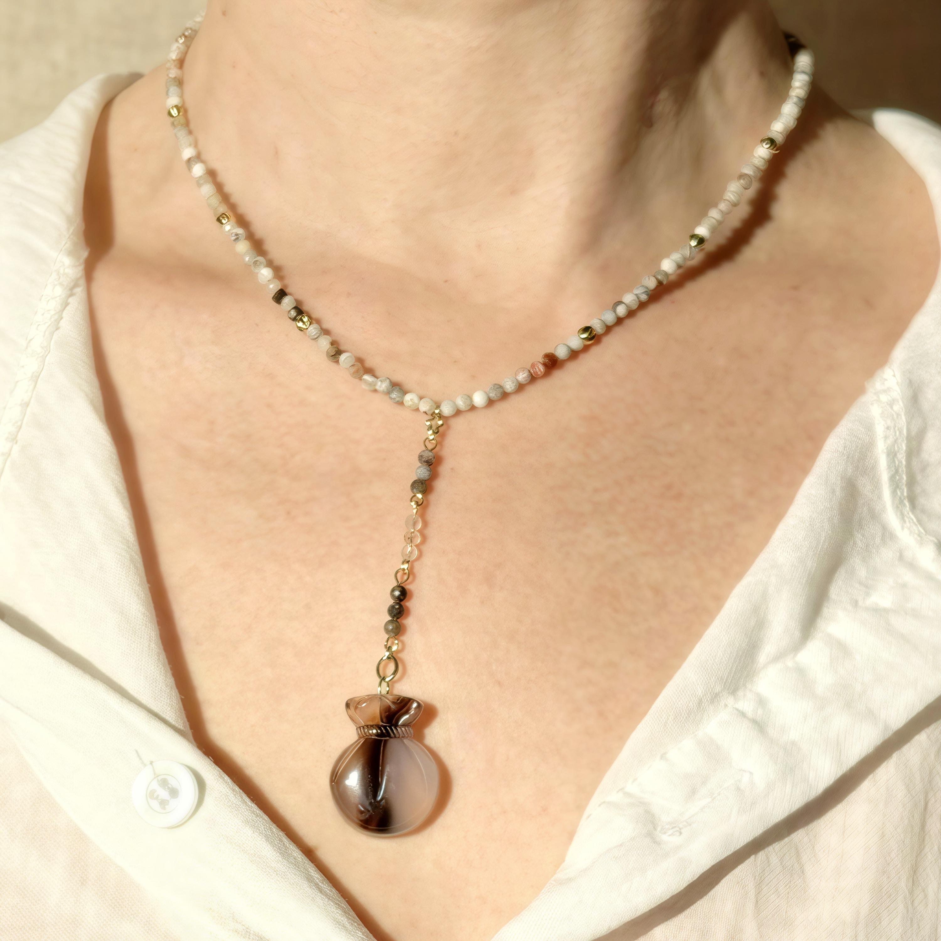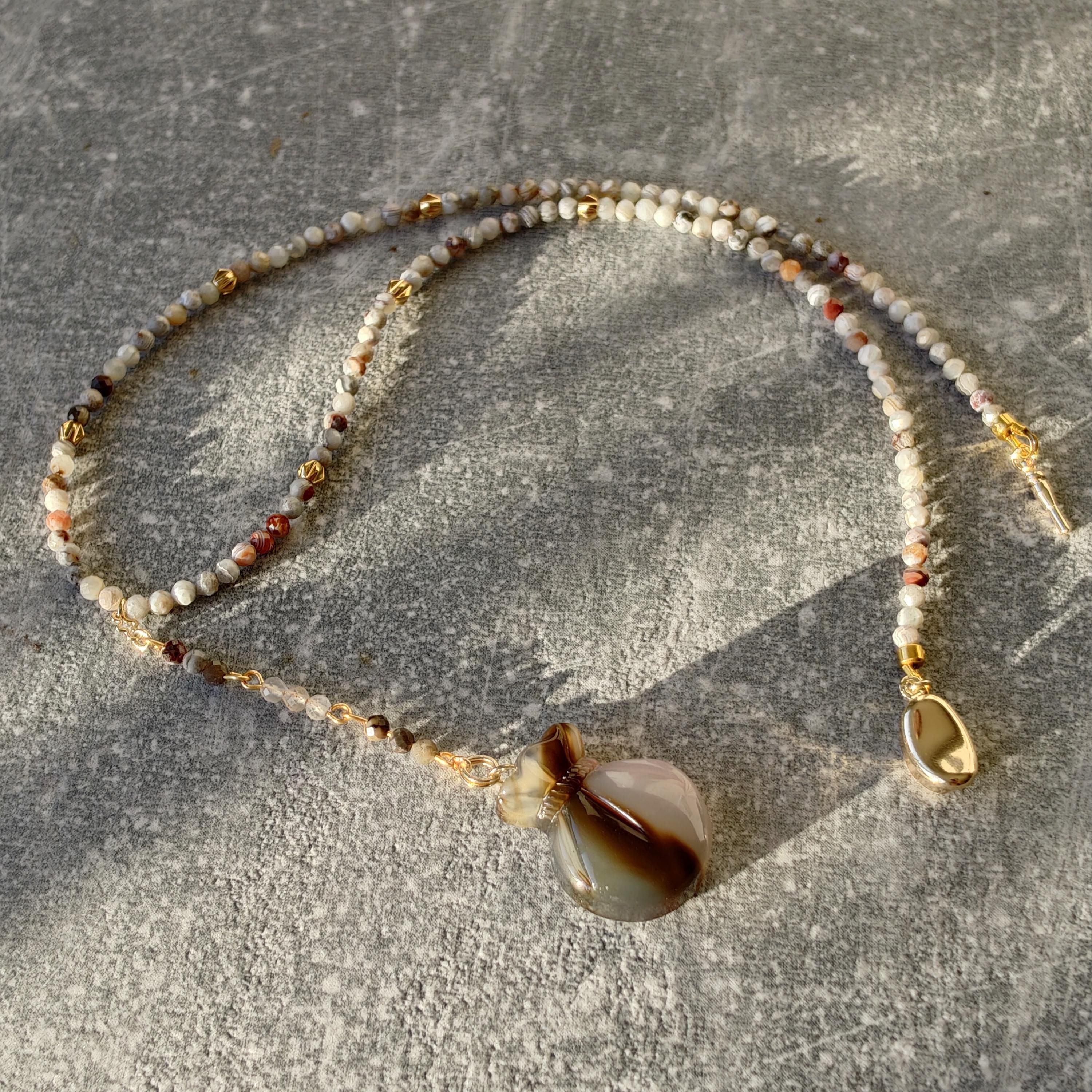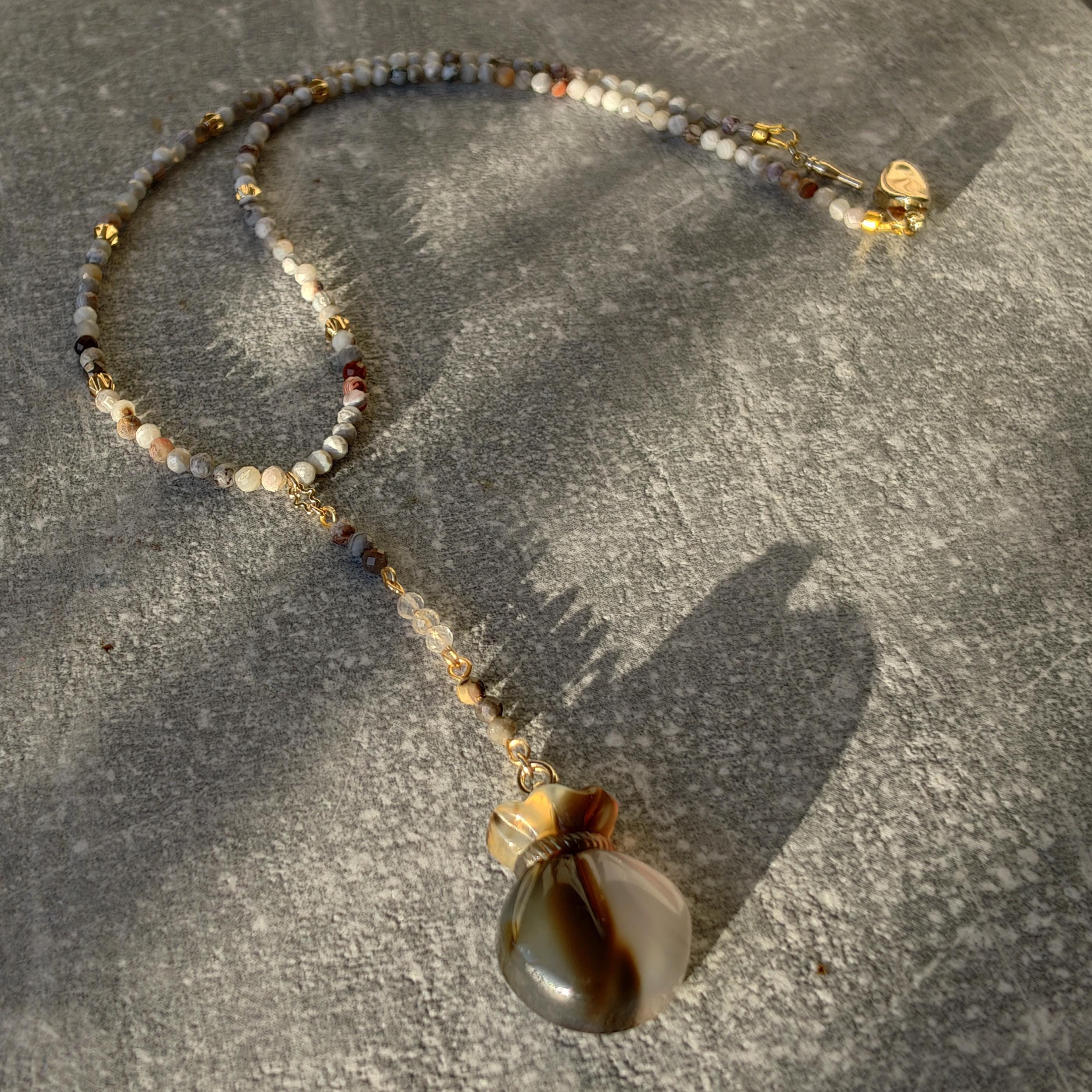 One-of-a-kind handmade necklace — This design will not be repeated. This agate necklace features tiny faceted agate beads and a carved agate pendant shaped like a money bag, creating a warm earthy look with a symbolic touch of abundance. Agate is associated with grounding, balance, protection, and inner stability.