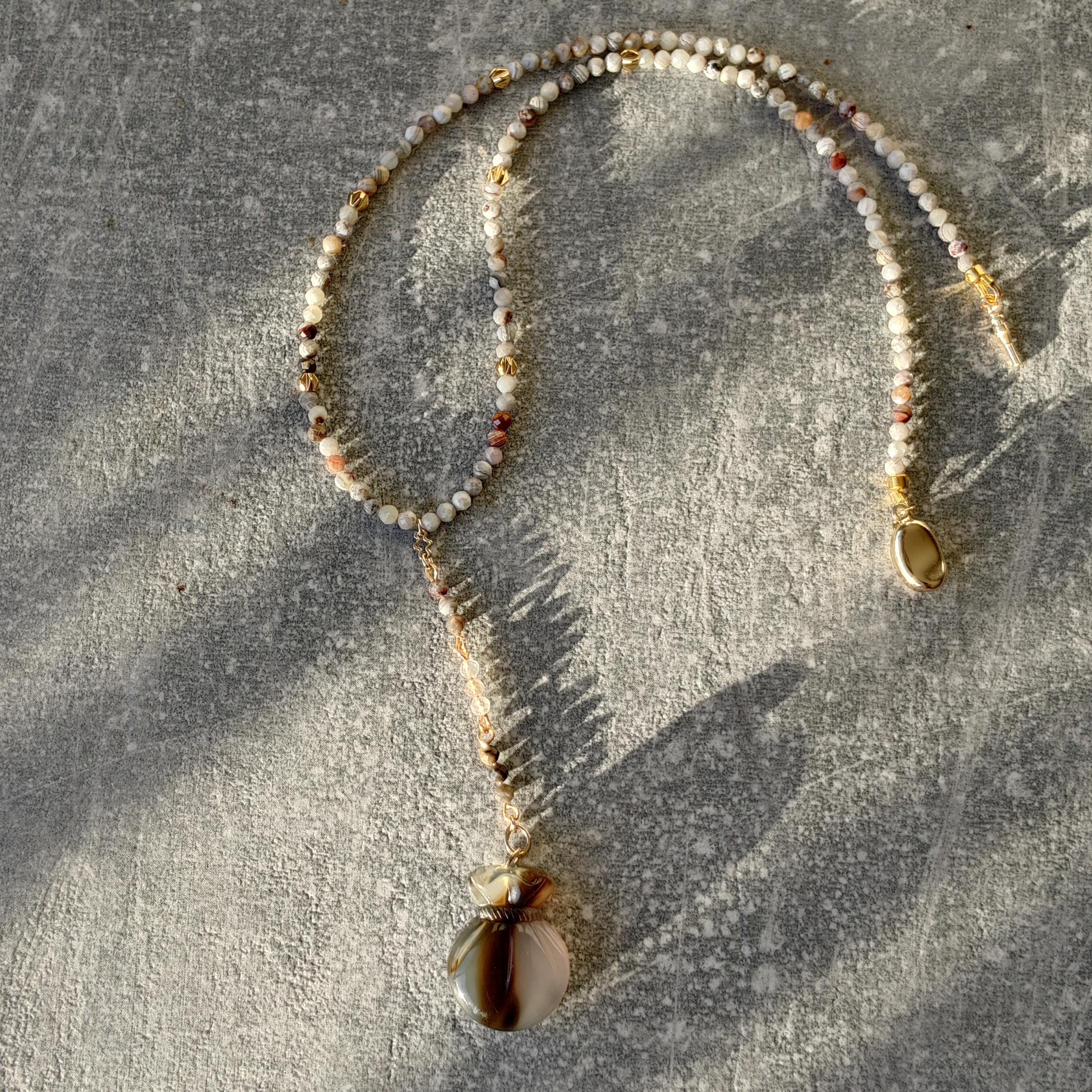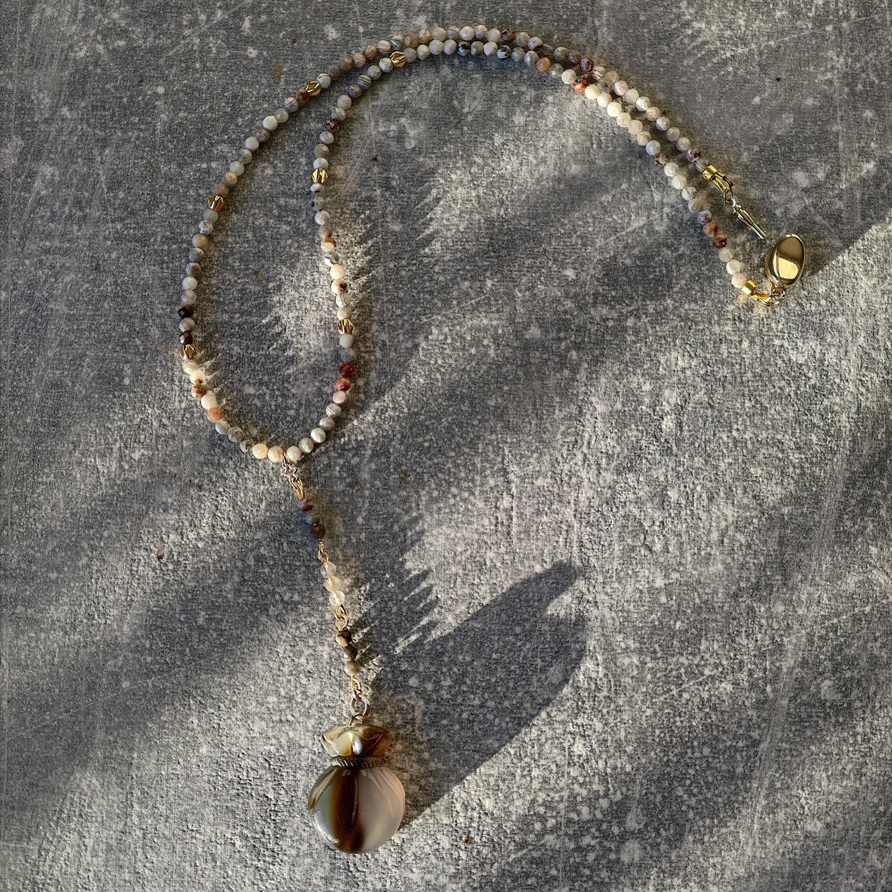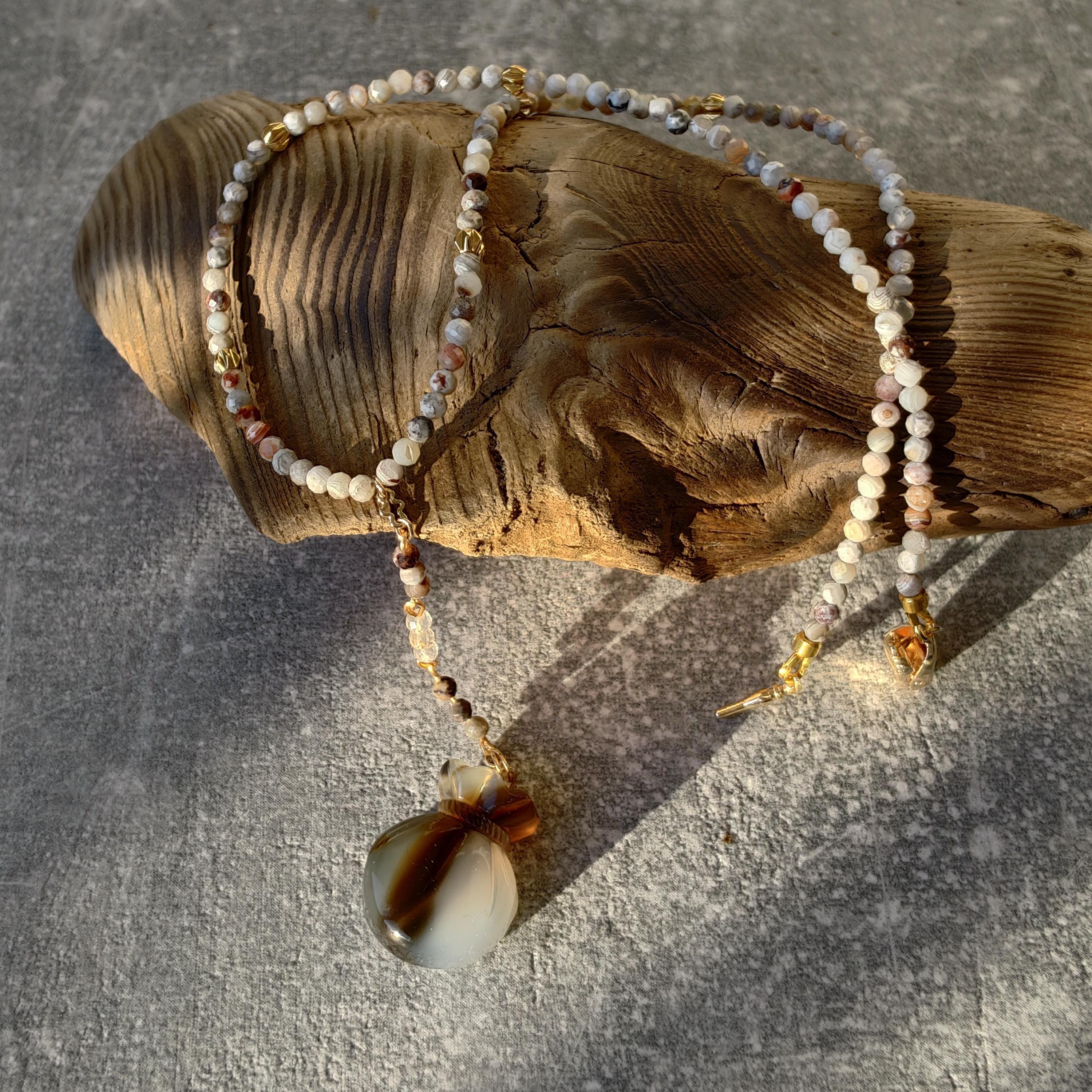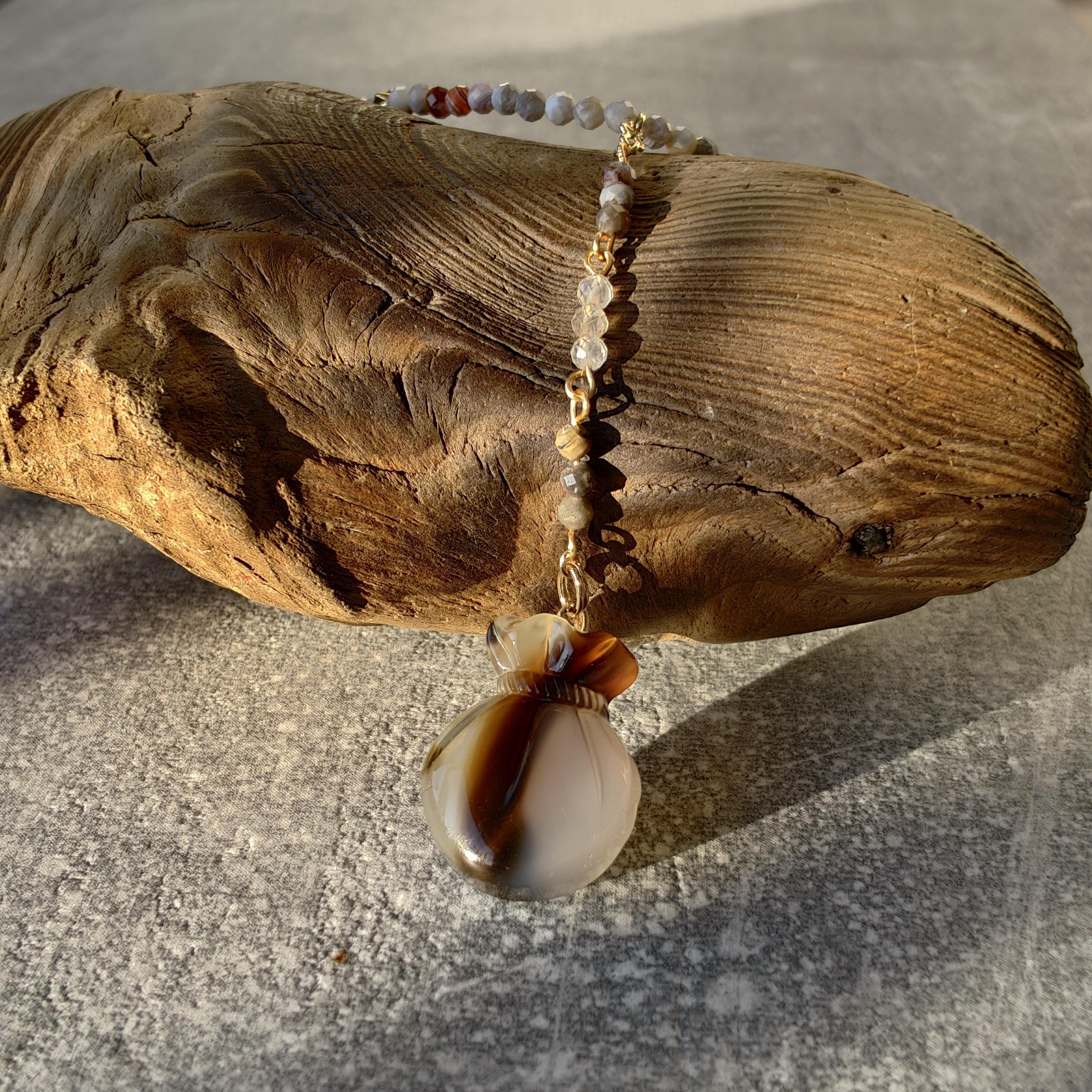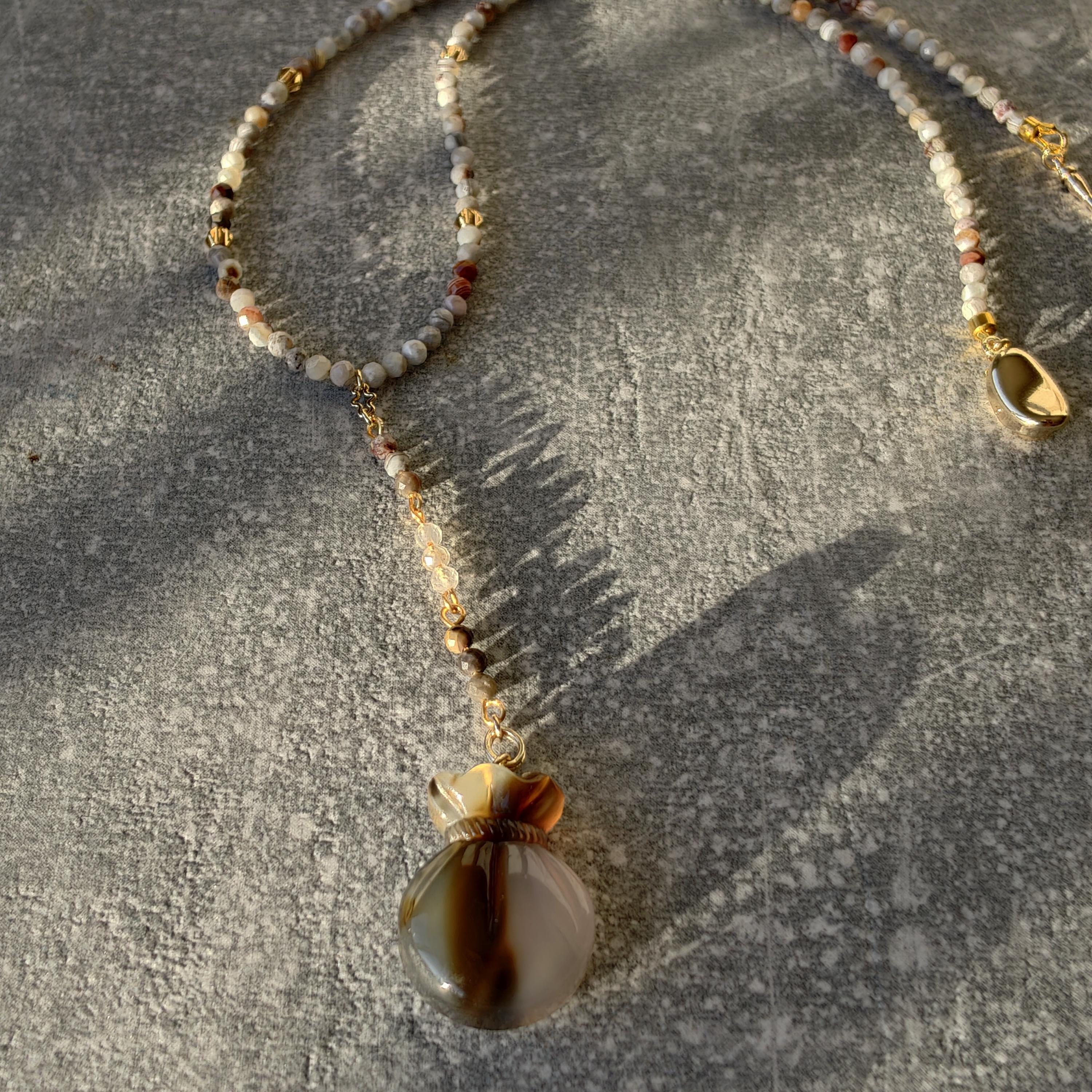 One-of-a-kind handmade necklace — This design will not be repeated. This agate necklace features tiny faceted agate beads and a carved agate pendant shaped like a money bag, creating a warm earthy look with a symbolic touch of abundance. Agate is associated with grounding, balance, protection, and inner stability.